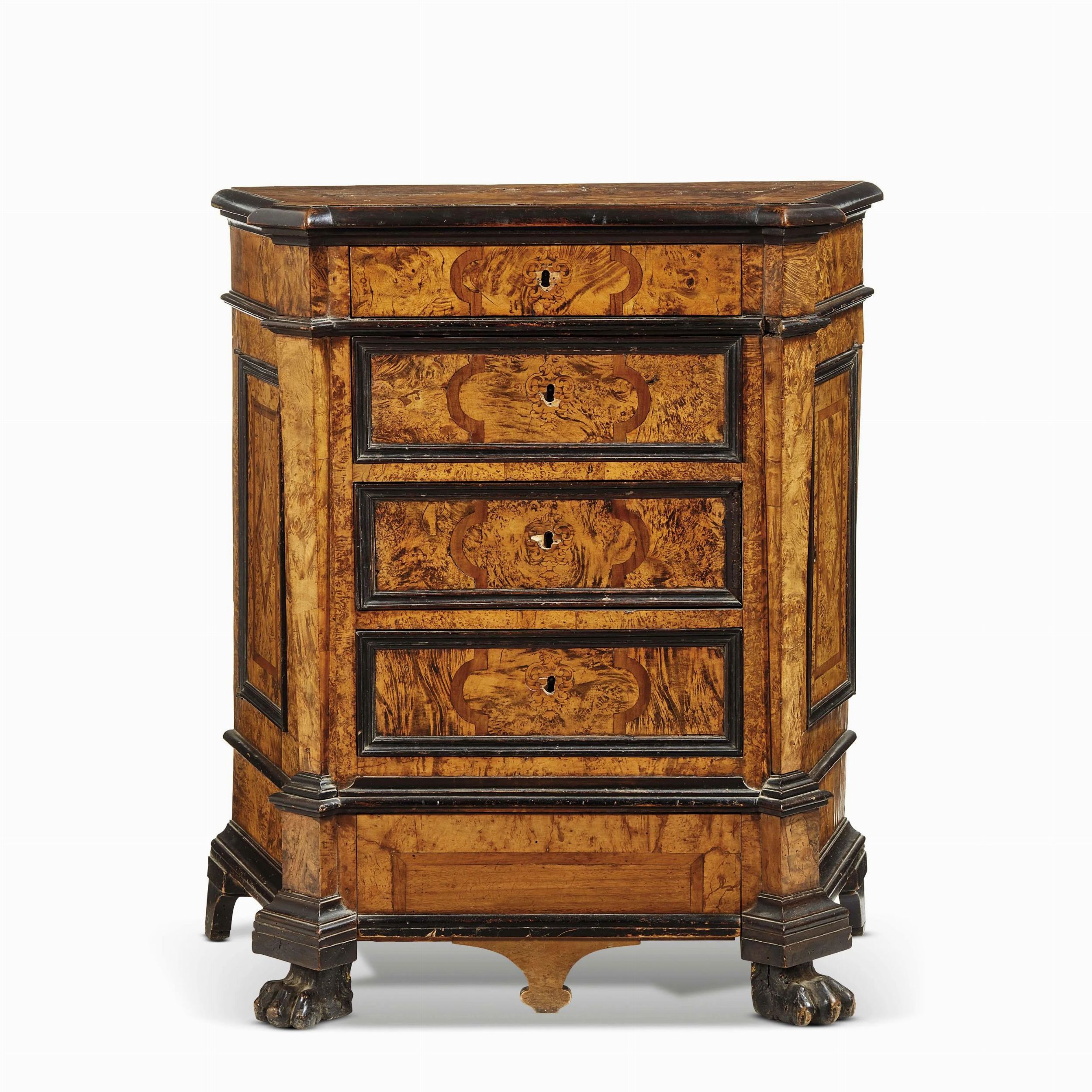 lastronato in varie essenze, presenta profilature in legno ebanizzato, quattro cassetti sul fronte, due sportelli sui fianchi, base poggiante su zampe ferine anteriori e pendaglina centrale, cm 98x85x46