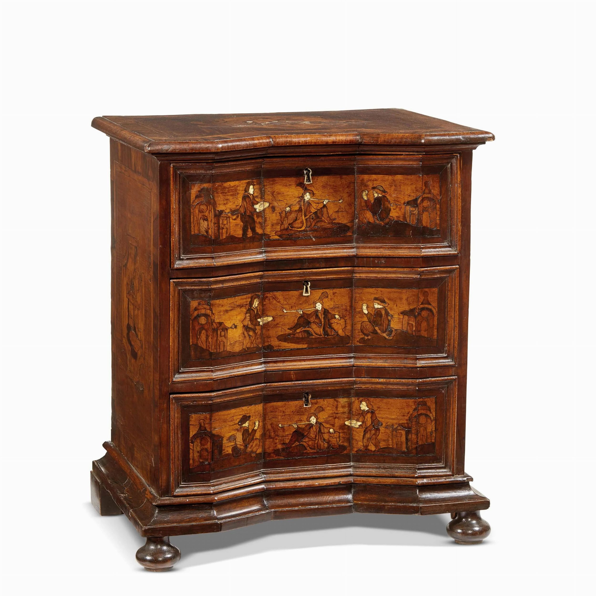 CASSETTONCINO, VENETO, INIZI SECOLO XVIII lastronato in radica e intarsiato in osso, fronte di linea spezzata rientrante centralmente, piano intarsiato con tre figure entro cartella centrale, sul fronte tre cassetti intervallati da profilature ebanizzate e decorati con intarsi a figure, piedi anteriori a sfera schiacciata, cm 80x71x51