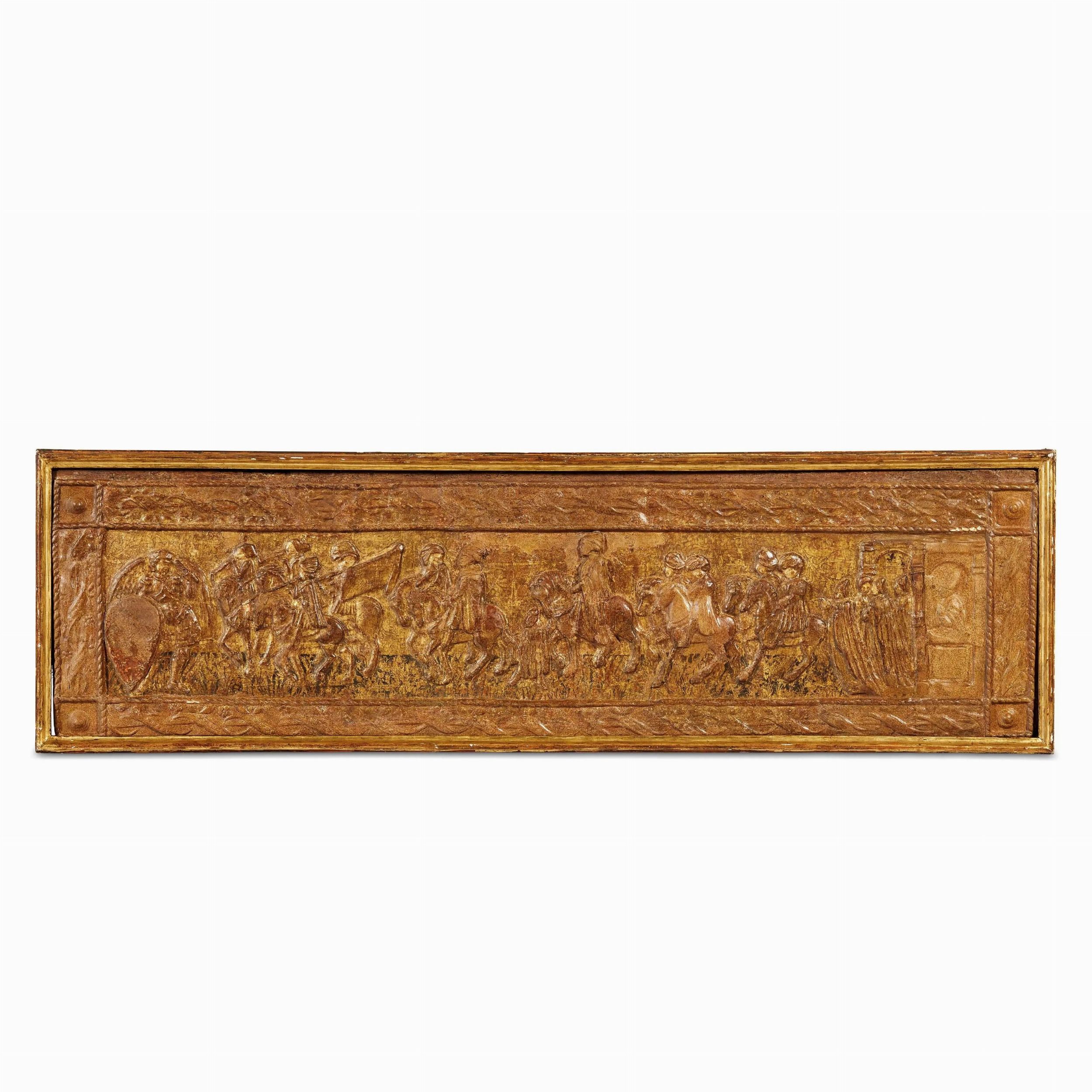 FRONTE DI CASSONE, VENEZIA, FINE SECOLO XV in legno intagliato e pastiglia dorati di forma rettangolare con fondo lavorato a bulino con motivo floreale, raffigura scena processionale incorniciata da fascia a nastrino a racchiudere nastro intrecciato, fiori e intagli geometrici, cm 46x160; montato entro cornice modanata in legno dorato, cm 50x166 complessivamente