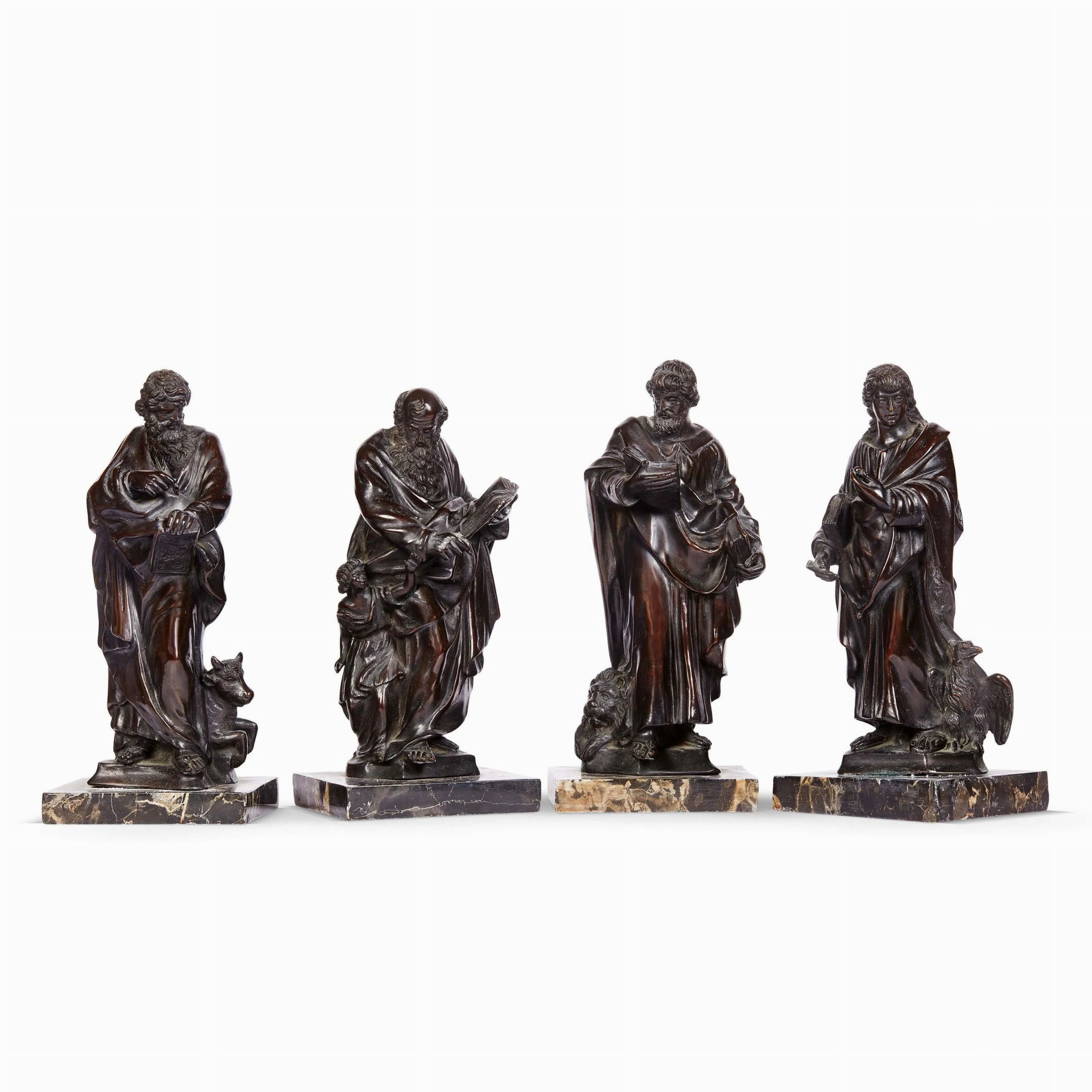 QUATTRO FIGURE, BOTTEGA DI JACOB CORNELISZ COBAERT, ROMA, SECOLO XVII in bronzo patinato su basi quadrate in marmo raffiguranti i Quattro Evangelisti , secondo il modello riconosciuto da Jennifer Montagu nelle statue di Jacob Cornelisz Cobaert (Fiandre 1630 circa – Roma 1615) poste ad ornamento dell’altare eseguito fra il 1587 e il 1582 per la cappella del cardinale Mathieu Cointrel nella chiesa romana di San Luigi dei Francesi. Queste figure in bronzo erano spesso destinate all’ornamento di stipi o arredi liturgici, come ad esempio ben testimoniato dall’altarolo a lui attribuito con sculture in bronzo dorato, oggi conservato presso la Sala Altoviti di Palazzo Venezia a Roma; alt. da cm 25,8 a cm 24,2 (le figure), su basi cm 2x12,5x11 THE FOUR EVANGELISTS, WORKSHOP OF JACOB CORNELISZ COBAERT, ROME, 17TH CENTURY Provenienza Florence Taccani, Milano (dichiarazione del 23/12/1983); Collezione privata Bibliografia di confronto P. Cannata , Museo Nazionale del Palazzo di Venezia. Sculture in bronzo , Roma 2011, pp. 140-150