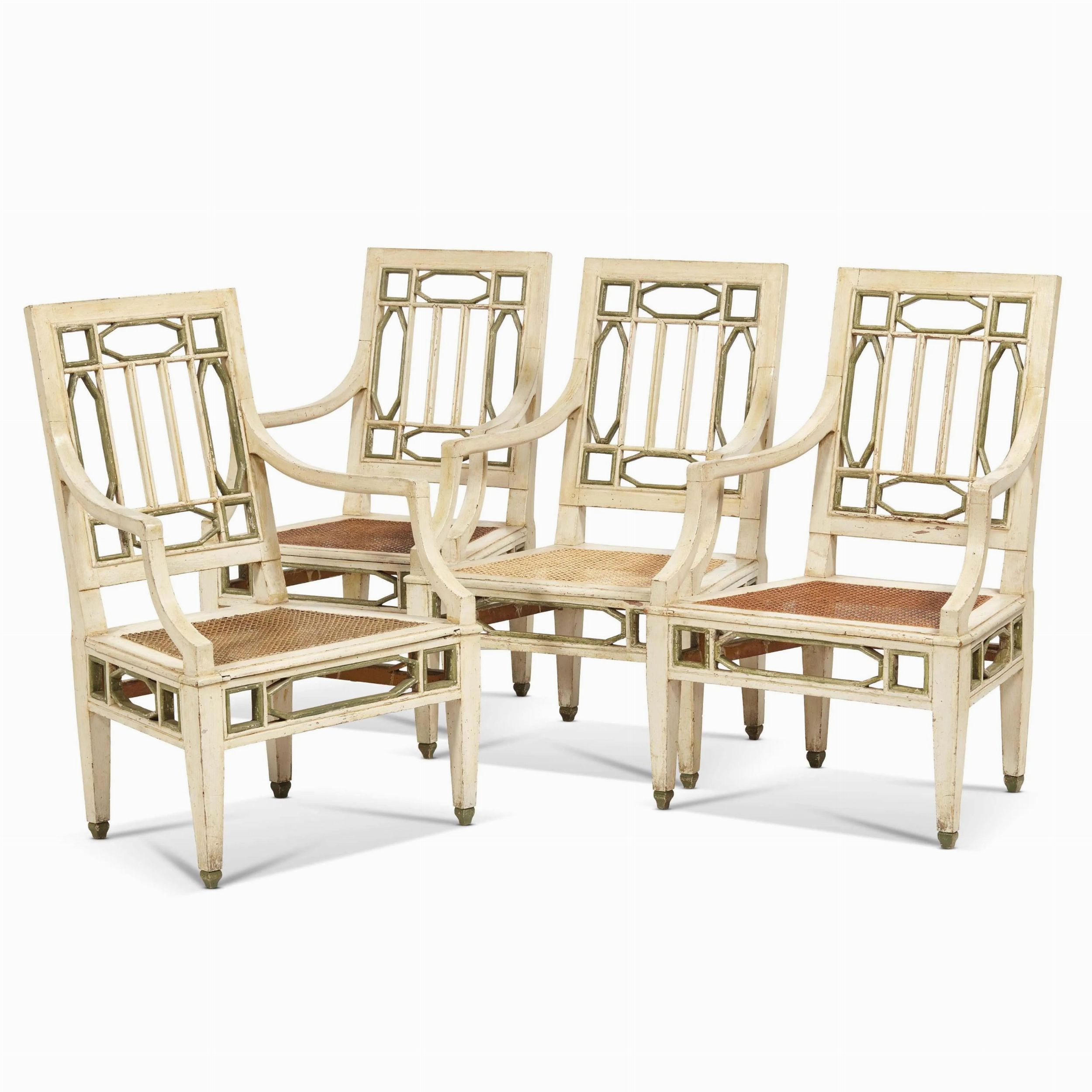 QUATTRO POLTRONE, GENOVA, SECOLO XVIII in legno intagliato e laccato, con schienale di linea dritta lavorato a giorno con intagli geometrici di colore verde e avorio che si ripetono sulla fascia sottostante la seduta, in paglia di Vienna, che scende in braccioli sagomati e gambe troncopiramidali, cm 100x65x54