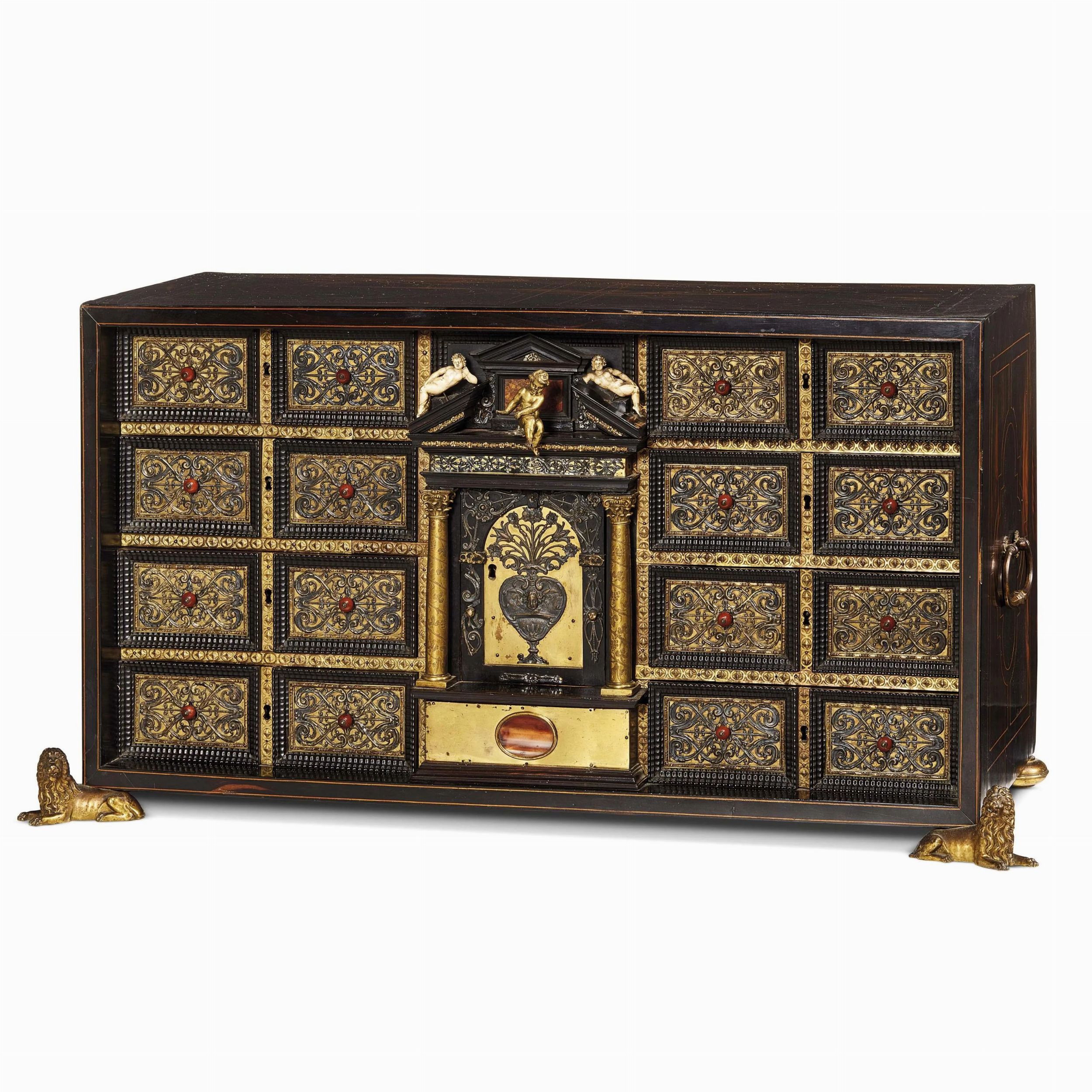 in legno ebanizzato con applicazioni in bronzo dorato, fronte centrato da vano apribile a sportello inquadrato da due colonne a sorreggere timpano su cui giacciono tre figure di putti, affiancato ai lati da una doppia colonna di quattro cassetti ciascuna. L'intera superficie mostra un fitto decoro a rilievo in lamina d'argento a racemi sviluppati su ciascun cassetto intorno ai pomelli; fianchi decorati da filettature geometriche centrati da maniglie in bronzo dorato, poggia anteriormente su elementi angolari in foggia di leone, mentre posteriormente su sfere schiacciate, cm 42x83x35