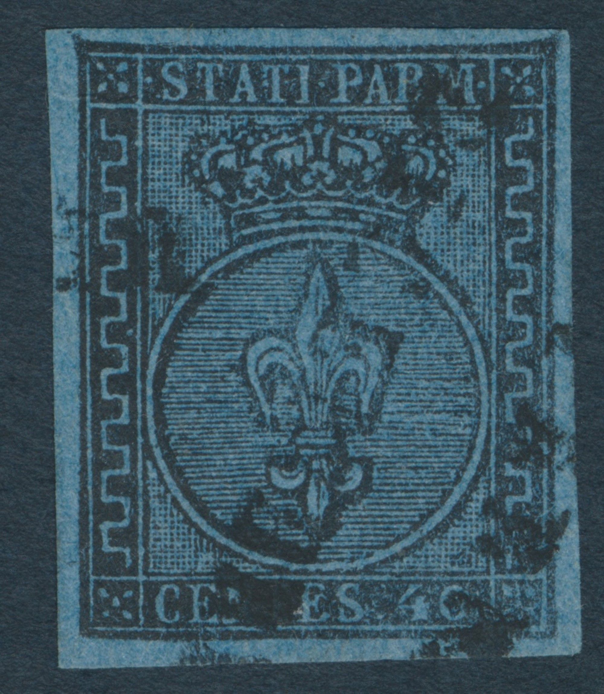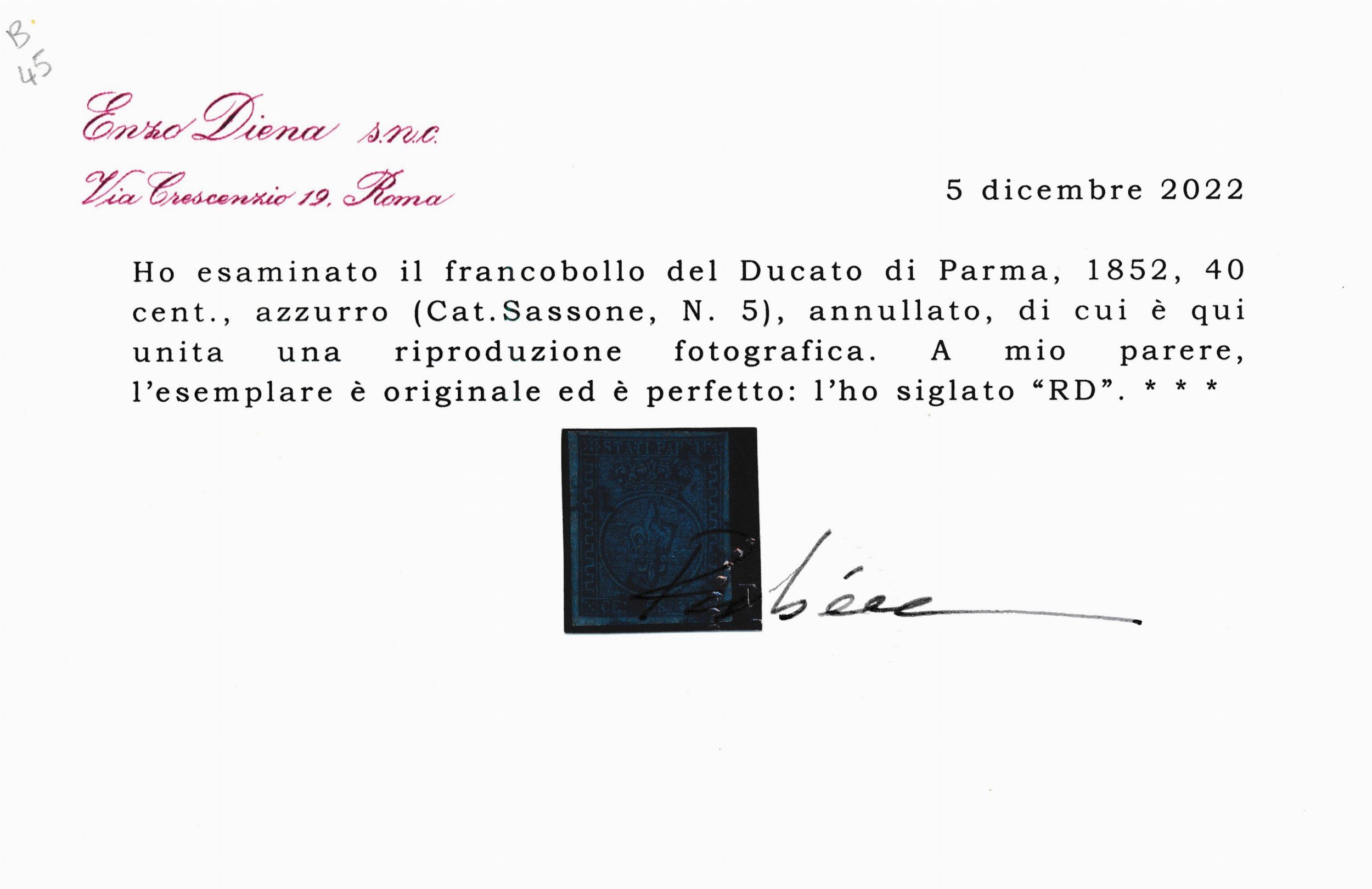 1852 Ducato di Parma 40 cent. azzurro annullato (Sass. 5).