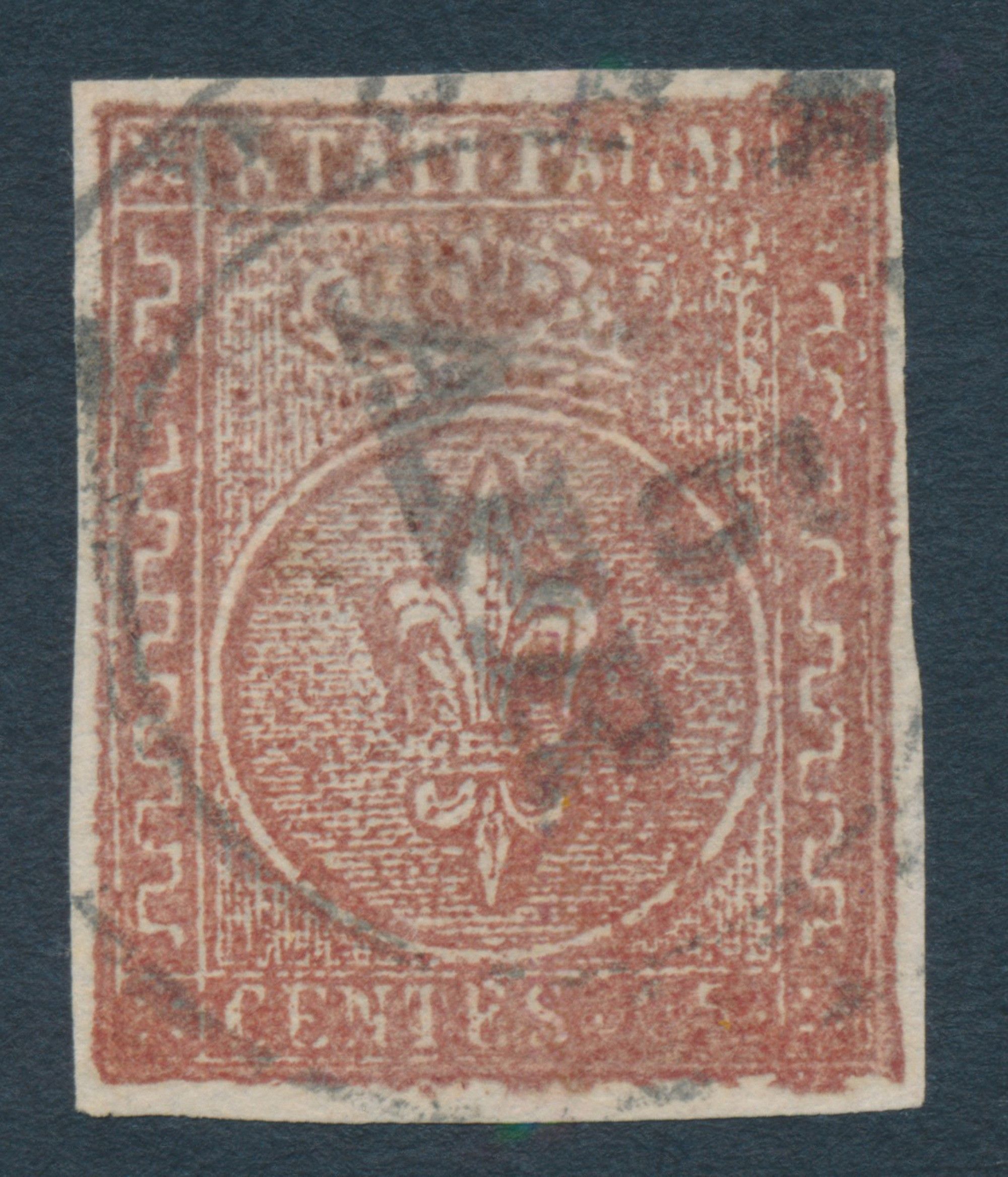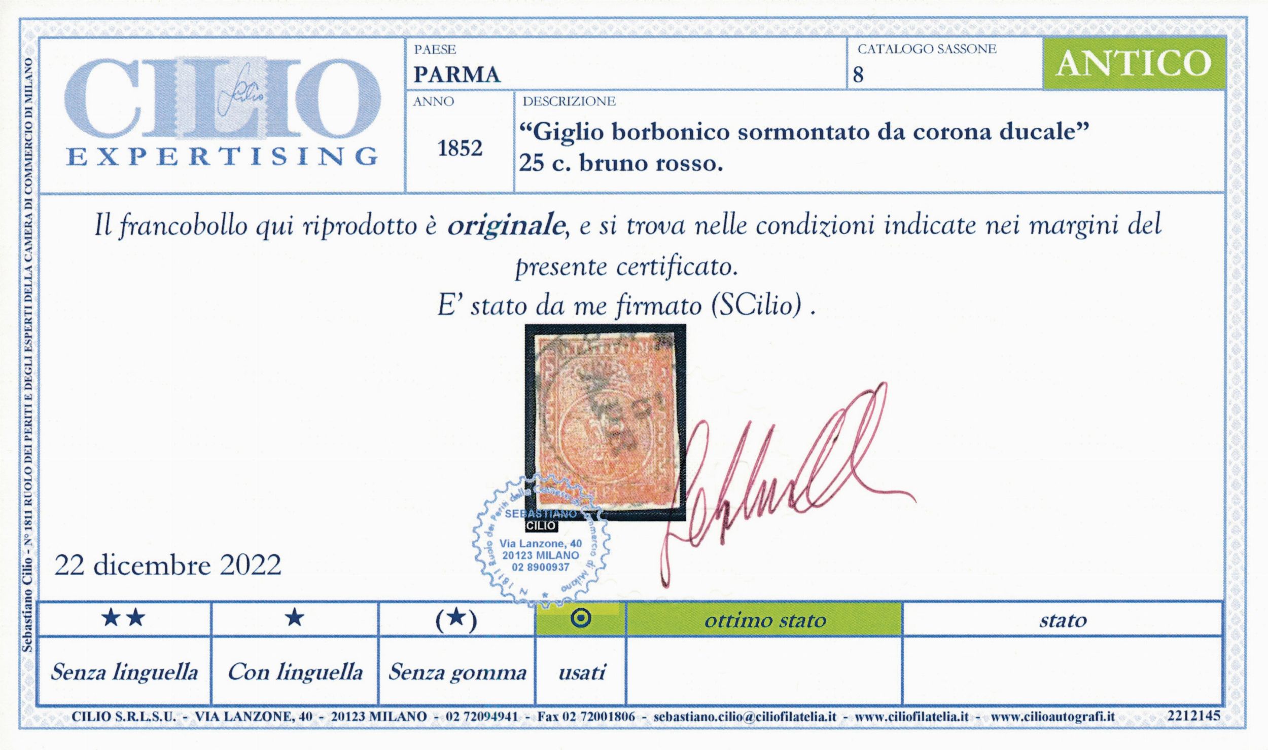 1853-55 Ducato di Parma 25 cent. bruno rosso annullato (Sass. 8).