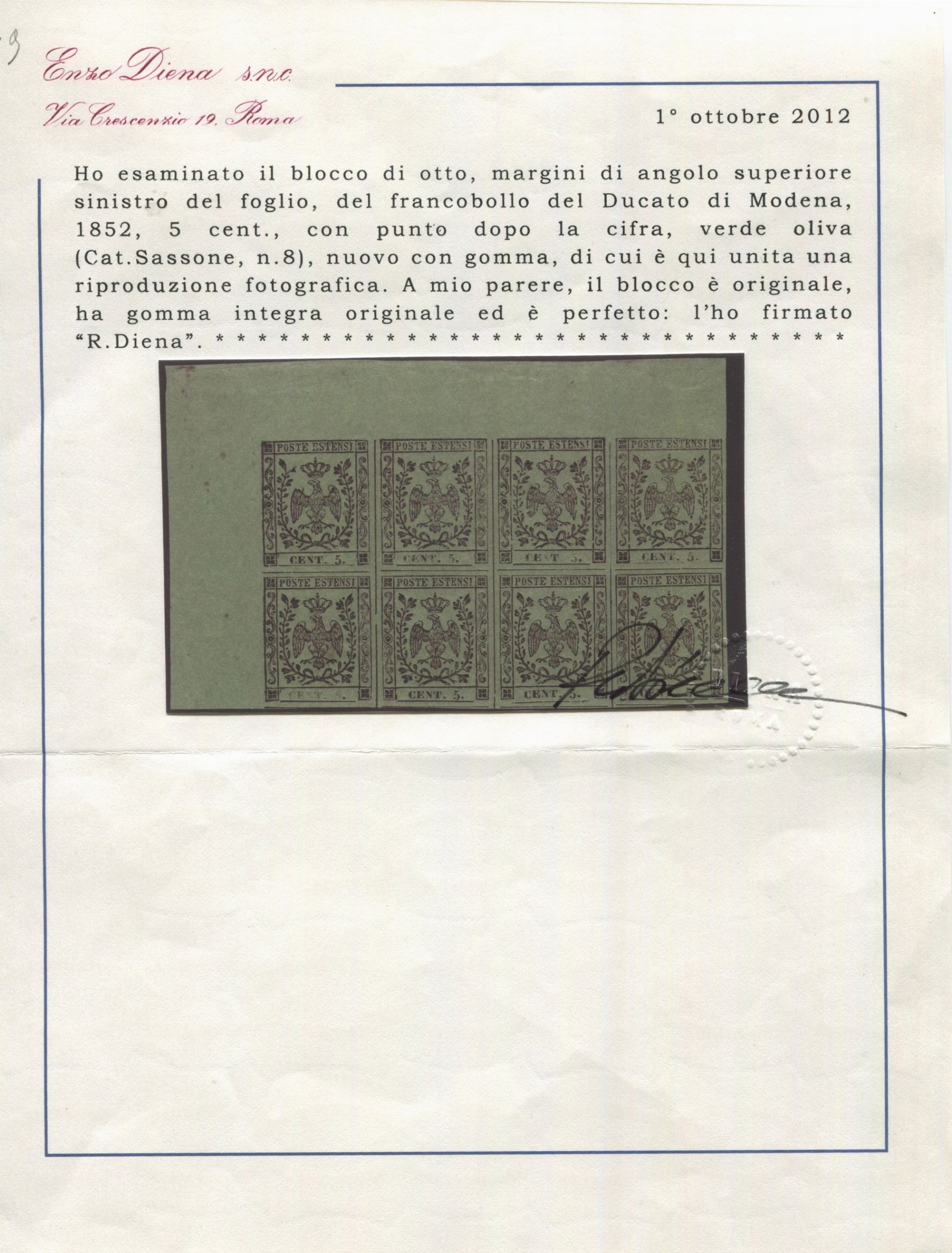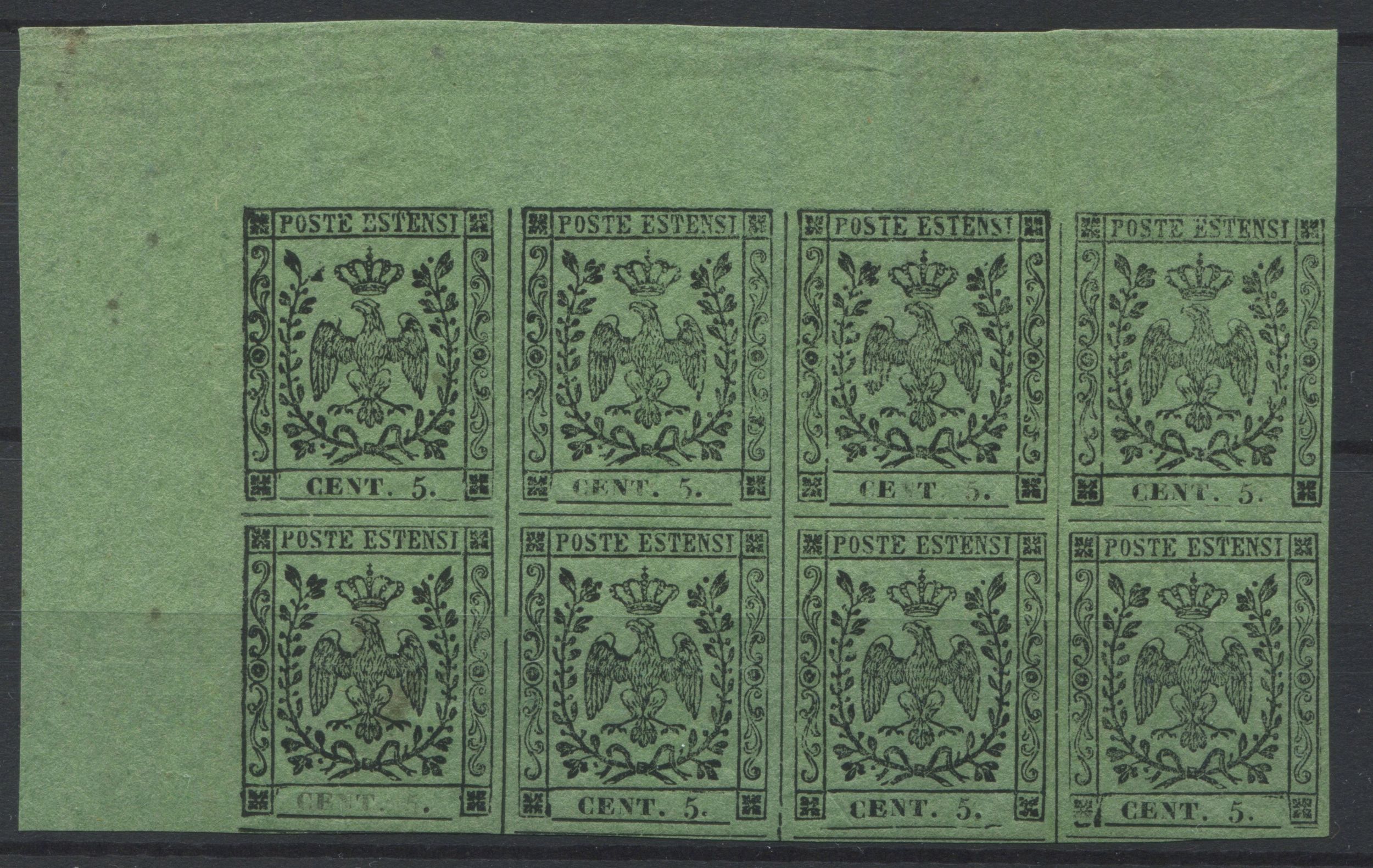1855 - Ducato di Modena - Blocco di otto esemplari, margine di foglio superiore [..]