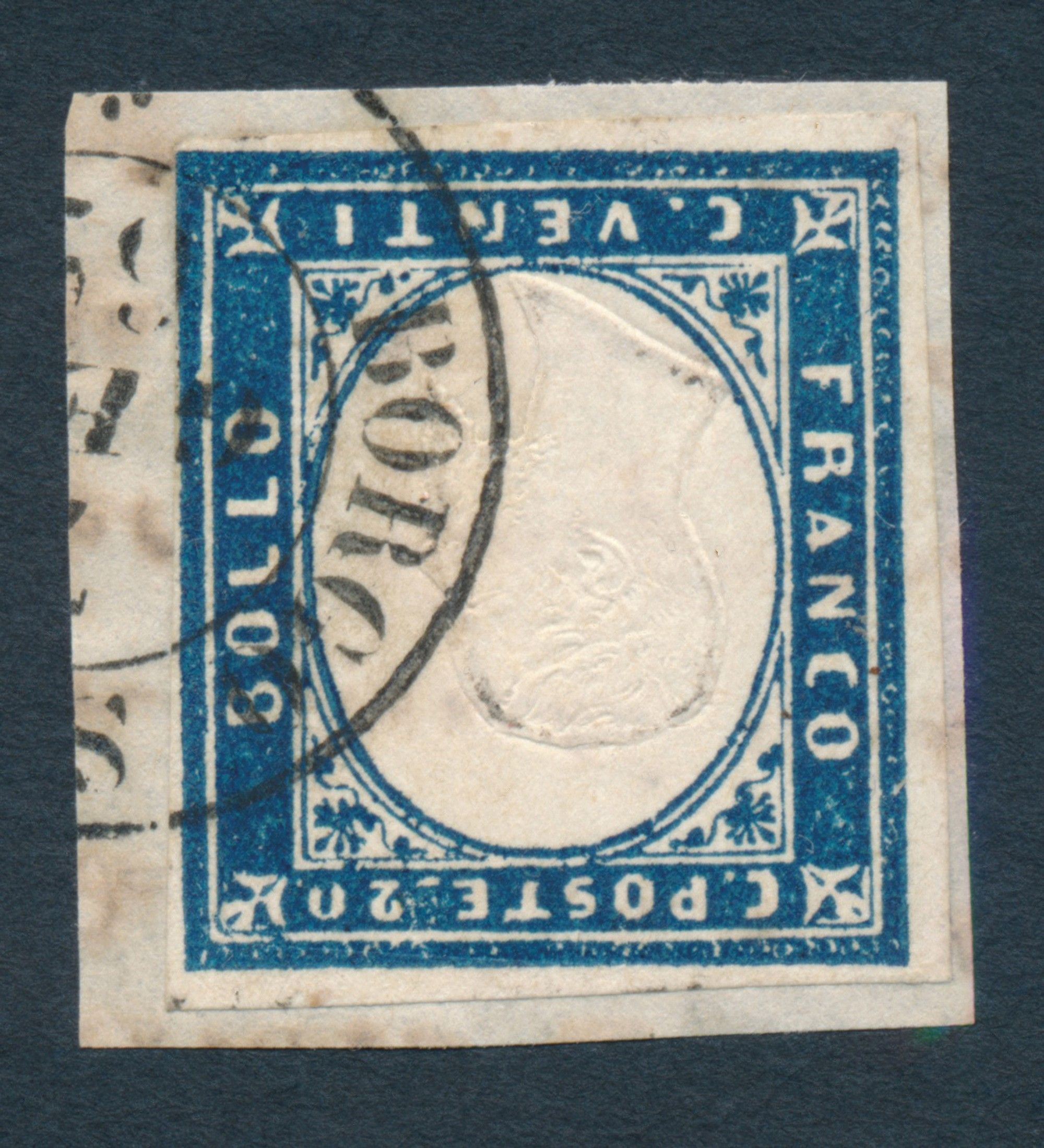 1855 - Sardegna - 20 cent. cobalto oltremare scuro, II tavola, tiratura del 1861 [..]