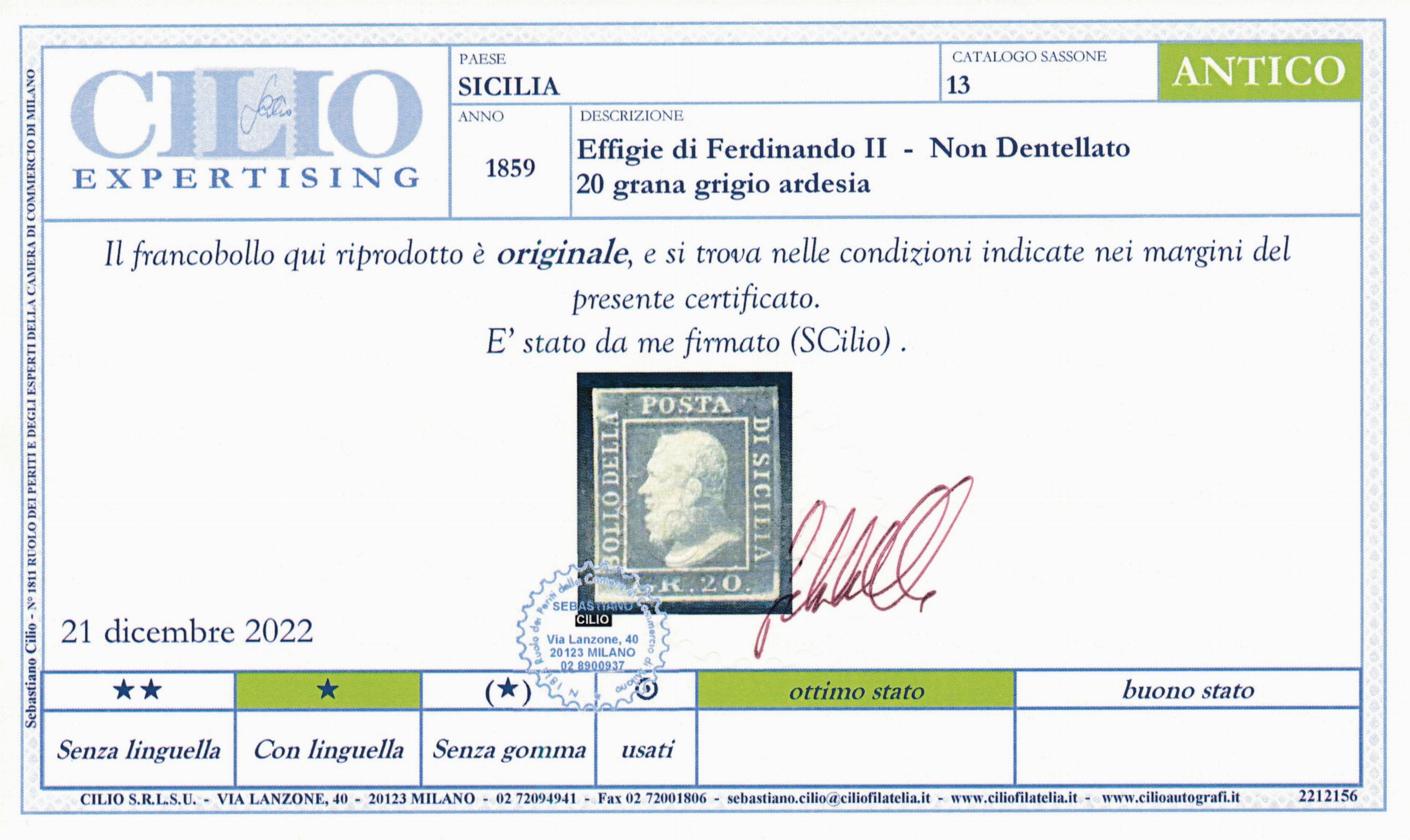 1859 Sicilia 20 grana grigio ardesia nuovo gomma integra (Sass. 13).