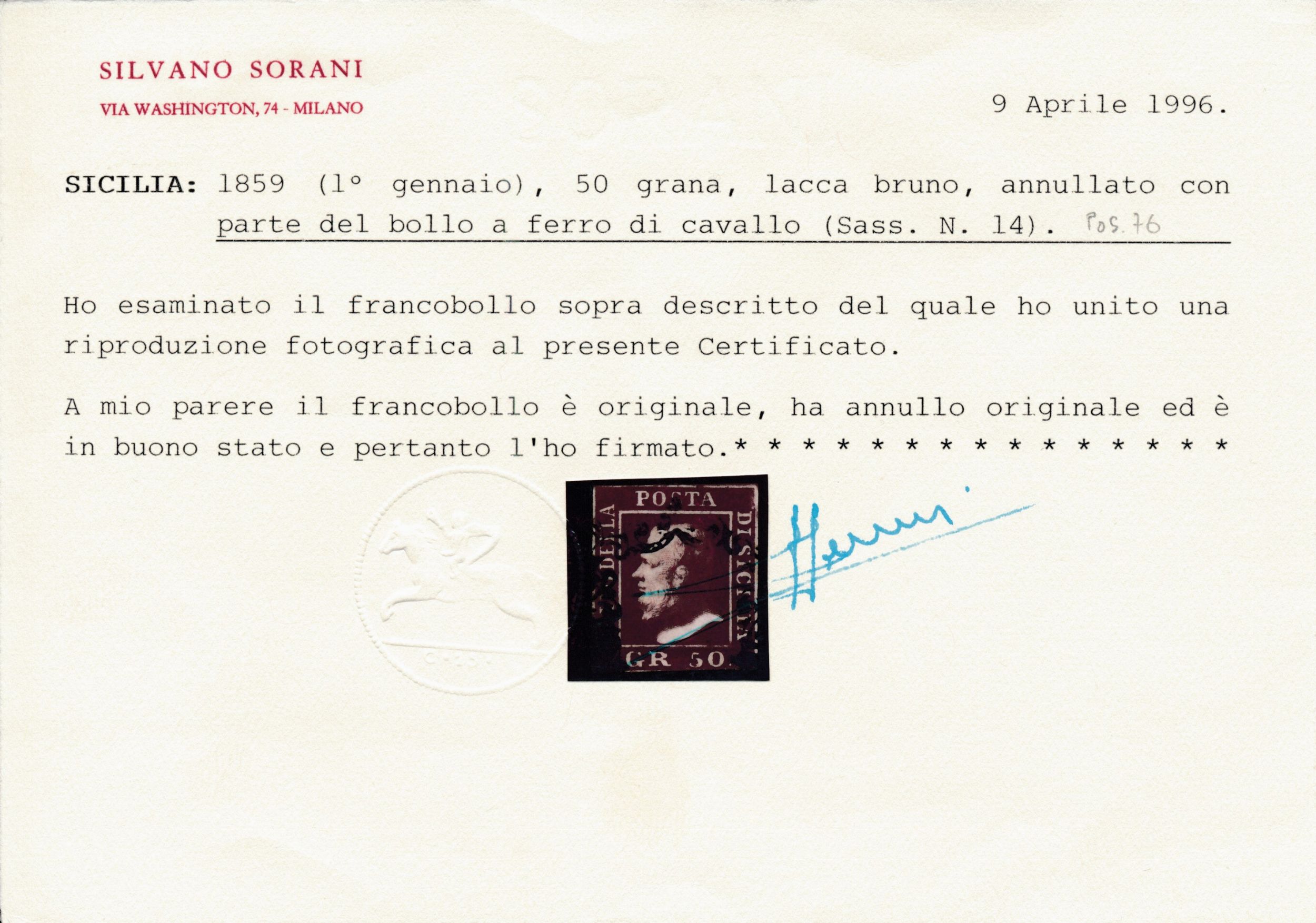 1859 - Sicilia - 50 grana lacca bruno (Sass. 14) annullato con parte di ferro di [..]