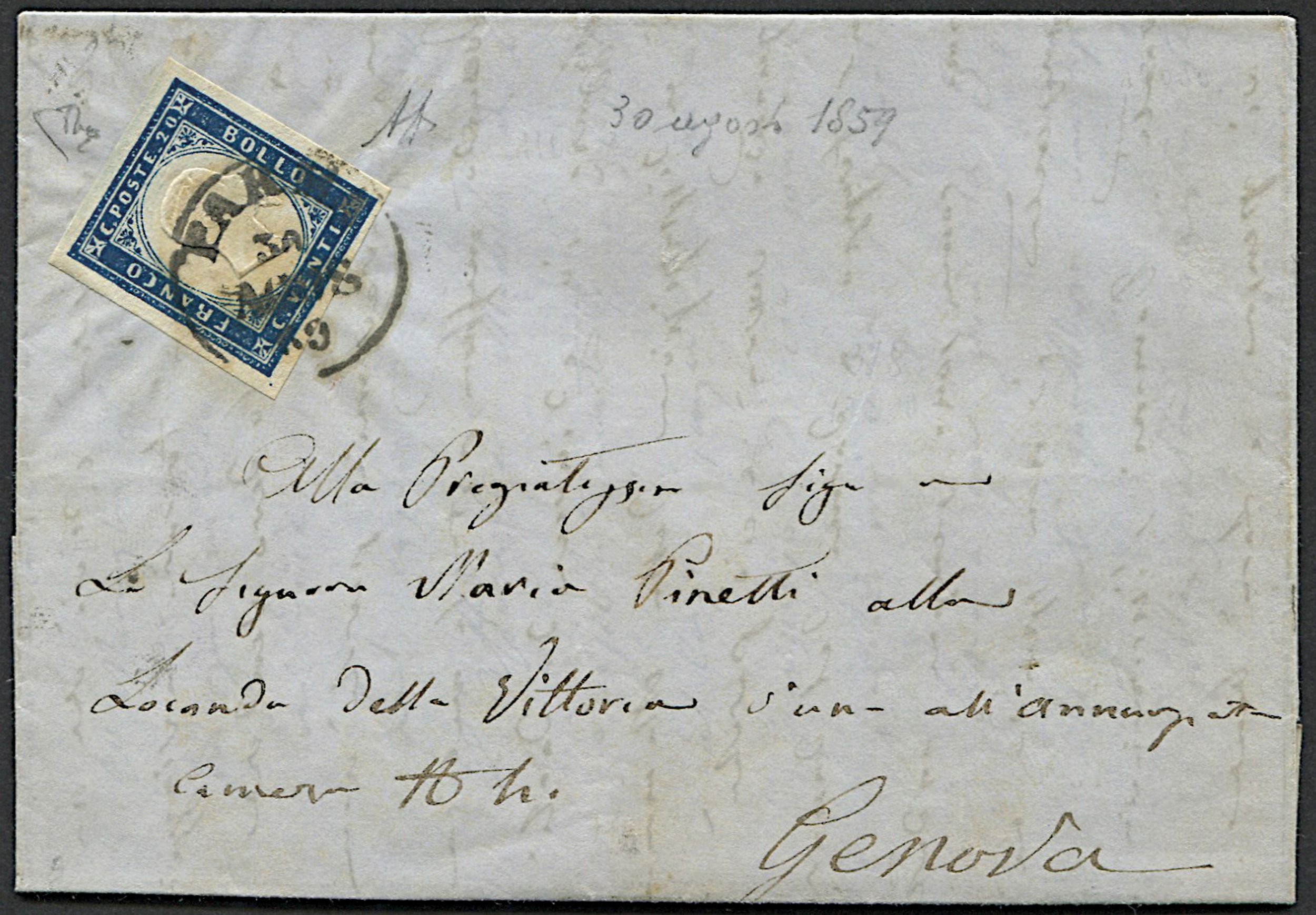 1859, Sardegna, lettera da Parma per Genova del 30 agosto 1859 affrancata in tariffa [..]
