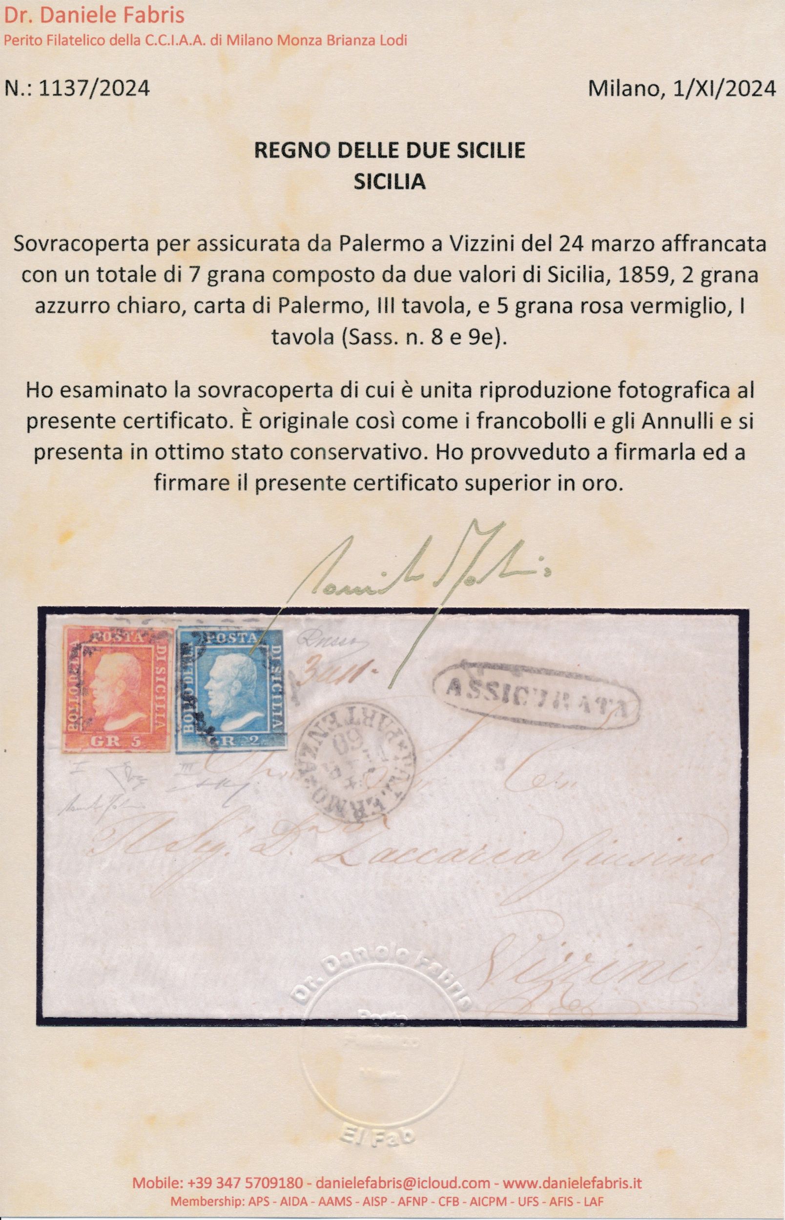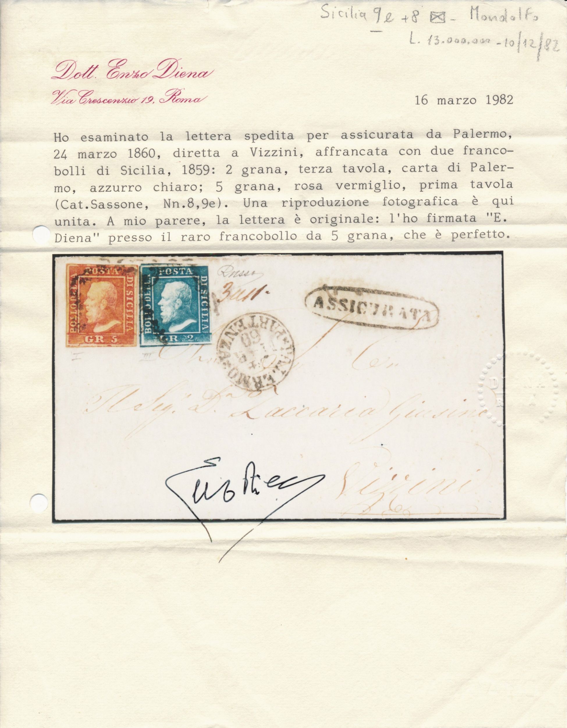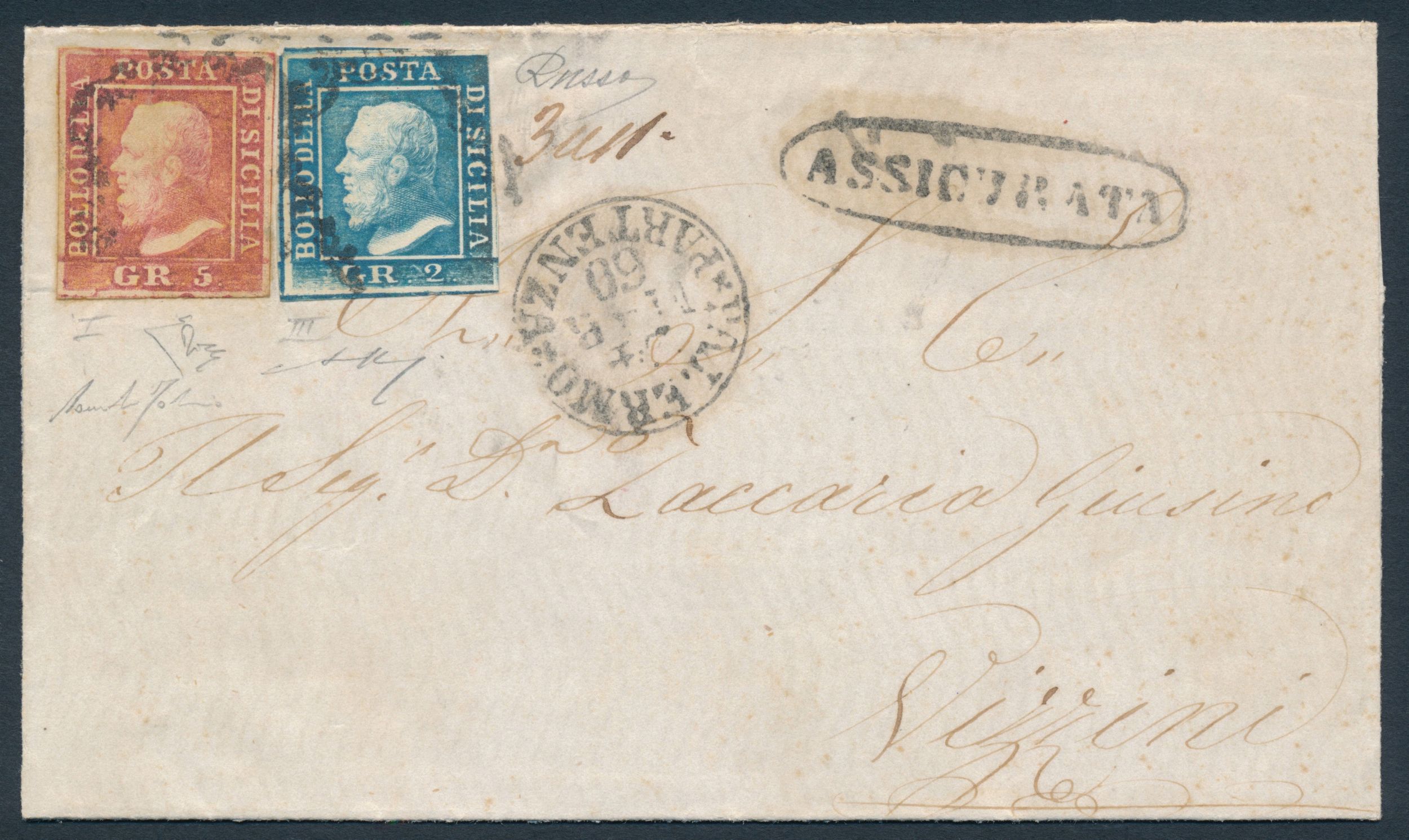 1860 - Sovracoperta per assicurata da Palermo a Vizzini del 24 marzo affrancata [..]