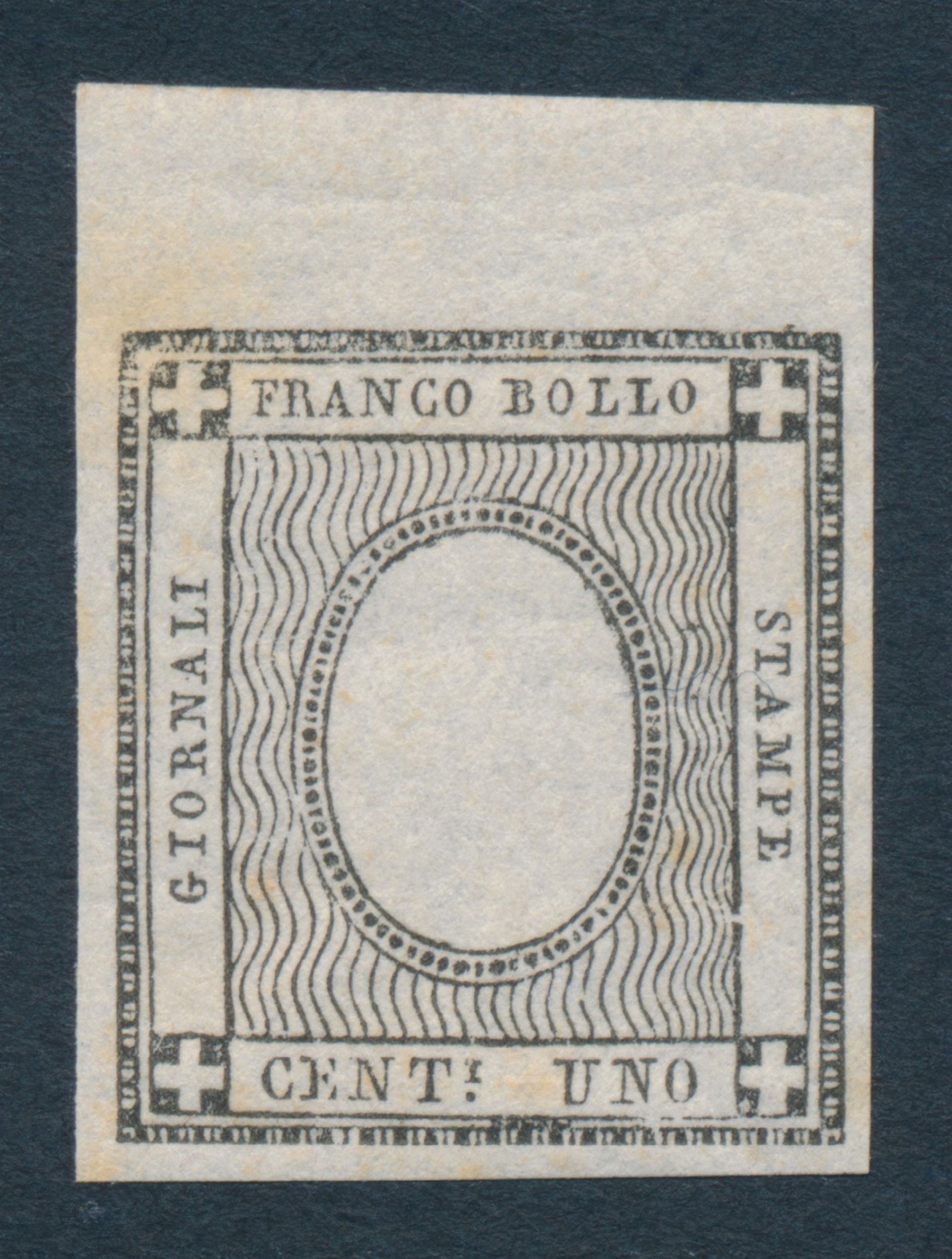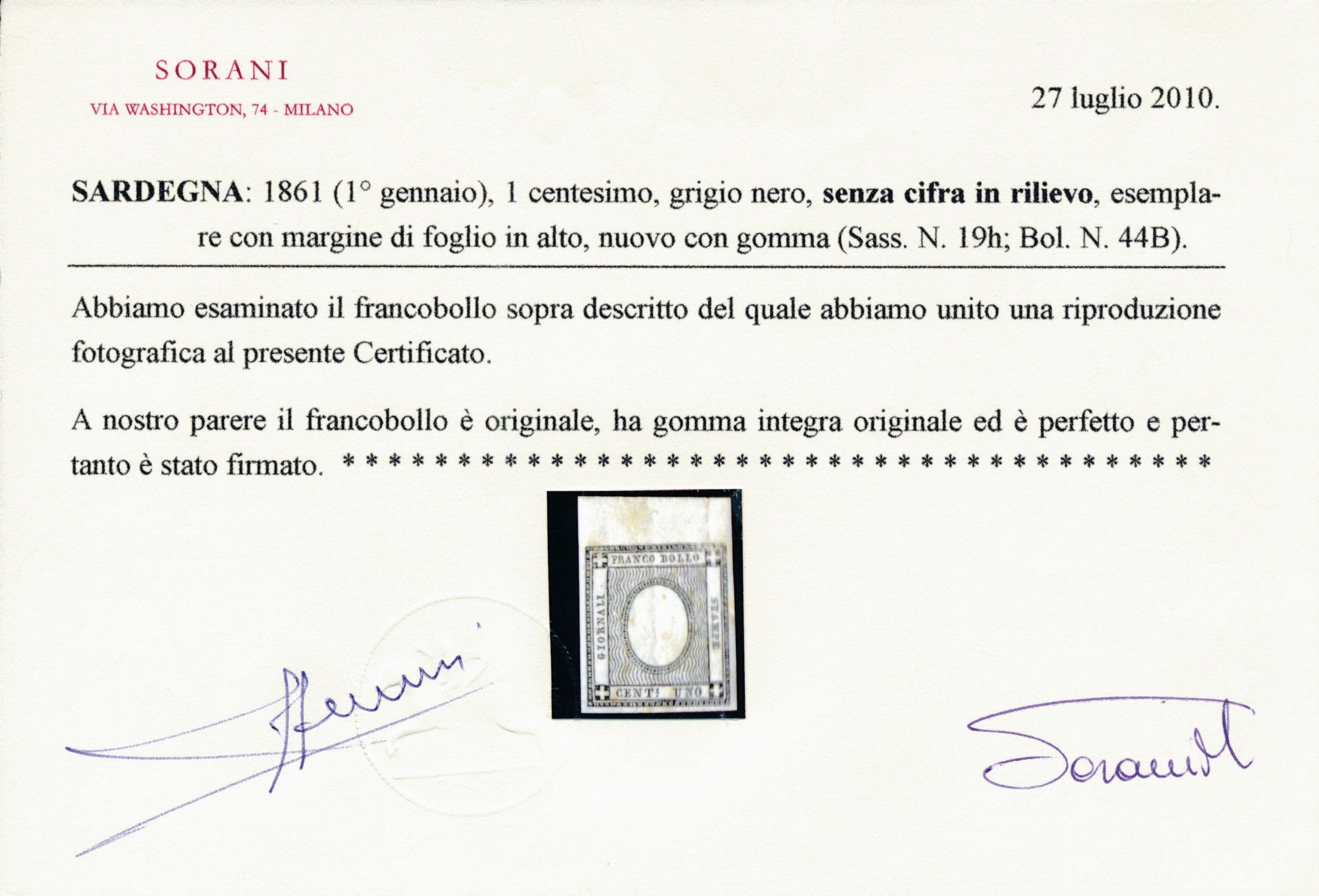 1861 - Sardegna - 1 cent. grigio nero bdf senza cifra in rilievo (Sass. 19h).