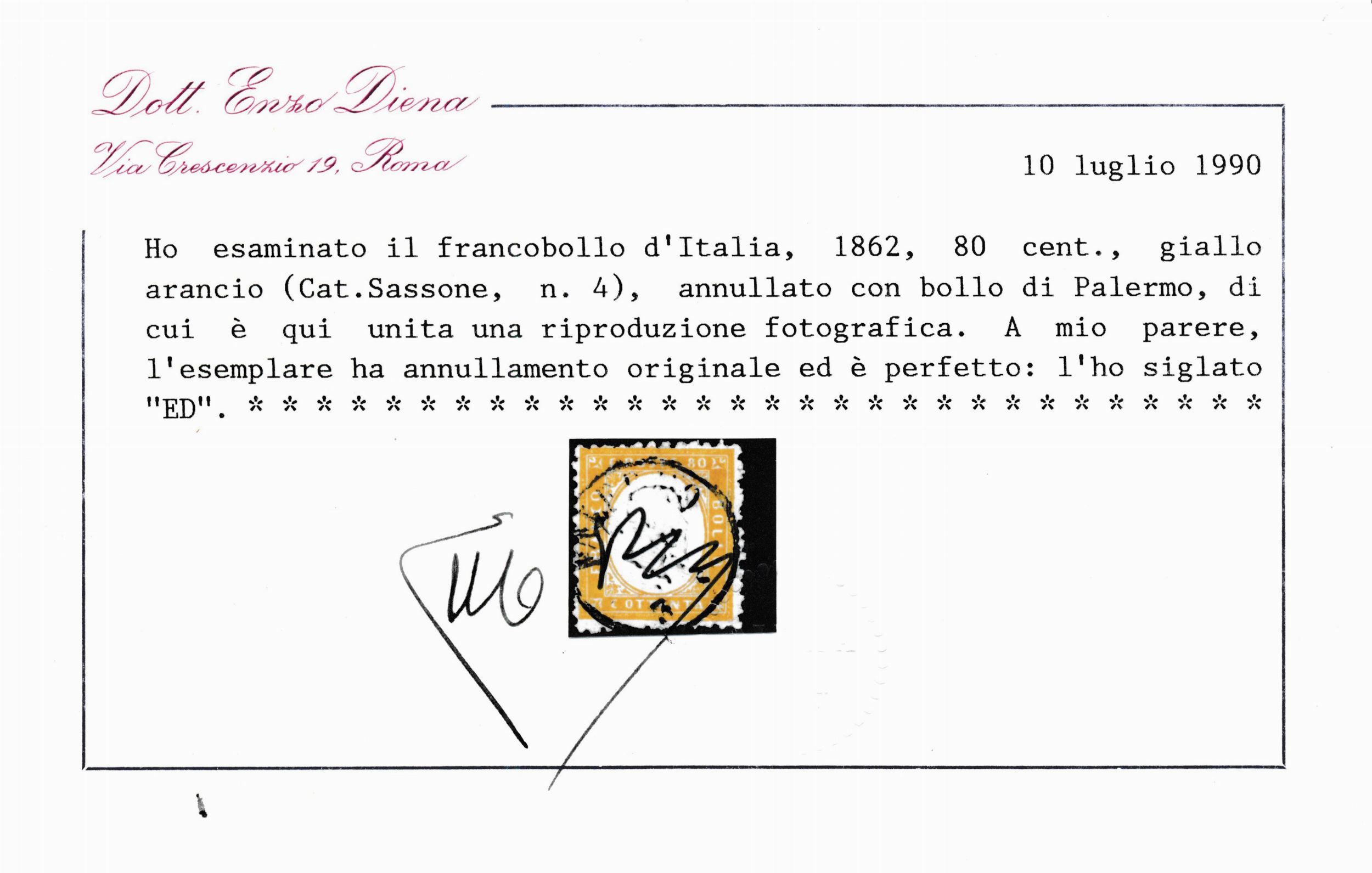 1862 – Regno d’Italia – 80 cent. giallo arancio (Sass. 4) con annullo di Palermo [..]