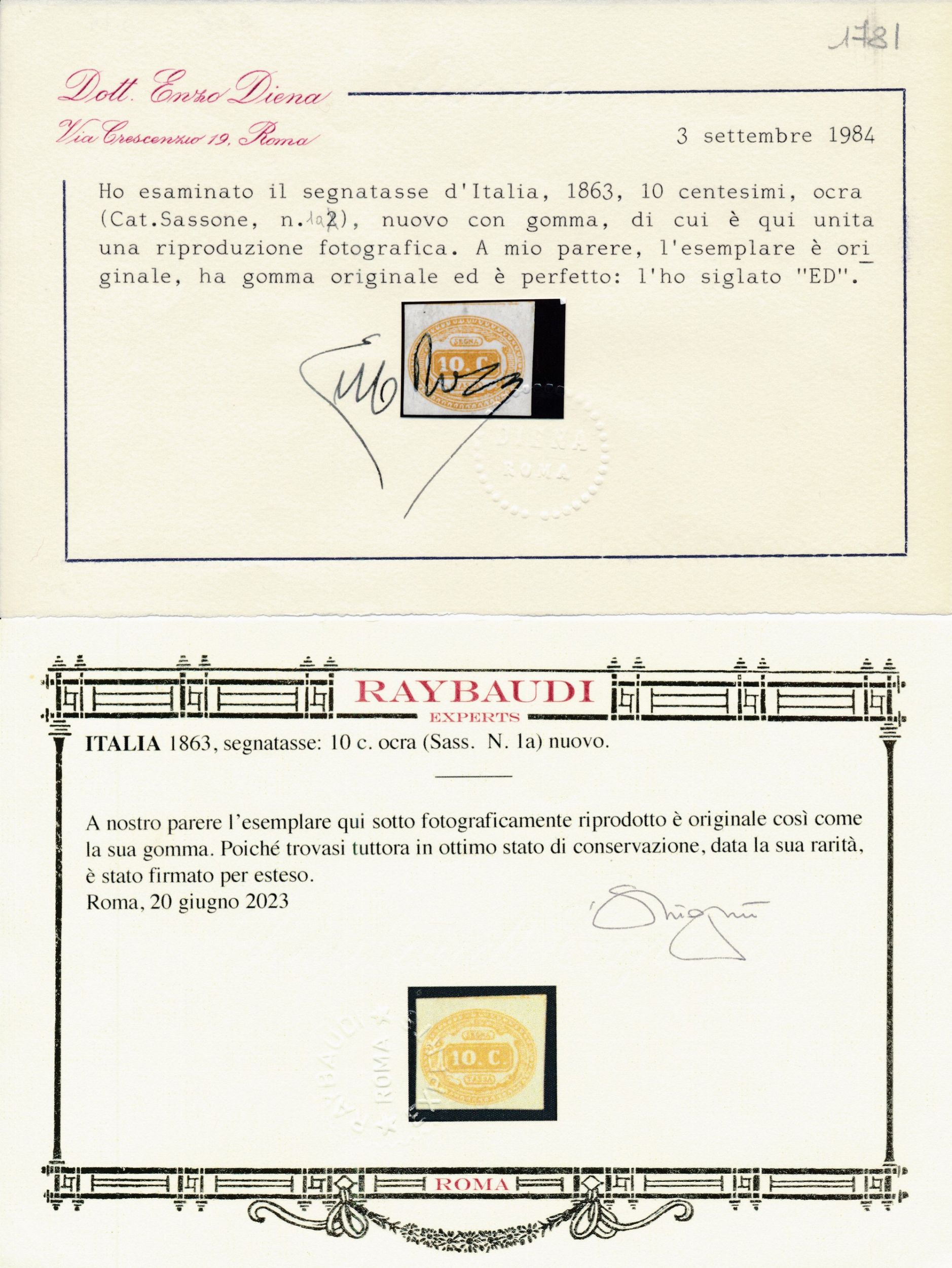 1863 – Regno d’Italia – Segnatasse – Cifra in ovale – 10 cent. ocra (Sass. 1a).