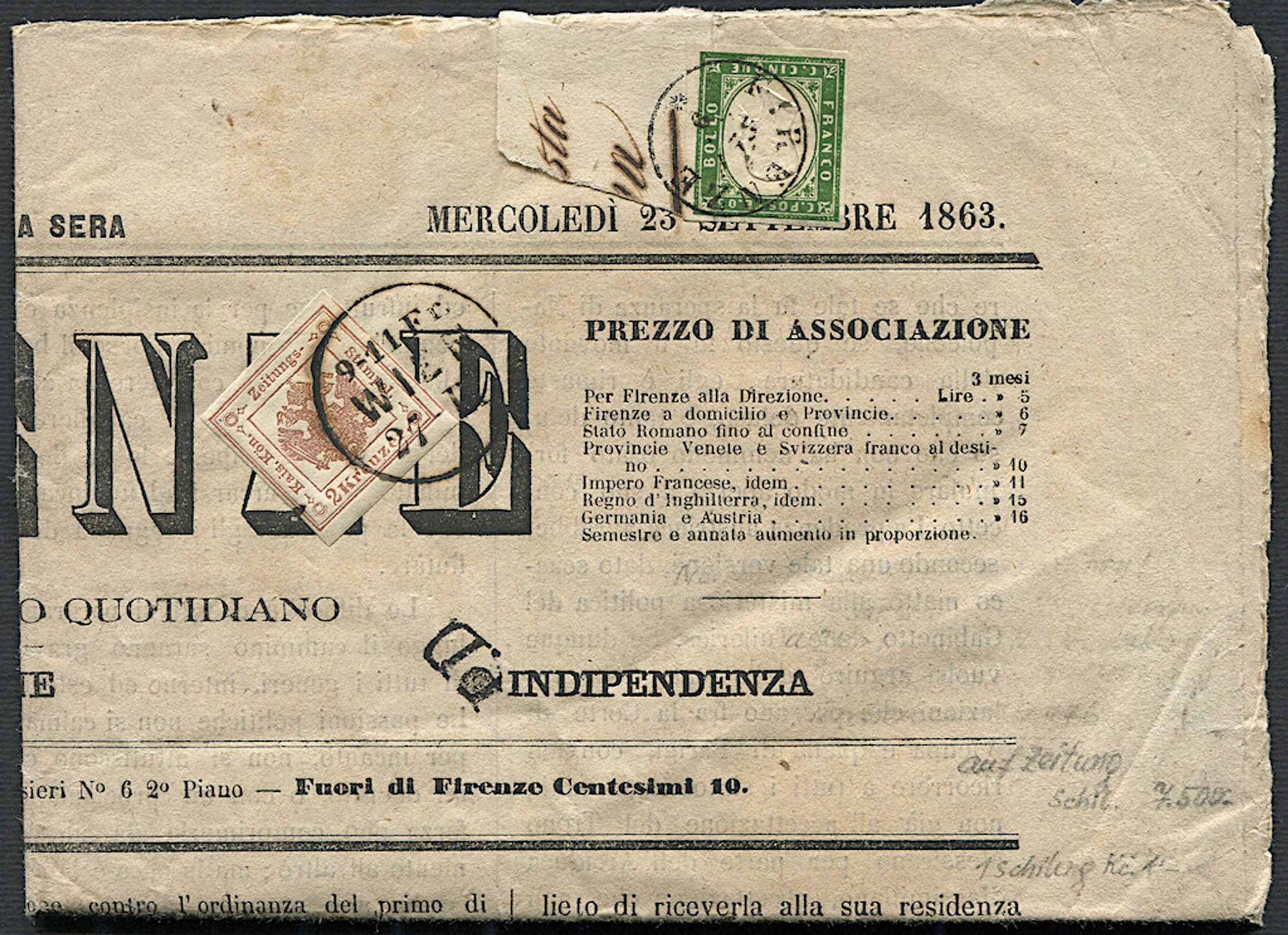 1863, Sardegna, Giornale “Firenze”, completo di quattro pagine