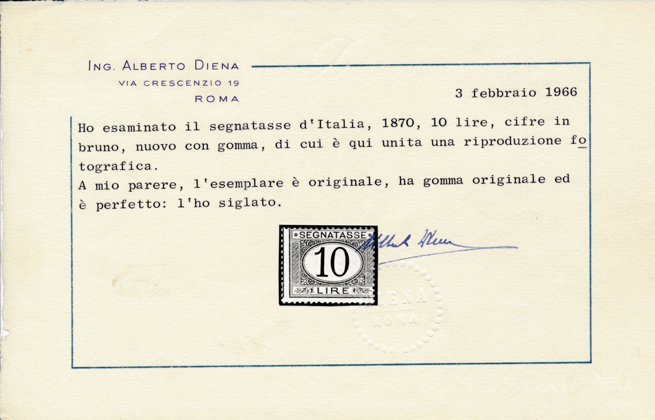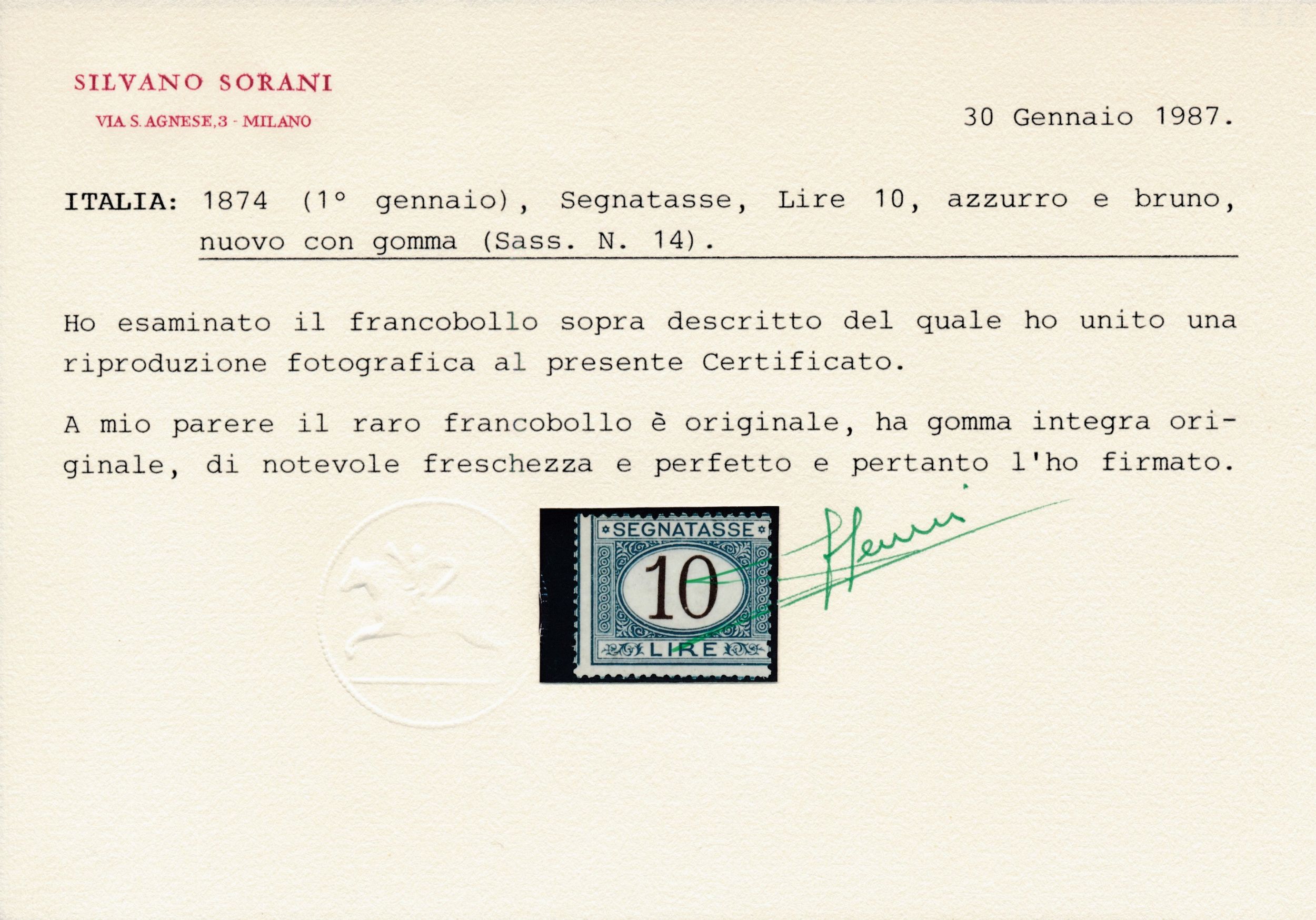 1874 - Regno d’Italia - Segnatasse - 10 lire azzurro e bruno (Sass. 14).