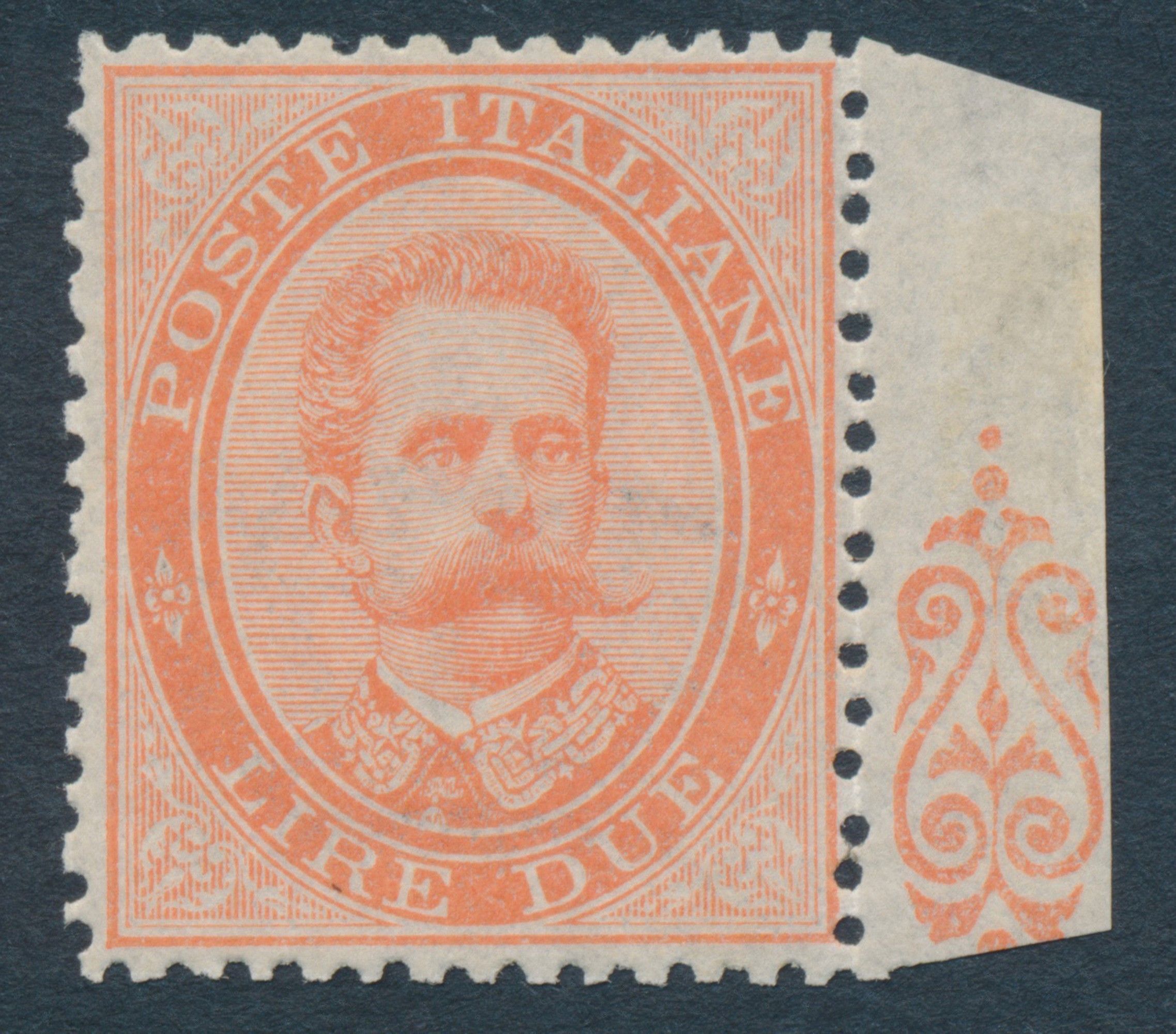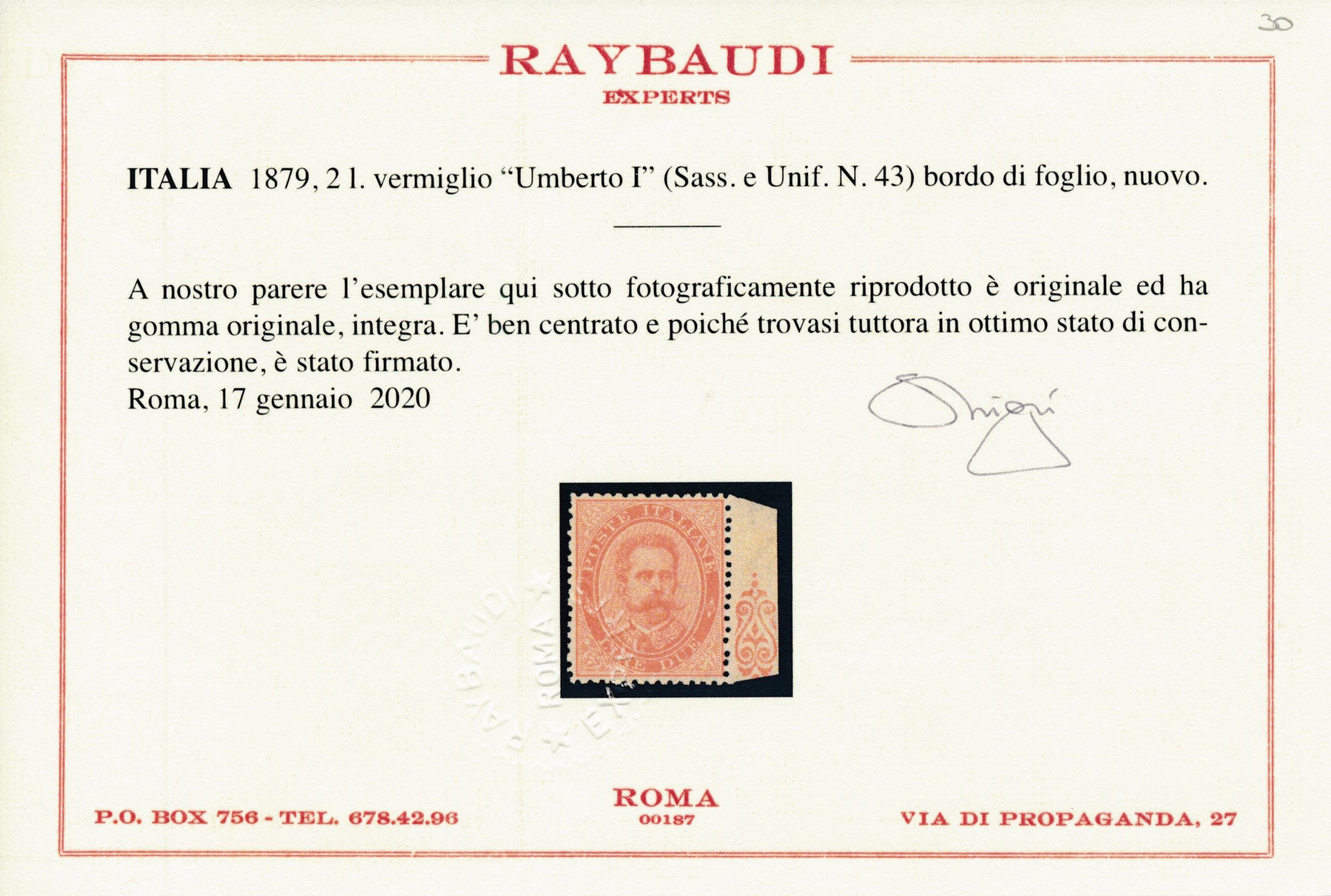 1879 - Regno d’Italia – 2 lire vermiglio “Umberto I”, gomma integra, bdf (Sass. [..]