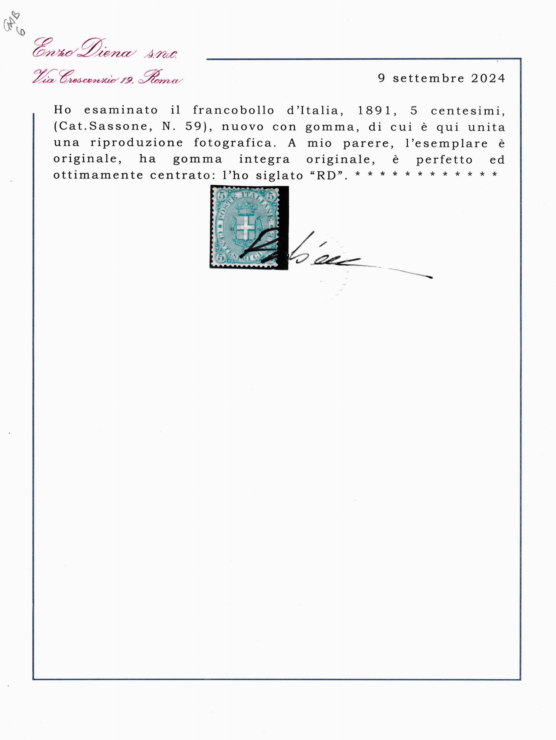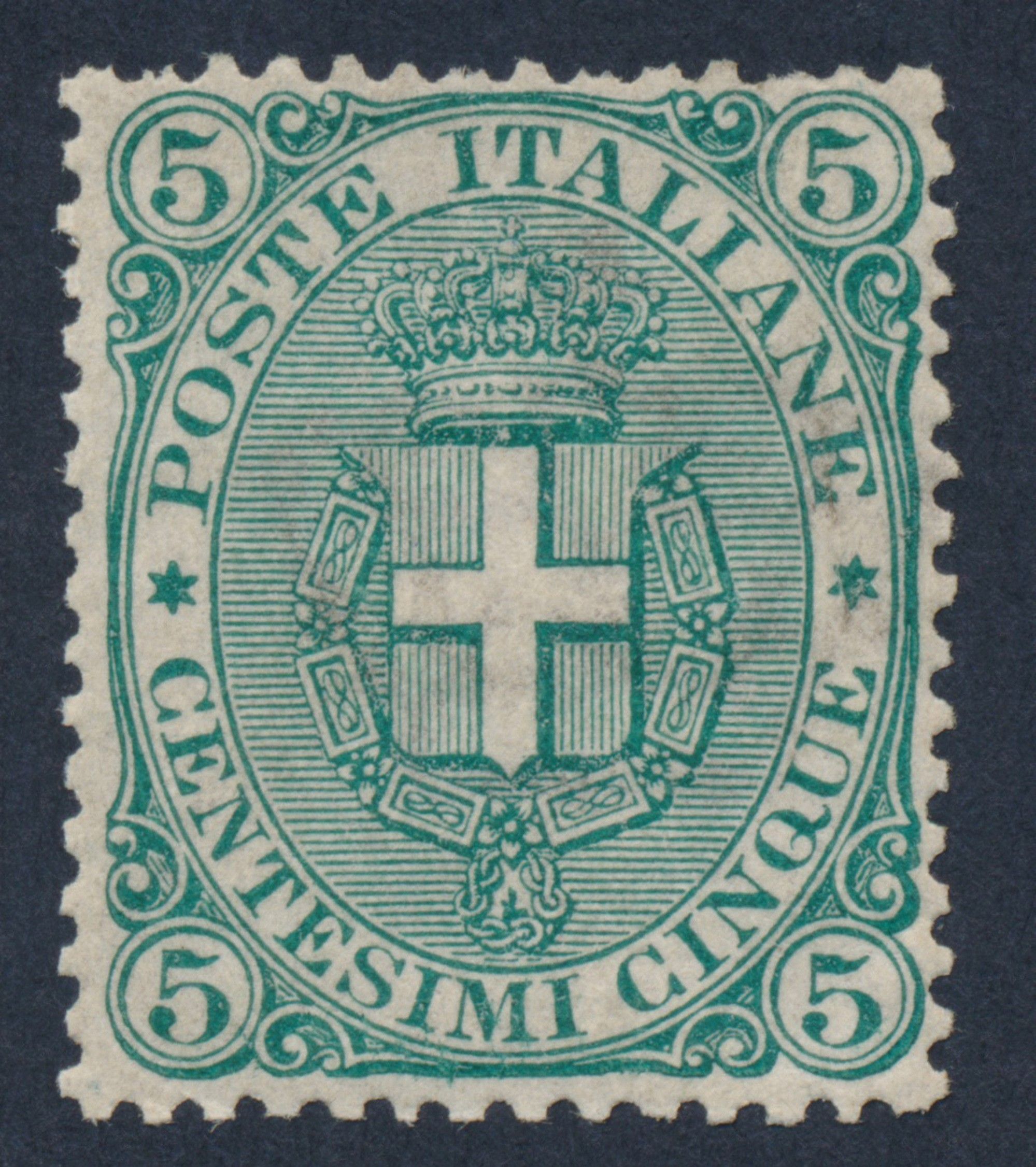 1891 – Regno d’Italia – 5 cent. verde “Scudo Savoia”, gomma integra (Sass. 59).