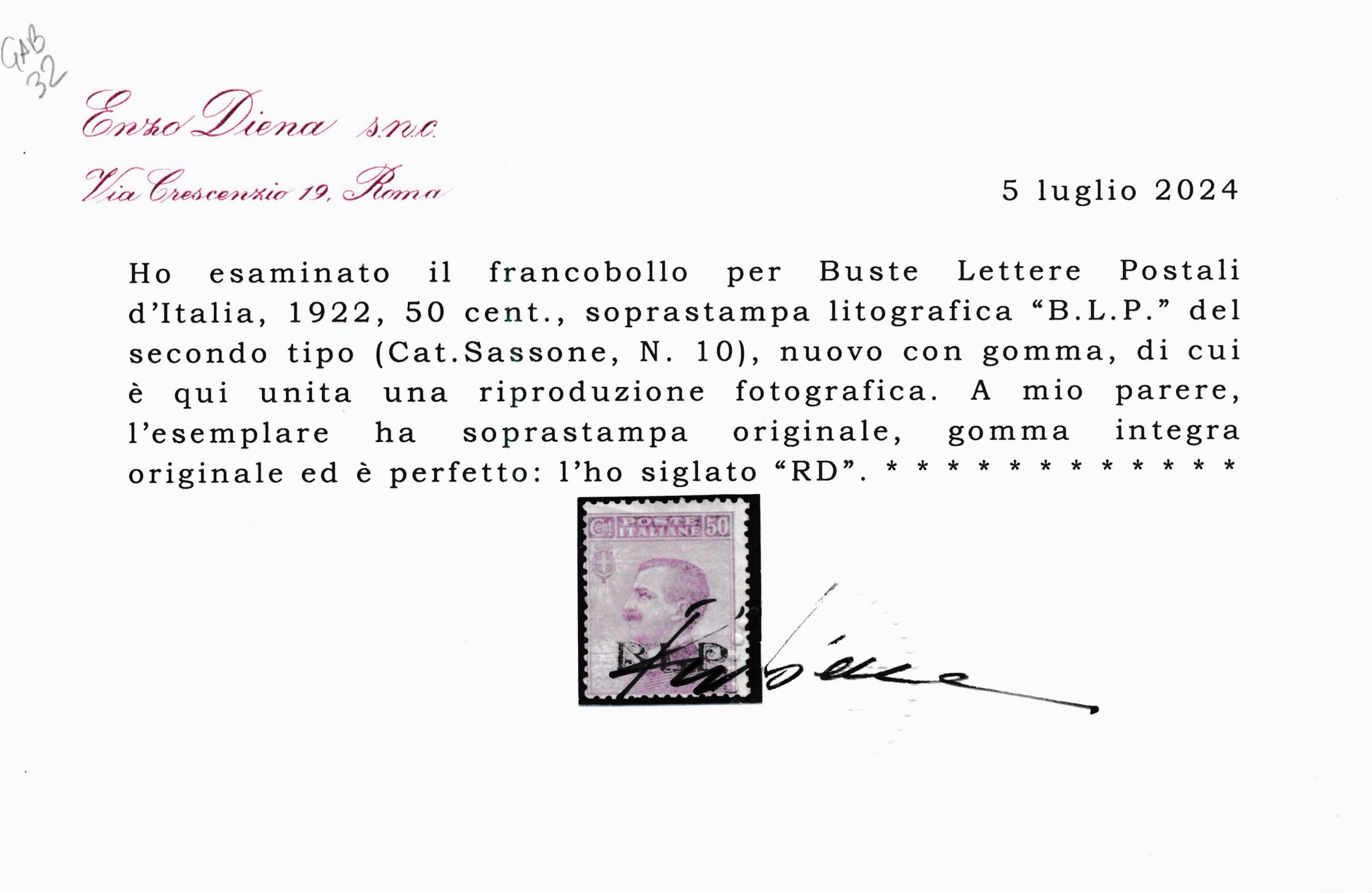 1922 – Regno d’Italia - Buste Lettere Postali – 50 cent. violetto, soprastampa “B.L.P.”, [..]
