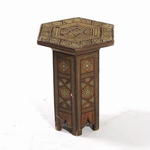 Tavolino esagonale in stile orientale intarsiato. XX secolo
