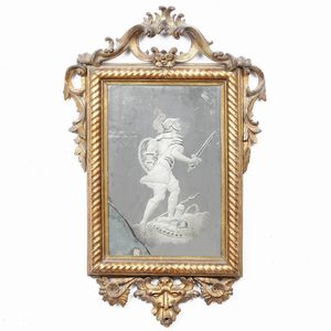 Specchio inciso entro cornice in legno dorato. XVIII-XIX secolo