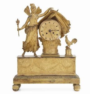 Pendola da tavolo in metallo dorato con figura allegorica femminile e gallo. XIX [..]
