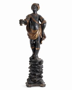 Scultura di moro porta candela in legno ebanizzato e dorato. Veneto, XIX secolo