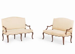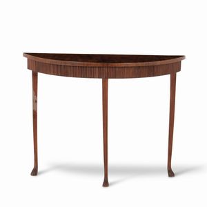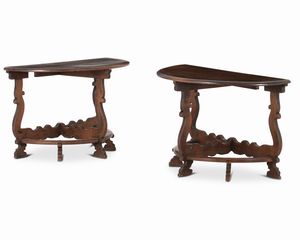 Coppia di mezzi tavoli in noce con gambe sagomate. XIX-XX secolo