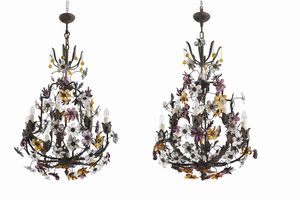 Coppia di lampadari in legno intagliato, dorato e cristalli. XVIII secolo