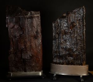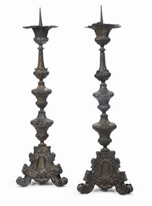 Coppia di candelieri in metallo sbalzato con struttura interna in legno. XVIII s [..]