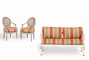 Piccolo divanetto e coppia di poltrone in legno dipinto. XIX secolo