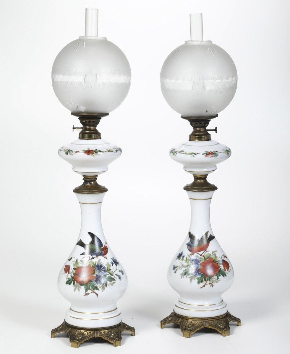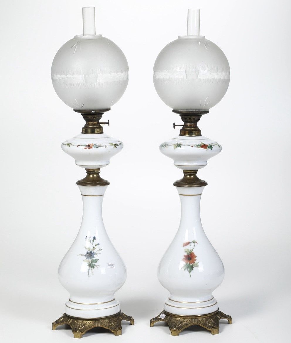 Coppia di lampade ad olio in porcellana dipinta e metallo dorato. XIX-XX secolo