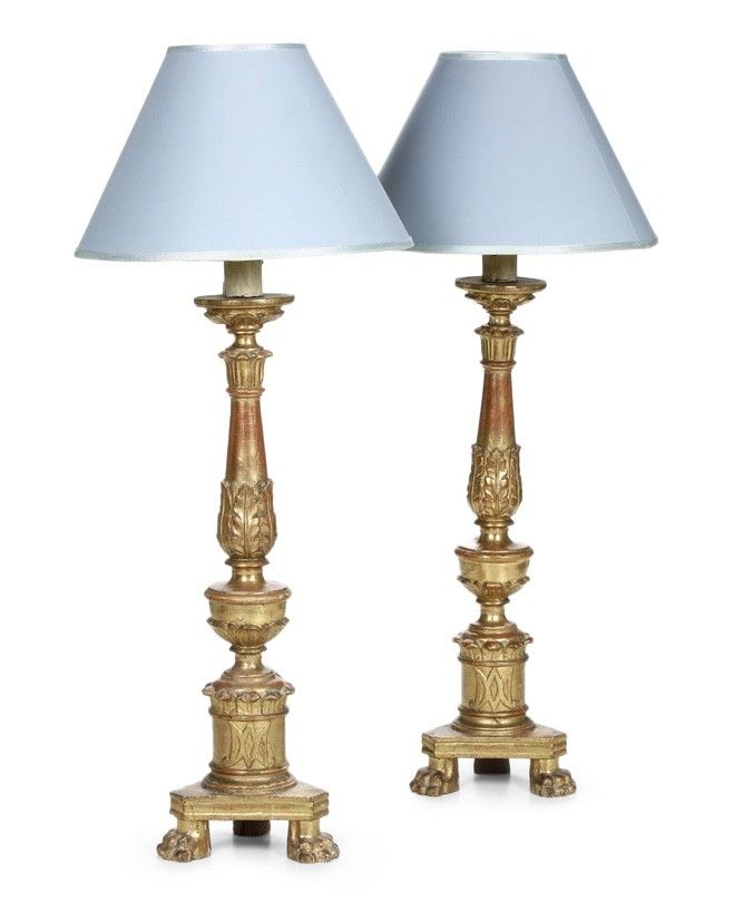 Coppia di portaceri in legno intagliato e dorato. XVIII secolo