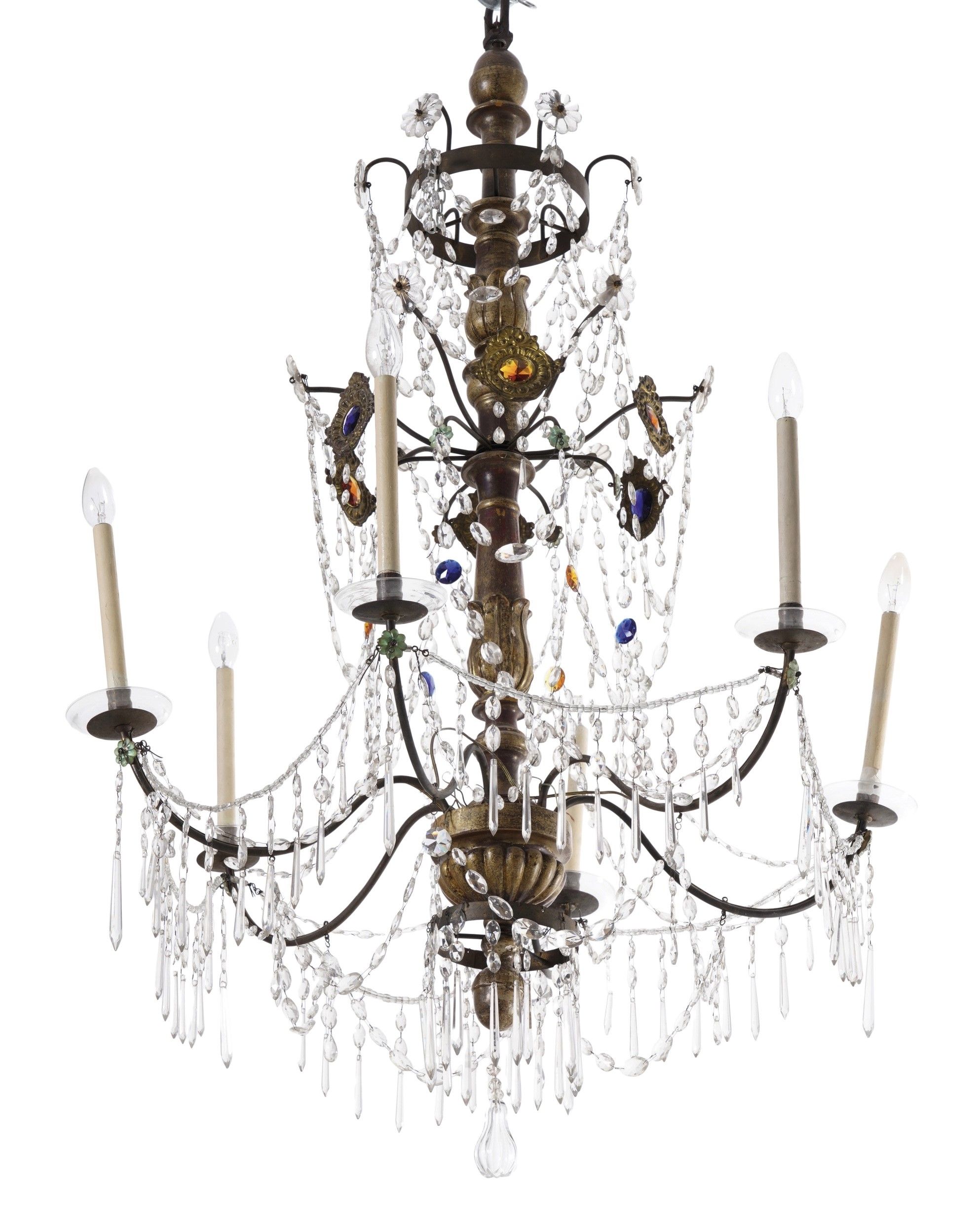Lampadario a sei luci in legno intagliato e dorato decorato da pendenti a perline. [..]