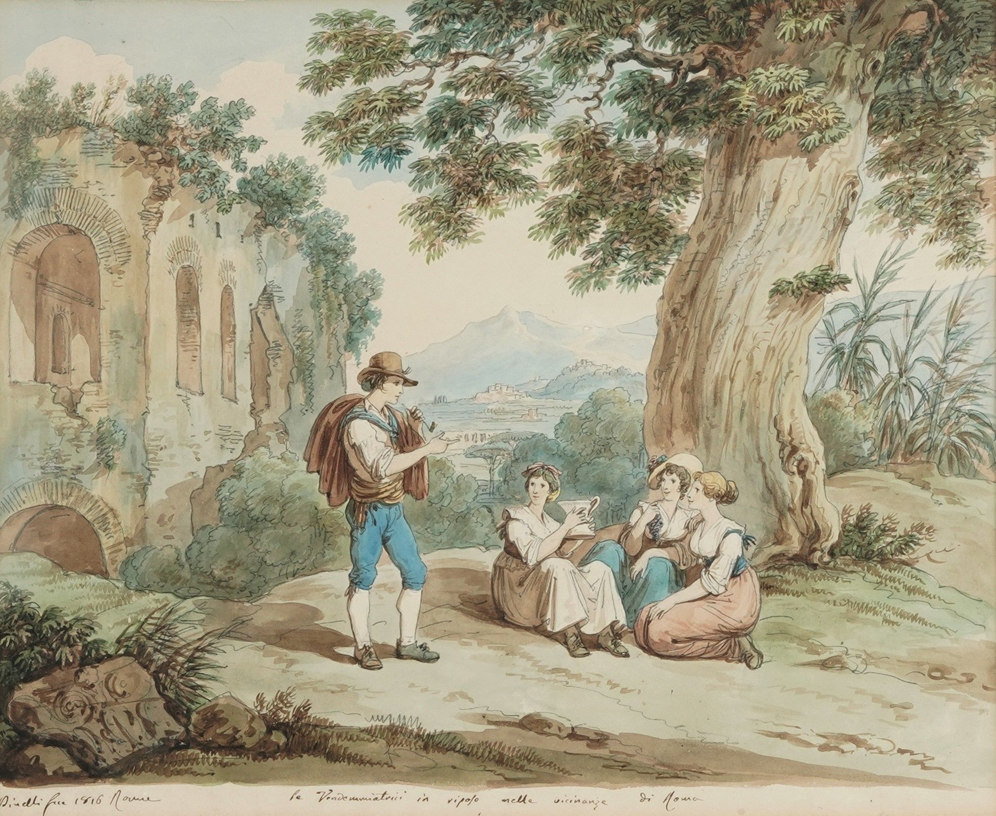 matita nera, penna, inchiostro e acquerello colorato su carta, Largh. 305 - Alt. 255 mm