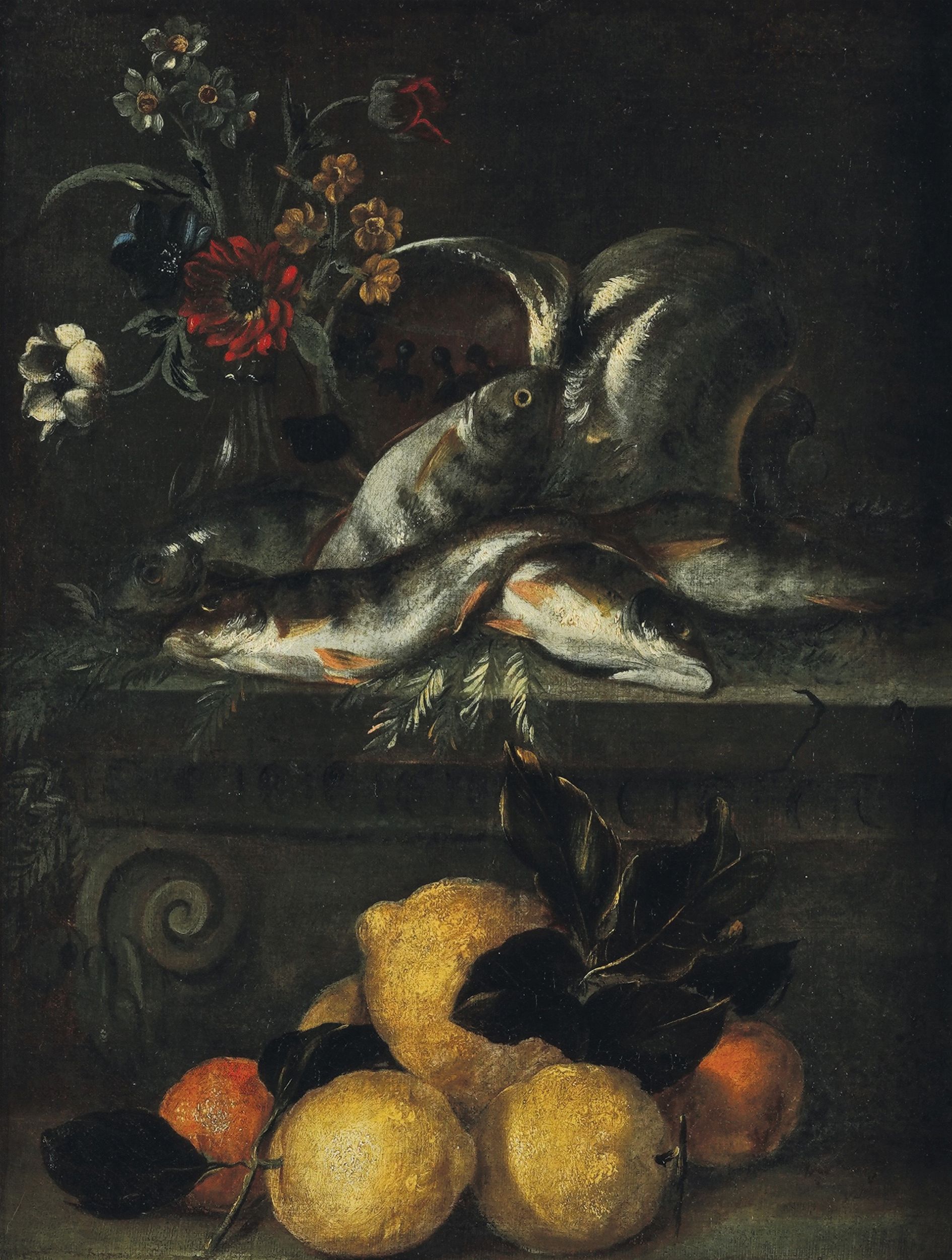 Natura in posa con pesci, fiori e agrumi