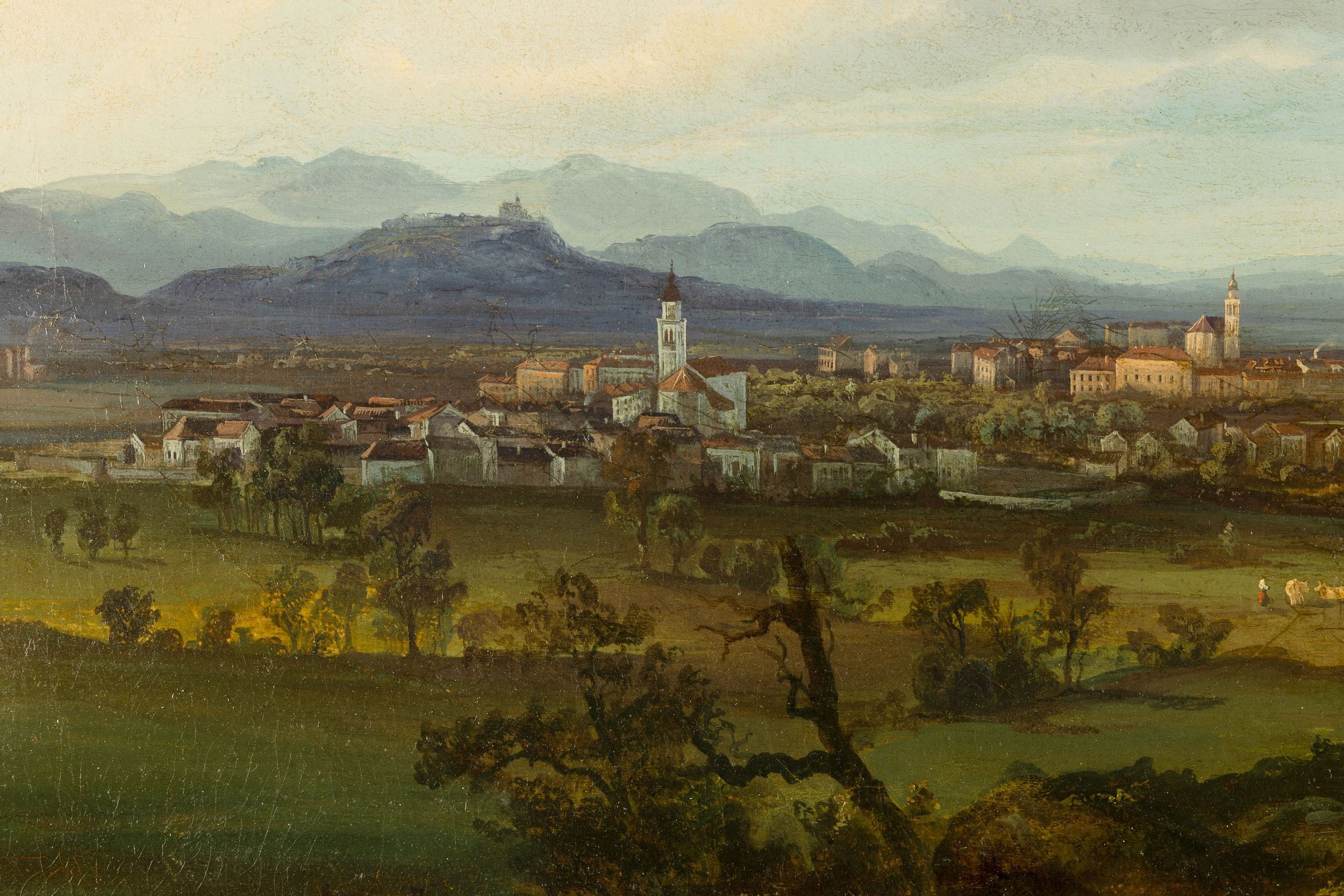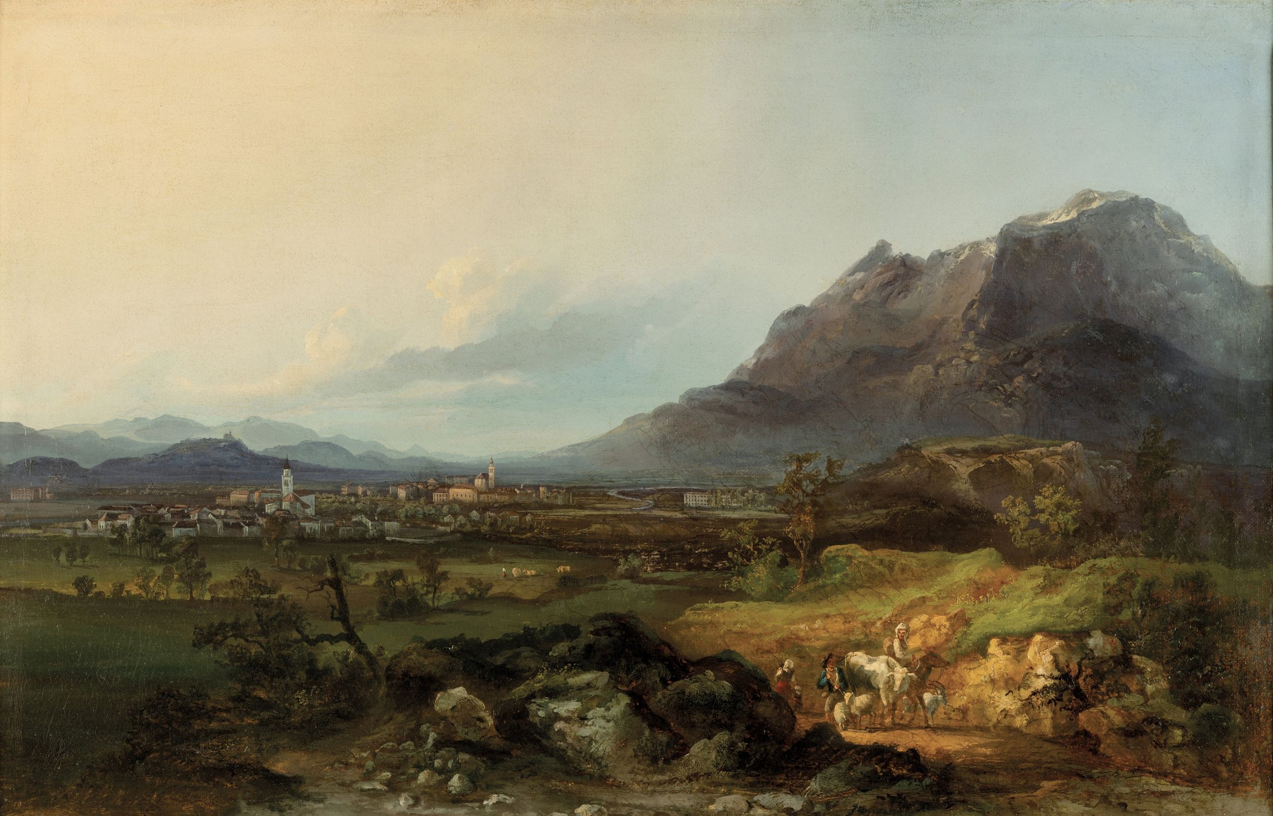 Scuola piemontese (?) del XIX secolo Paesaggio collinare con pastori e cittadina [..]