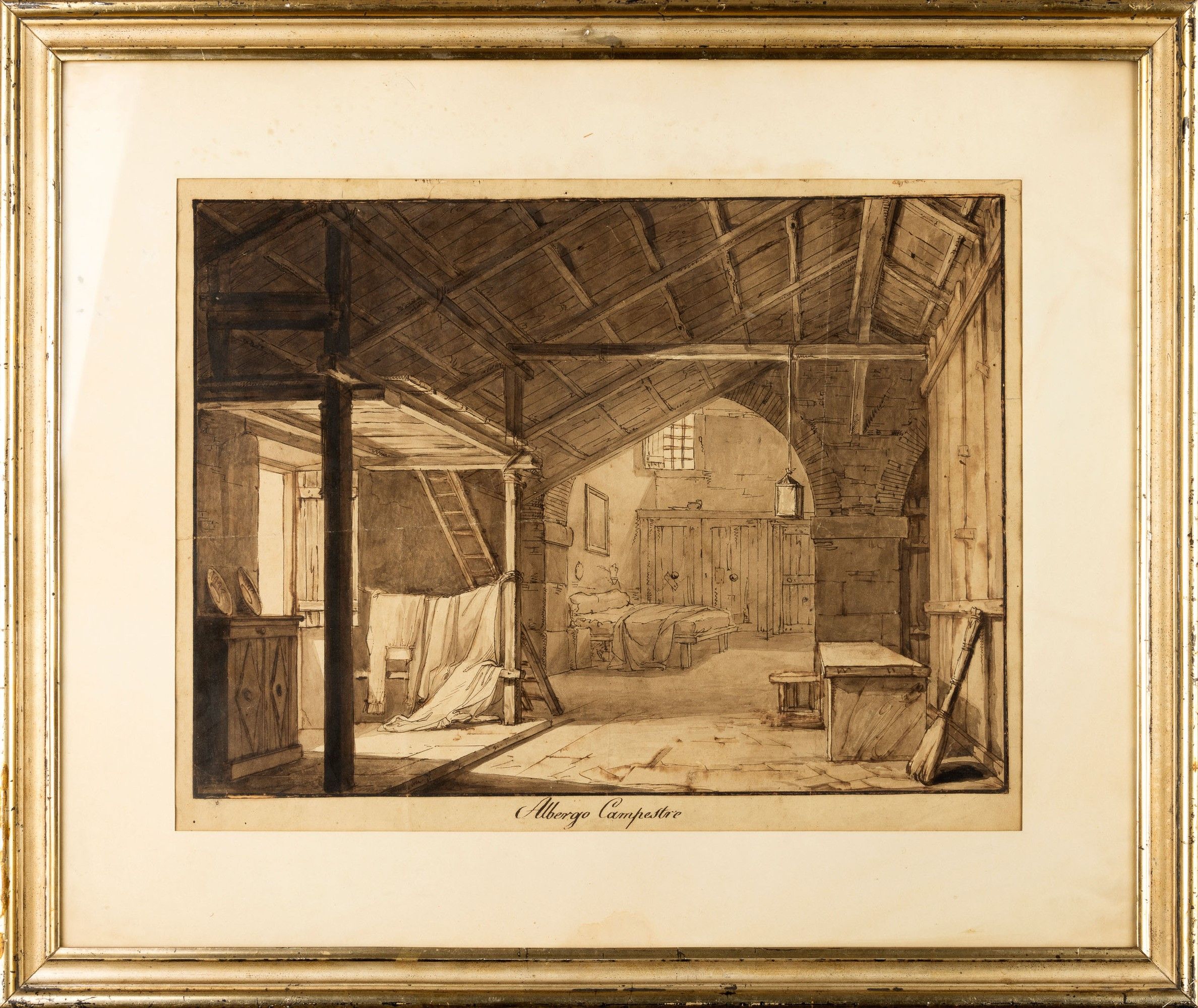 penna, inchiostro bruno e acquerello su carta, mm 410 X300