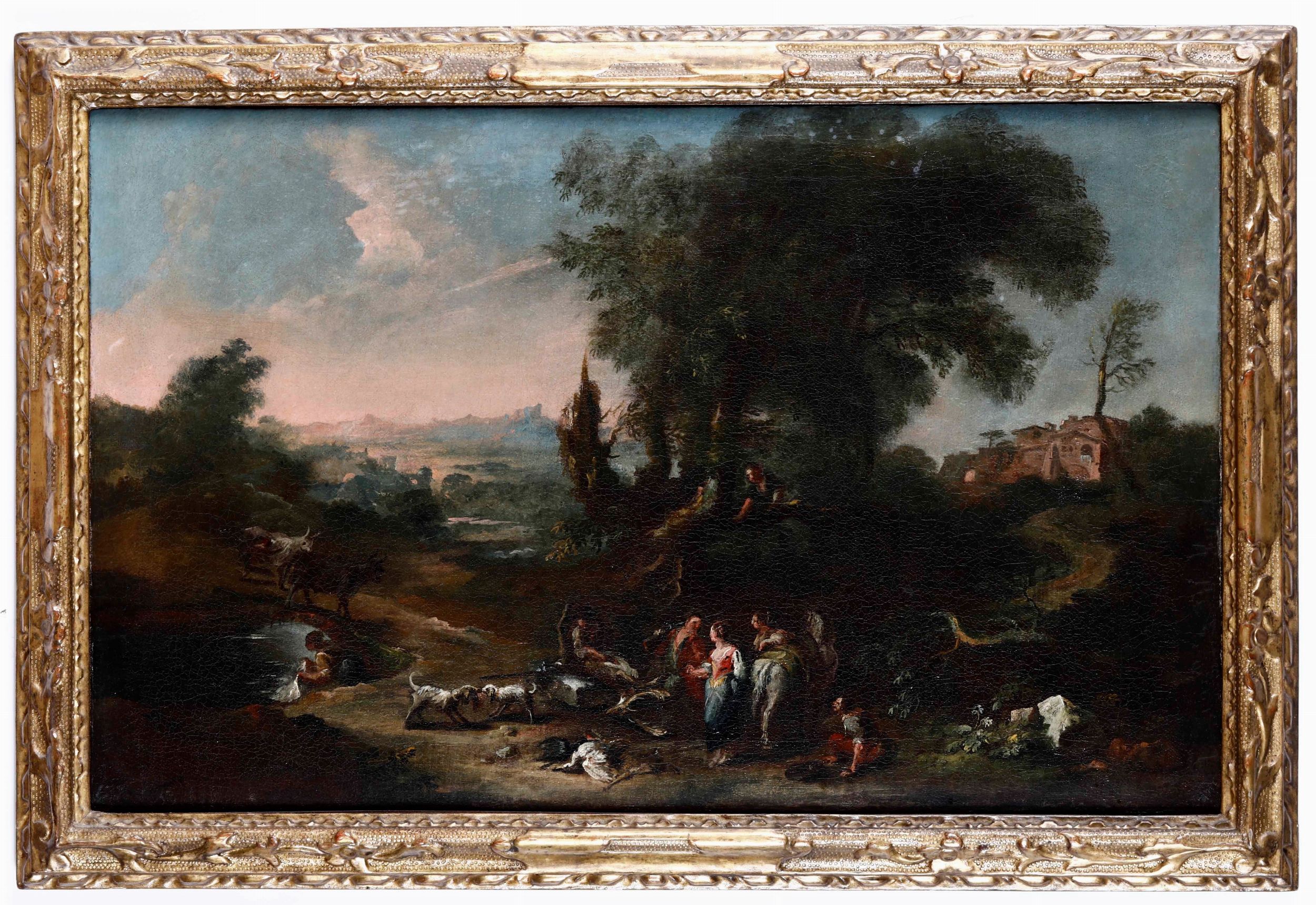 Scuola veneta del XVIII secolo Paesaggio con cacciatori e lavandaie