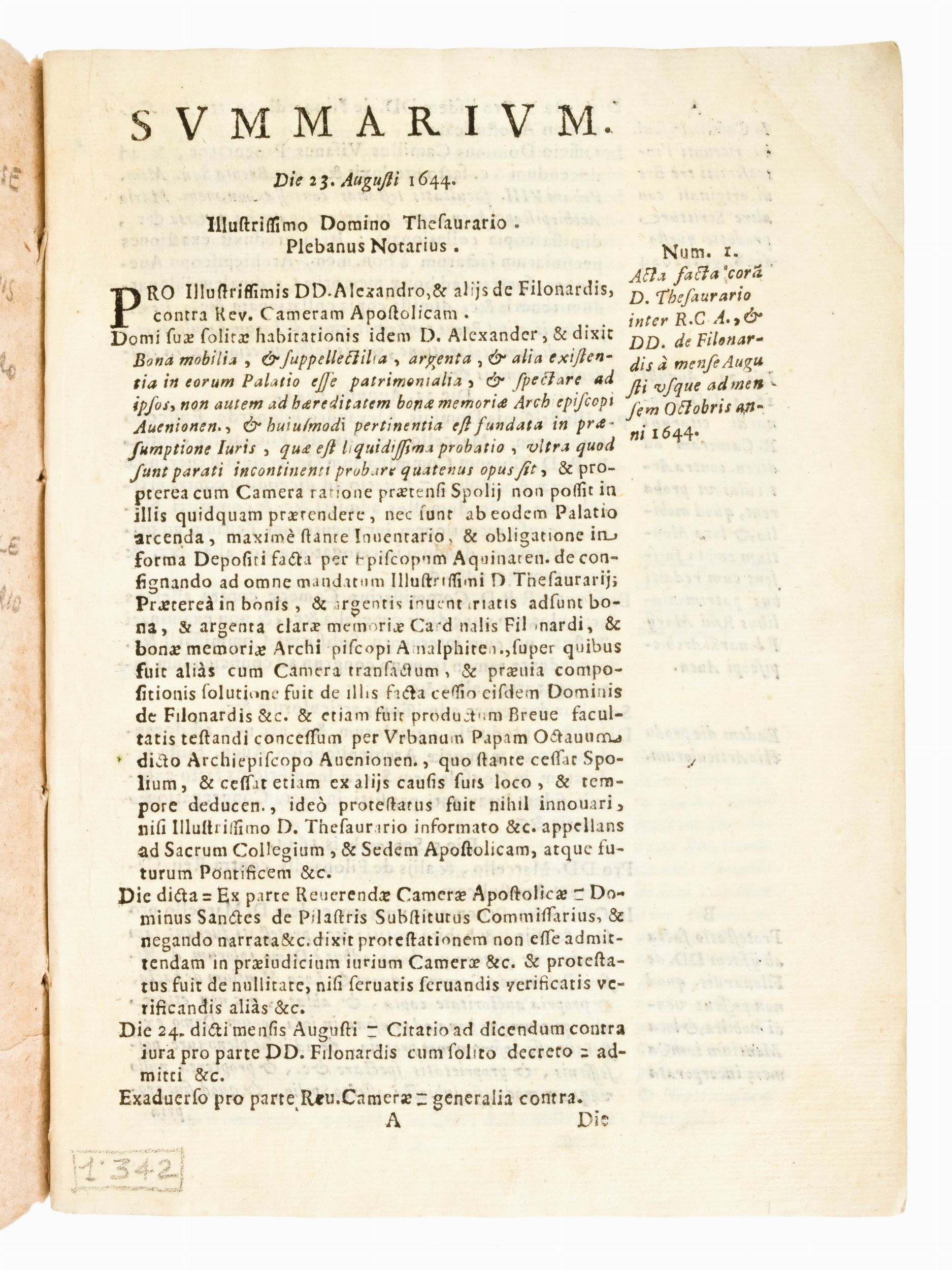 In-16° ( 145x80 mm.) brossura in carta coeva rossa con decori dorati, pp. 88 / insieme a : Atto giudiziaro del 1730 In cui gli eredi Filonardi fanno opposizione alla confisca dei Beni di Famiglia. in-4° ( 260x190 mm. ) brossura in carta decorata , 24 carte nn.