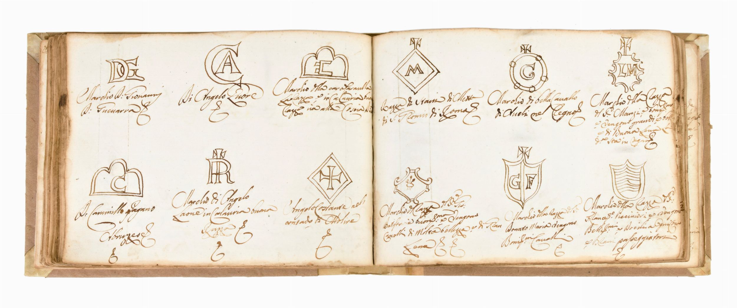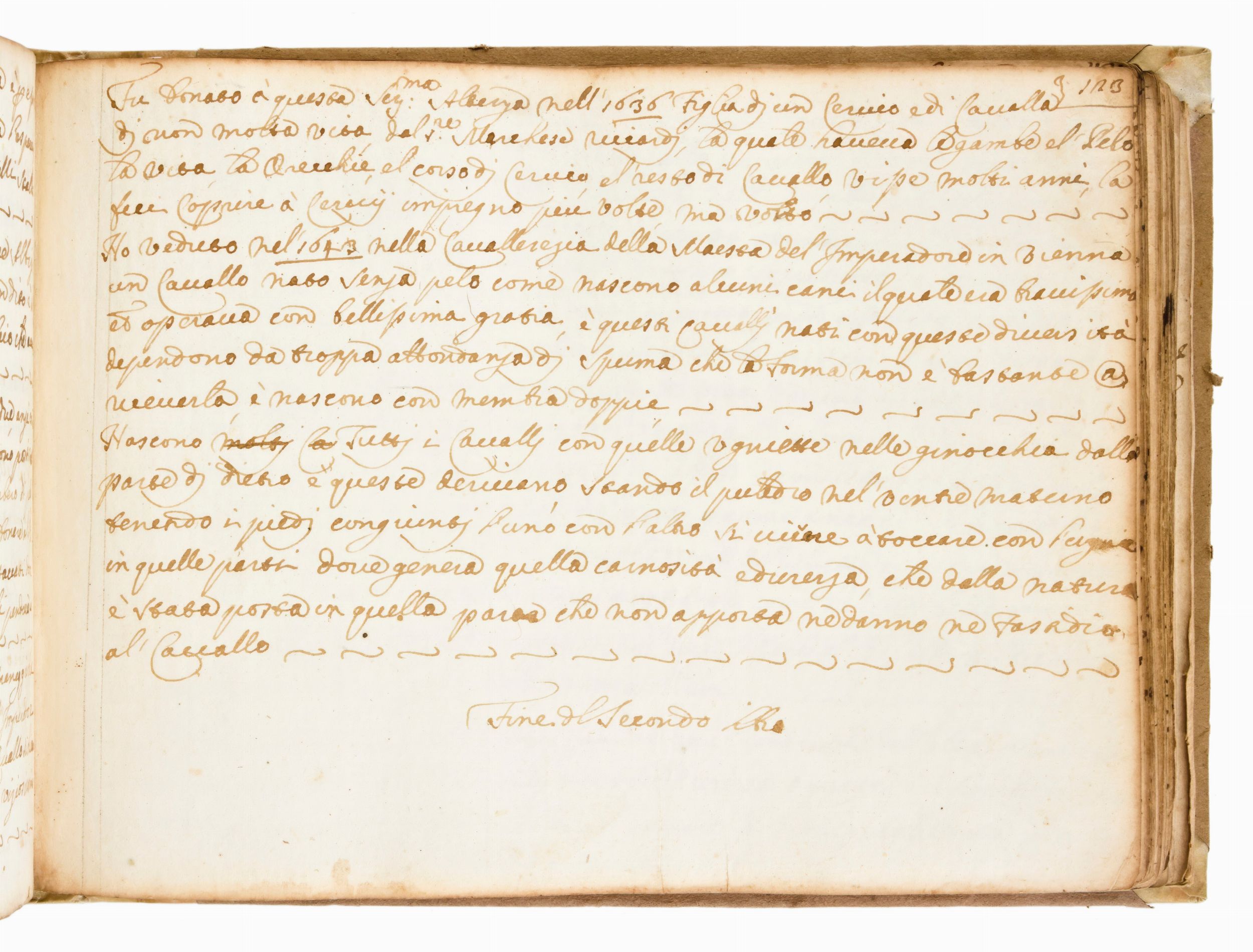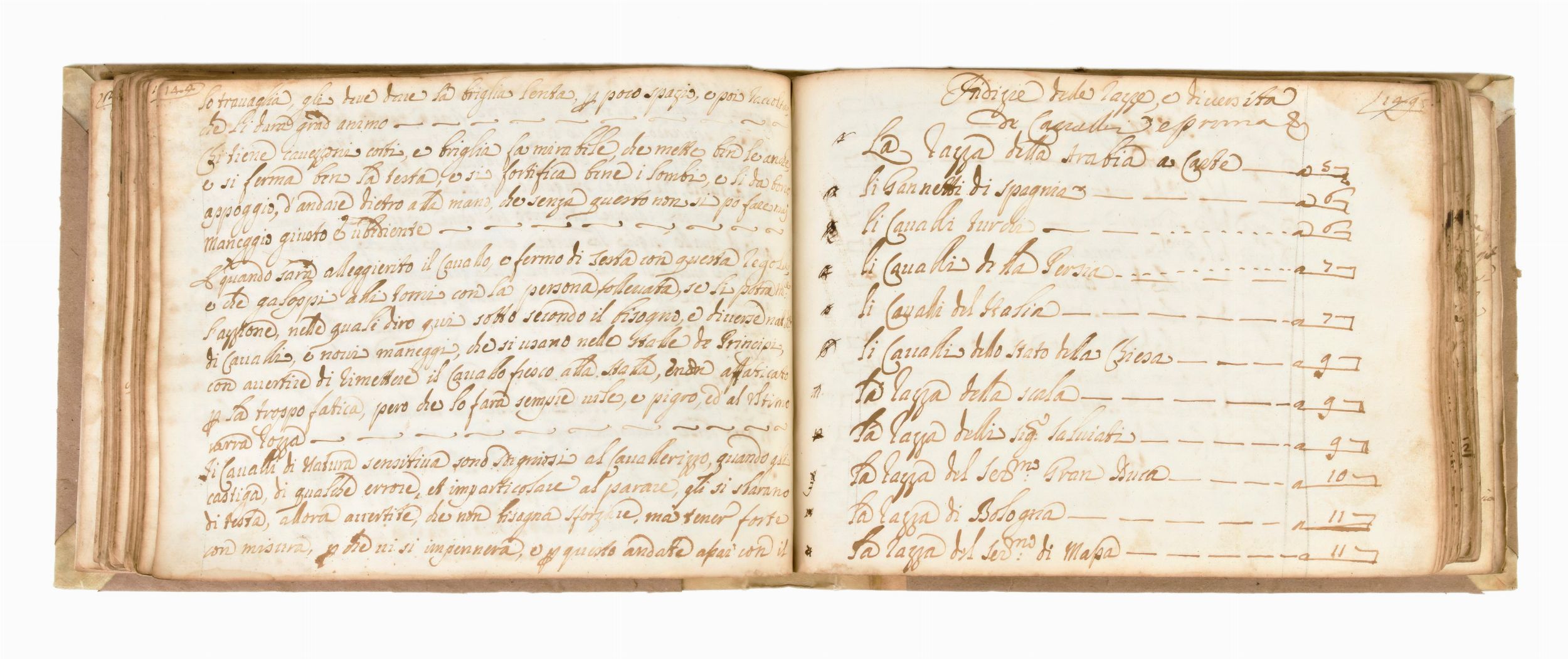 [ MANOSCRITTI / EQUITAZIONE ] ' Manoscritto Discorso sopra i Cavalli, Mali d'essi e Modo di Imparare a Cavalcare ' Meraviglioso manoscritto illustrato dal titolo “Discorso sopra i cavalli, mali d'essi e modo di imparare a cavalcare”. Pur non essendo presenti riferimenti sull'autore e la datazione, possiamo far risalire il prezioso manoscritto tra la fine del XVII e l'inizio del XVIII secolo. Confrontando l'incipit presente a pagina 5 “1 Ciascheduno sa, che tutte le cose di questo Mondo furono create per il comodo, e servizio del'homo…” possiamo comprendere come il testo sia estrapolato dalla Mascalcia Toscana, fondamentale opera di Vincenzo Ferri.Non è chiaro infatti se questa opera sia realmente stata completata poiché vi è un salto nella pagina 144 precedente all'indice (che non termina) ed in relazione all'opera del Ferri sono presenti alcune variazioni e la compilazione dello stesso indice si interrompe a pagina 115 con una grafia differente e presumibilmente apposta in un secondo momento. Sono contenute nel testo tutte le razze e le diversità dei cavalli conosciuti, l'elenco delle cure per tutti i mali che possono affliggere gli equini ed infine i vari stili di equitazione, divisi e numerati. A rendere davvero speciale il manoscritto è la presenza di una seconda parte, redatta dalla stessa mano, che racchiude tutti i marchi delle principali razze di cavalli d'Europa, concentrandosi specialmente su realtà italiane, come ad esempio i cavalli dell'Imperatore Ferdinando di casa d'Austria o di Boemia, del Granduca di Toscana, del Re di Napoli e centinaia di altri. Sono raccolte infatti in 139 pagine ben 834 marchi finemente ornati e descritti nei minimi dettagli che rendono il manoscritto unico. Il manoscritto, redatto in chiara grafia in formato oblungo e rilegato in mezza pergamena, è così composto: 153 pagine manoscritte nella prima parte e 139 pagine manoscritte nella seconda parte. Parziale gora che non compromette la consultazione; altissima rarità .