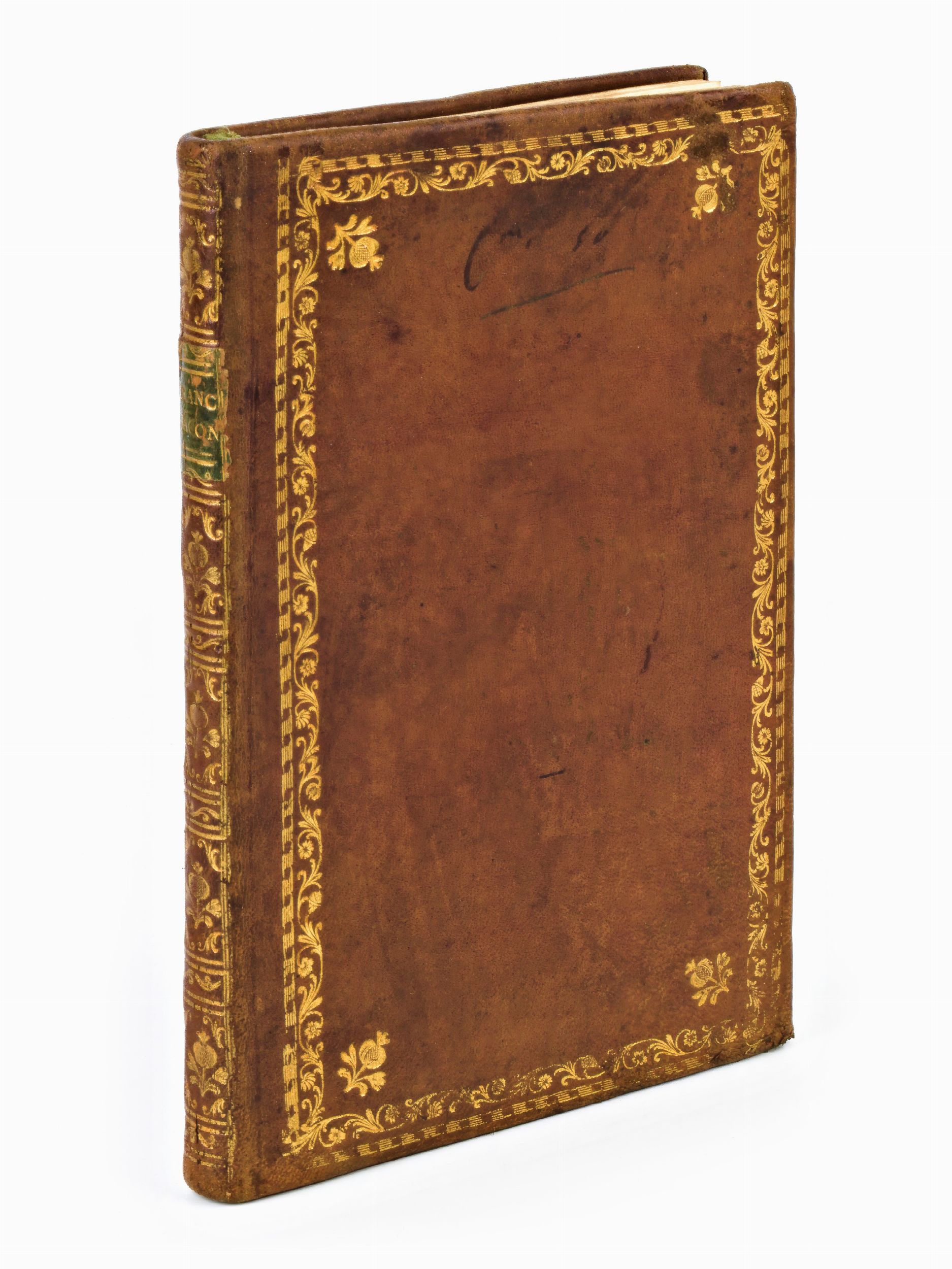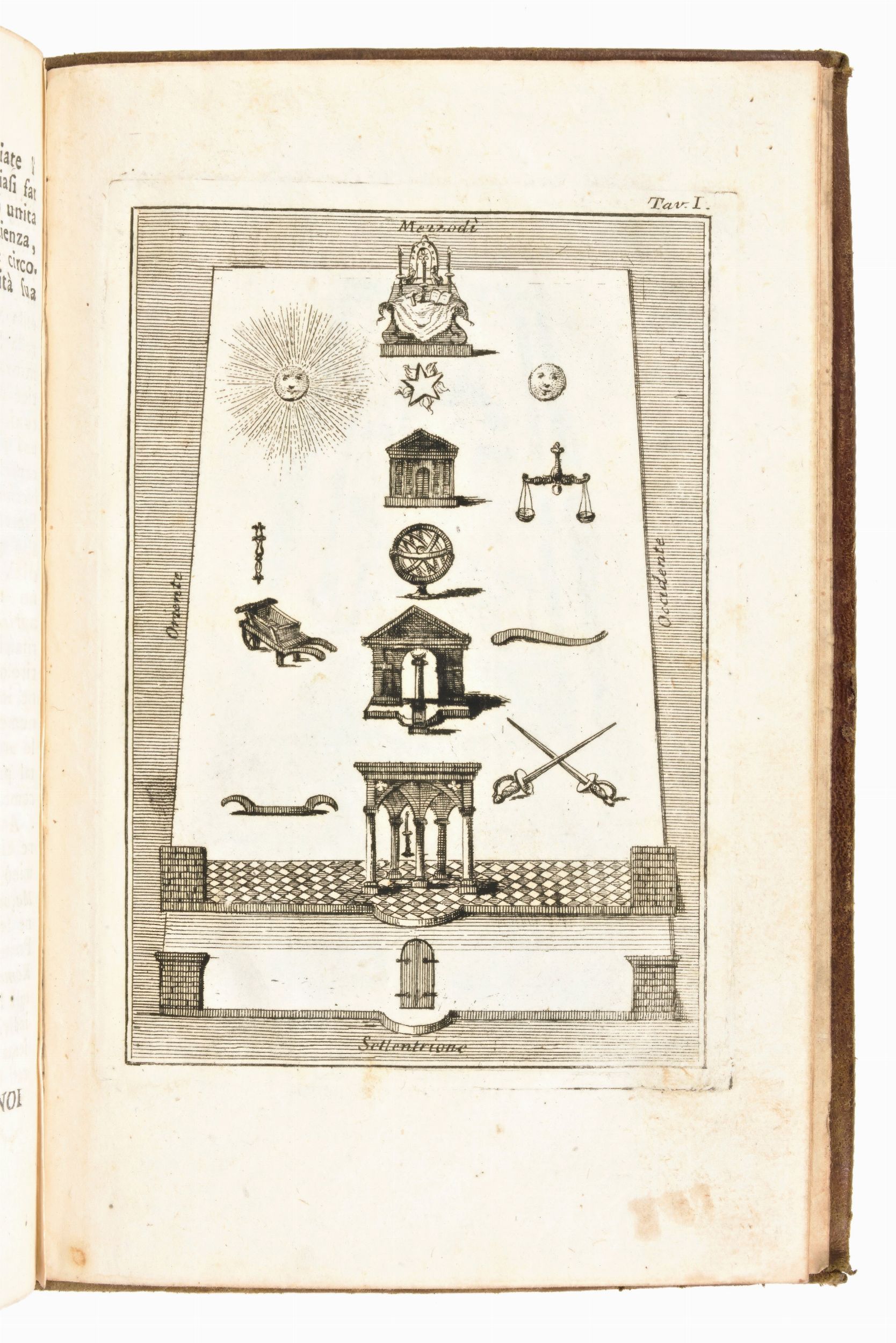 in-8° ( 190x125 mm.) legatura coeva in piena pelle con fregi e titoli impressi in oro a dorso e piatti, tagli dorati. Occhietto, Antiporta calcografica , pp. 94 + 6 tav. a fine testo raffiguranti varie simbologie massoniche e l'alfabeto dei Franchi Muratori. Antica nota di possesso a china alla sguardia datata 1807 . Frontespizio rifilato, bell'esemplare completo. Nel 1785 una grande Loggia inglese, l'Unione, fondata il 27 novembre 1772, fu demolita dal senato veneziano, e molti dei suoi membri furono condannati all'esilio. Anche la tolleranza e l'antica libertà della Serenissima dovette cedere alle pressioni della Chiesa Romana. Fu uno dei membri di questa Loggia, in un atto di testimonianza e di amore, che pubblicò una leggenda massonica che faceva risalire a Cromwell la fondazione dell'Ordine, assieme ai rituali di Loggia ed al resoconto delle sue peripezie. Al di là dell'importanza storiografica che si può attribuire al testo, la parte letteraria è di notevole bellezza, e mette in risalto l'arcana simbologia, spiegata solo in parte, di questo rituale molto vicino alle origini della rivitalizzazione massonica degli inizi del XVIII° secolo e dell'inserimento in essa di esoterismi che ne testimoniano la tradizionalità perenne.