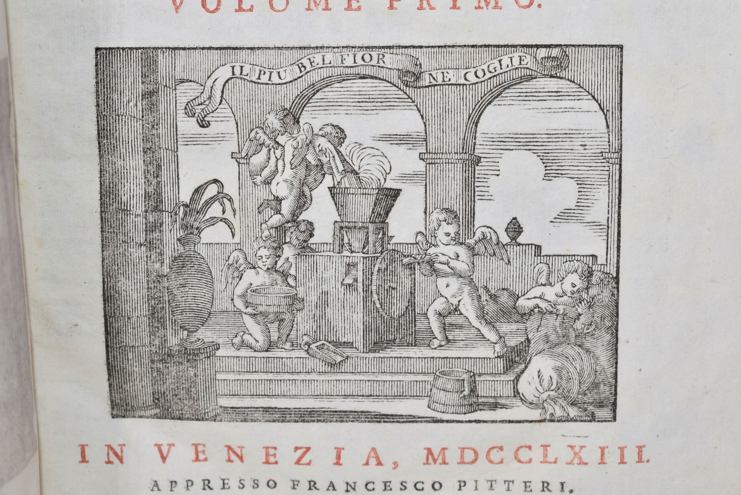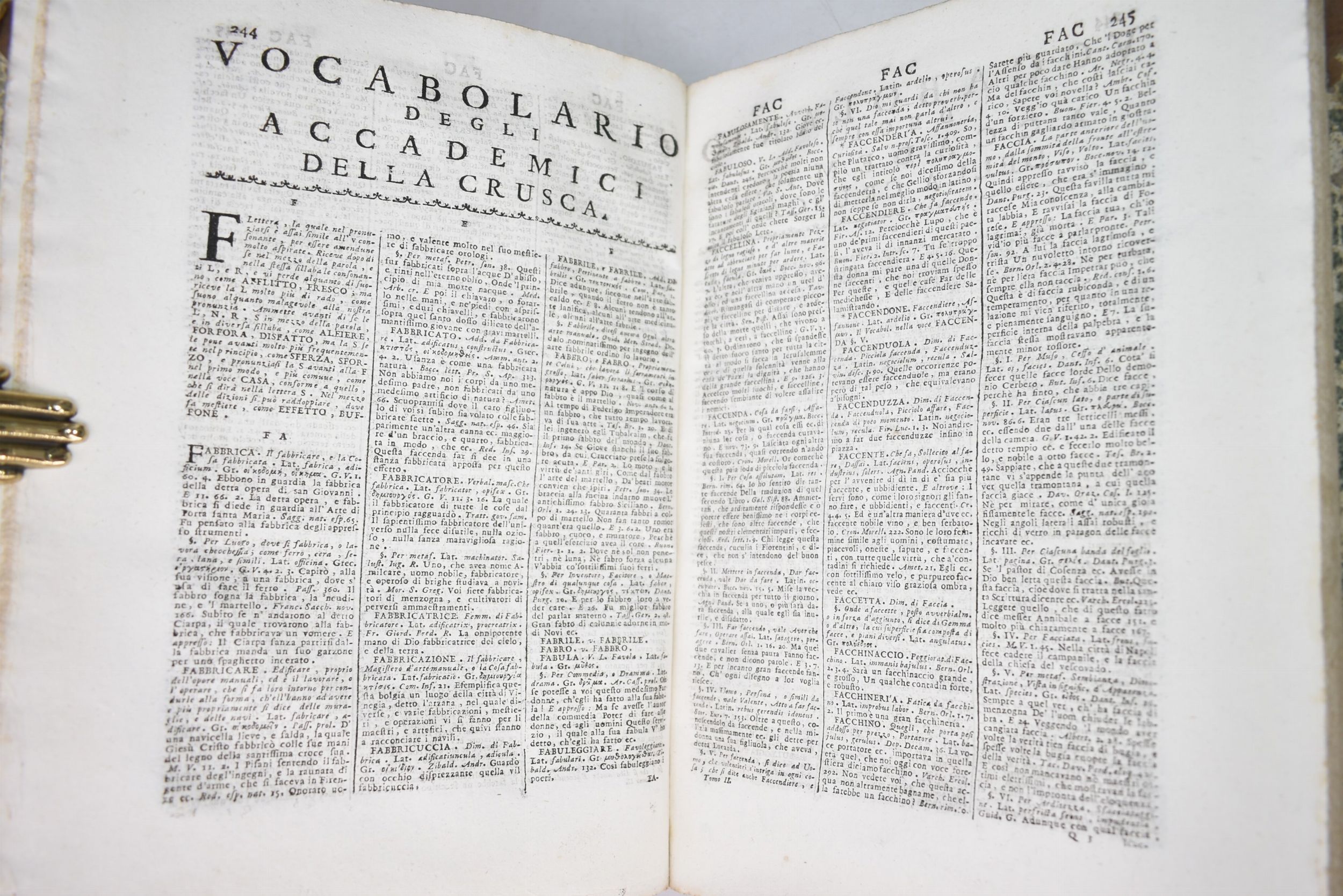 5 volumi, in 4°, cm 27,5x20,5. Legatura coeva in mezza pelle con punte, dorso con eleganti fregi in oro e titoli impressi su tasselli col. Seconda edizione veneta del vocabolario della Crusca, con front. impresso a col. al primo vol., testo stampato su 3 col. Ottimo esemplare. In aggiunta, il dizionario dei Sinonimi ed aggiunti raccolti dal p. Carlo Costanzo Rabbi, 2 tomi rilegati in 1 volume, Venezia 1756 per Francesco Storti.