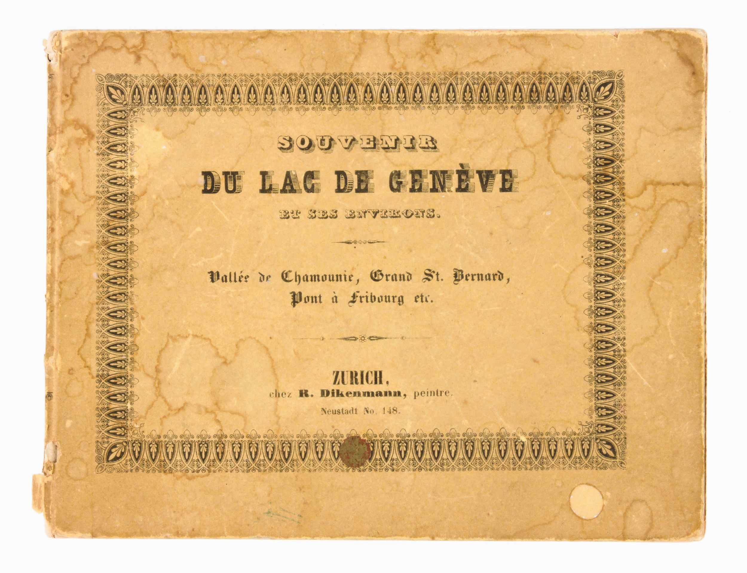 Formato oblungo. Cm. 13x17. Copertina editoriale rigida (Difetti). Souvenir del Lago di Ginevra e i suoi dintorni. Album di 13 splendide vedute a colori eseguite con incisione all'acquatinta, editore R. Dikenmann, in Zurigo, senza data (ca. 1850). L'album contiene le seguenti stampe : Mont-Blane et Geneve, Hotel des Bergues & Isle J.J. Rousseau a Geneve, Morges au lac de Geneve, Vue de Lausanne, Vevey, Chateau de Chillon, Sitten-Sion, Les Bains de Loueche, Visp et le Mont Rosa, La Mer de Glace vue du Montanvert, La Village de Chamouny, Vue de l'Hospice du St. Bernard, Fribourg Suisse.