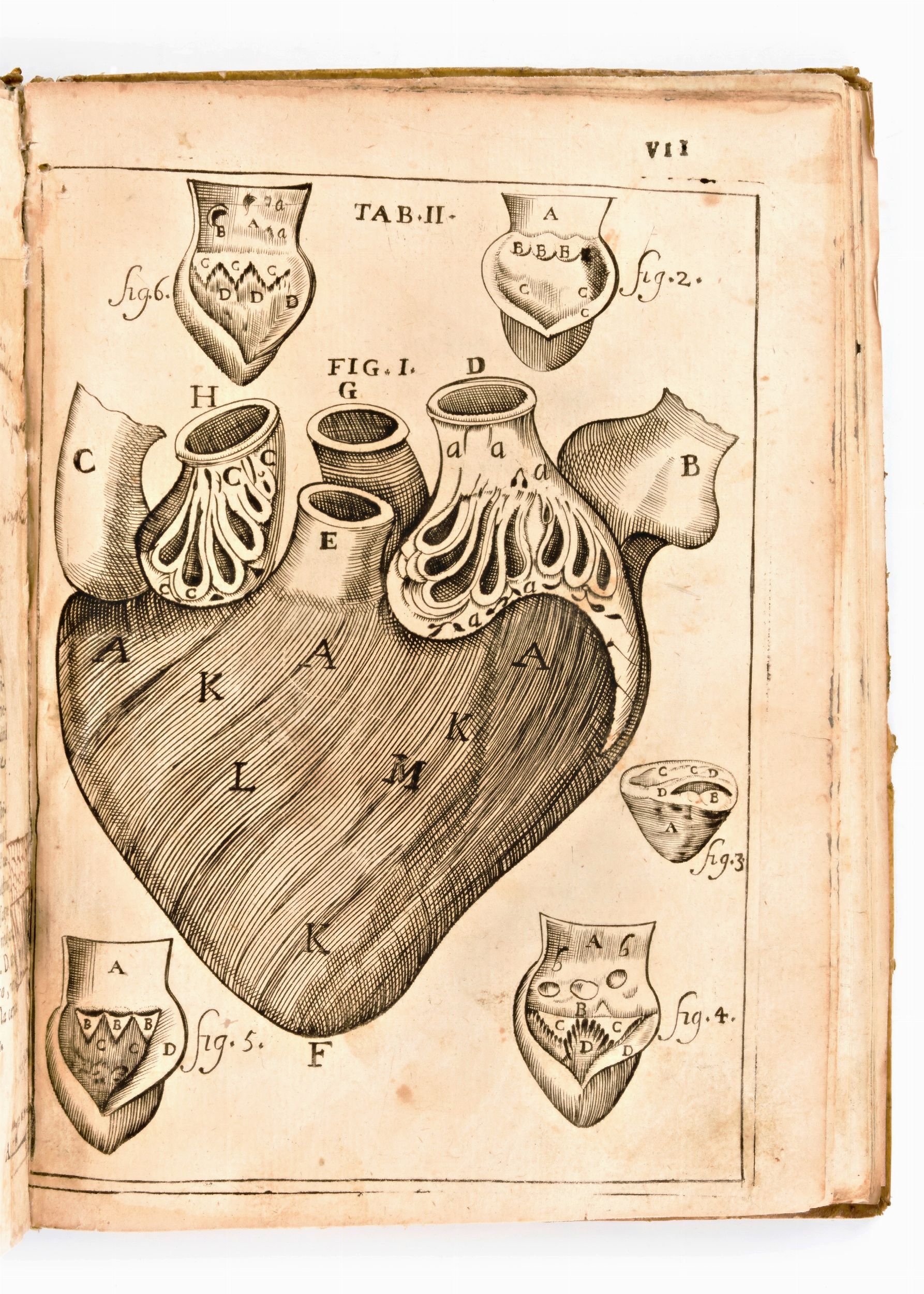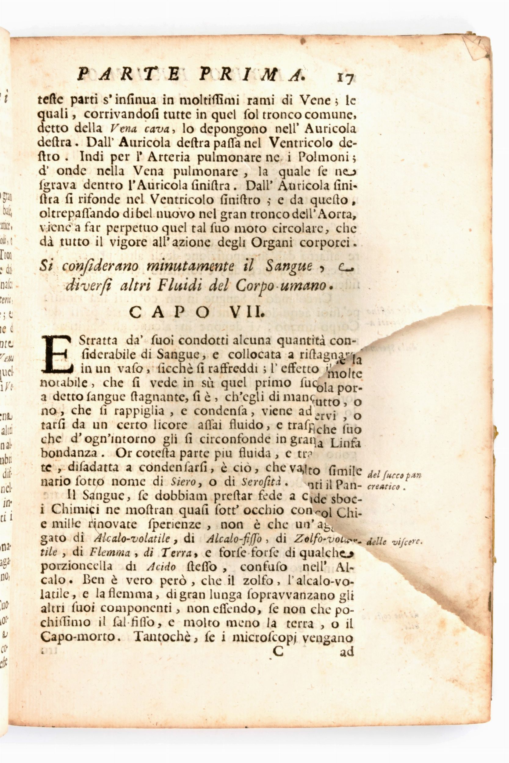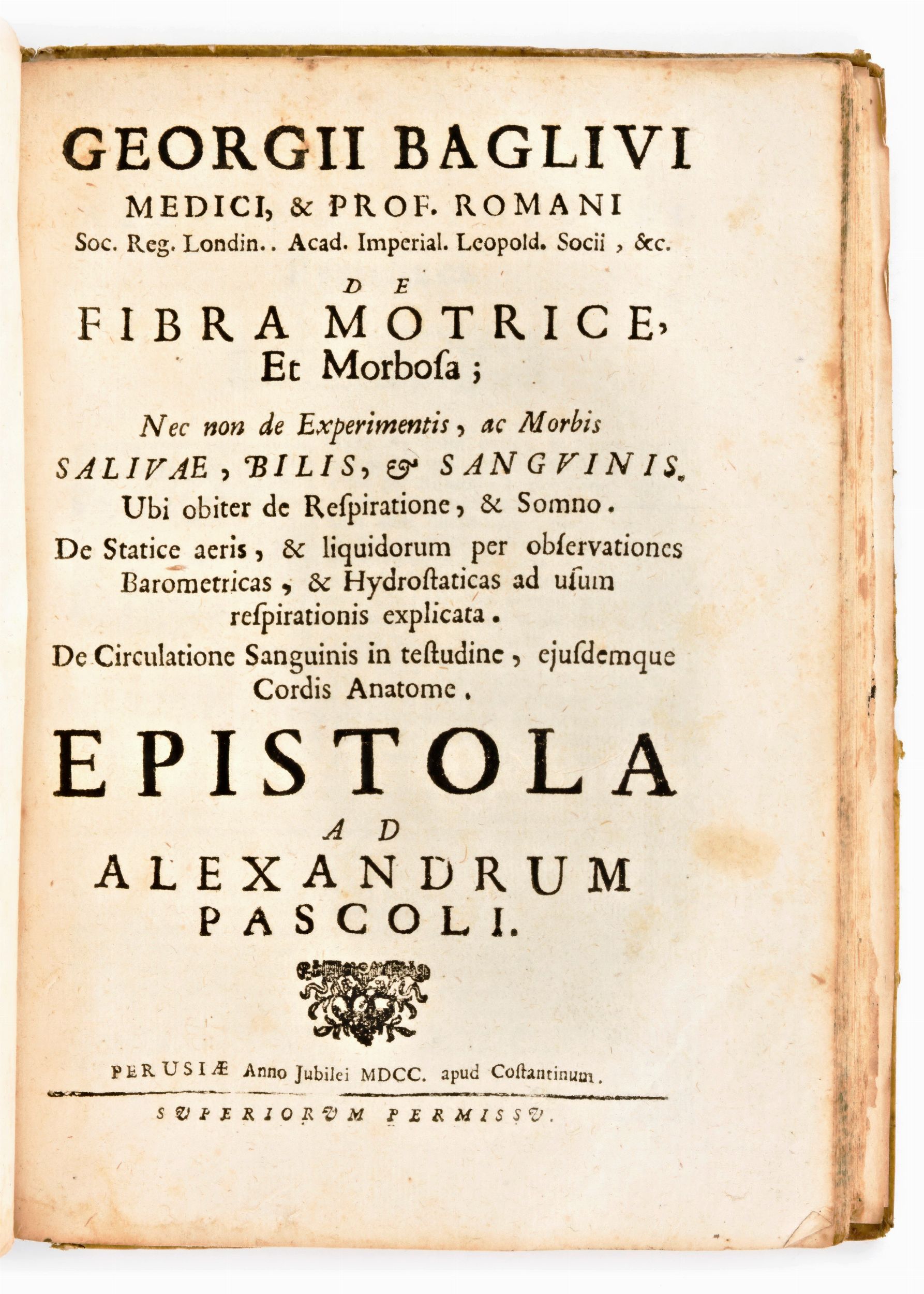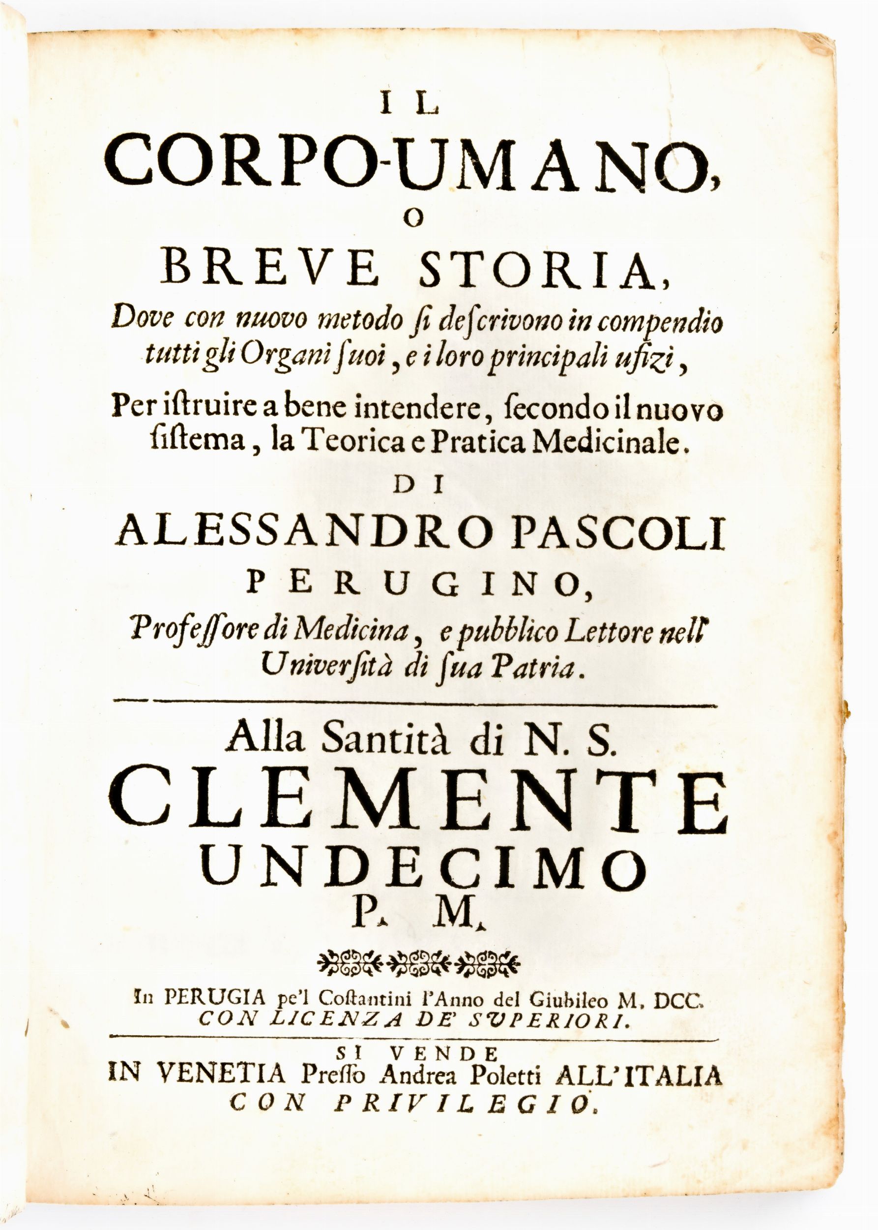 Formato in-4°, mm. 215x155, pp. (20), 339, LXXXVIII, 58. Esemplare mancante della Tavola XI e delle carte E2, E3 (descrizione tavola XI). Rilegatura coeva in piena pergamena con titolo manoscritto al dorso. Strappi marginali con perdita di testo alla carta con dedicatoria a Clemente XI e alla carta C1. Restauro alla Tavola 1 (spiegazzata) e alla carta a2 con parte del testo reintegrato a mano. Sporadiche fioriture. Antiporta calcografica e 1 ritratto dell'Autore disegnati da Giuseppe Laudati e incisi da Girolamo Frezza. 19 tavole anatomiche incise fuori testo. Testatine, capilettere e finalini xilografici. Opera di Alessandro Pascoli (1669-1757), medico anatomista italiano, insegnò a Roma e Perugia. Teneva dimostrazioni anatomiche mediante dissezione di cadaveri, come il suo collega e concorrente Andrea Vesalio. In fine con proprio frontespizio uno scritto di 58 pagine dell'anatomista Giorgio Baglivi (1668-1707) : Georgii Baglivi ... De fibra motrice, et morbosa; nec non De experimentis, ac morbis salivae, bilis, & sanguinis... Perusiae, apud Costantinum anno Jubilei, 1700.