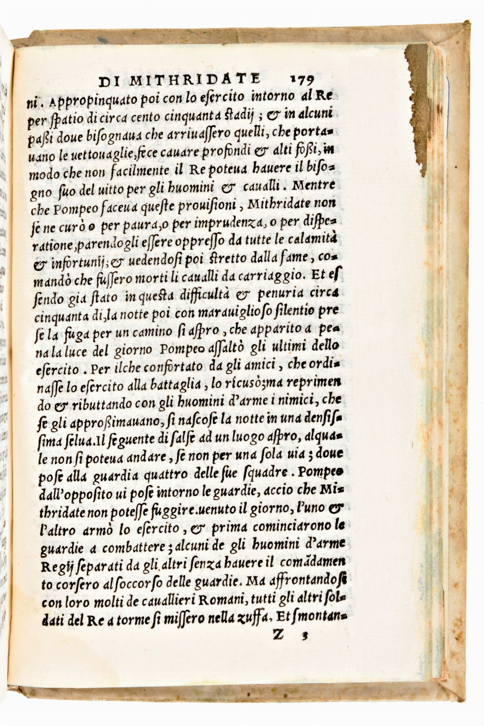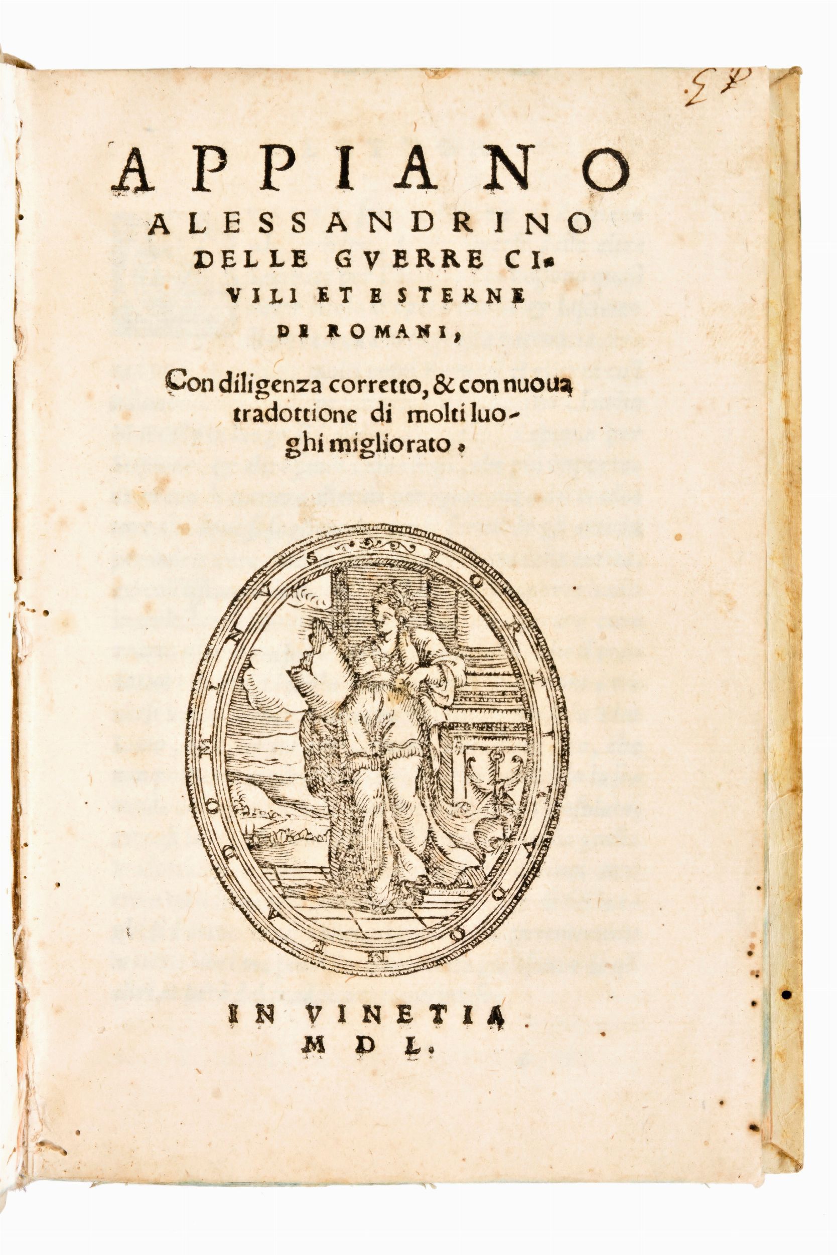 2 volumi. Formato in-8°, mm. 160x110, cc. 285, (1 bianca) / 190, (2). Completo. Rilegatura coeva in piena pergamena con piatti colorati. Titoli e fregi in oro su tassello in pelle al dorso. Tagli delle cc. marmorizzati. Presente ex libris al risguardo posteriore. Testo nitido, carte pulite, con lavori di tarlo ai margini di alcune carte, a perdere una lettera alla c. ff6. Testo corsivo. Marca xilografica al frontespizio. Capilettera in xilografia nel testo. Antica edizione impressa in Venezia il 1550 per Bertolomeo Cesano editore, completa in 2 volumi. Opera dello storico greco antico Appiano di Alessandria (c. 95 d.C. - c. 165), vissuto durante i regni di Traiano, Adriano e Antonino Pio, in Egitto e a Roma. Appiano fu avvocato ed ottenne la carica di procuratore nella provincia d'Alessandria ed Egitto. Traduzione in italiano dal greco di Alessandro Braccesi (1445-1503).