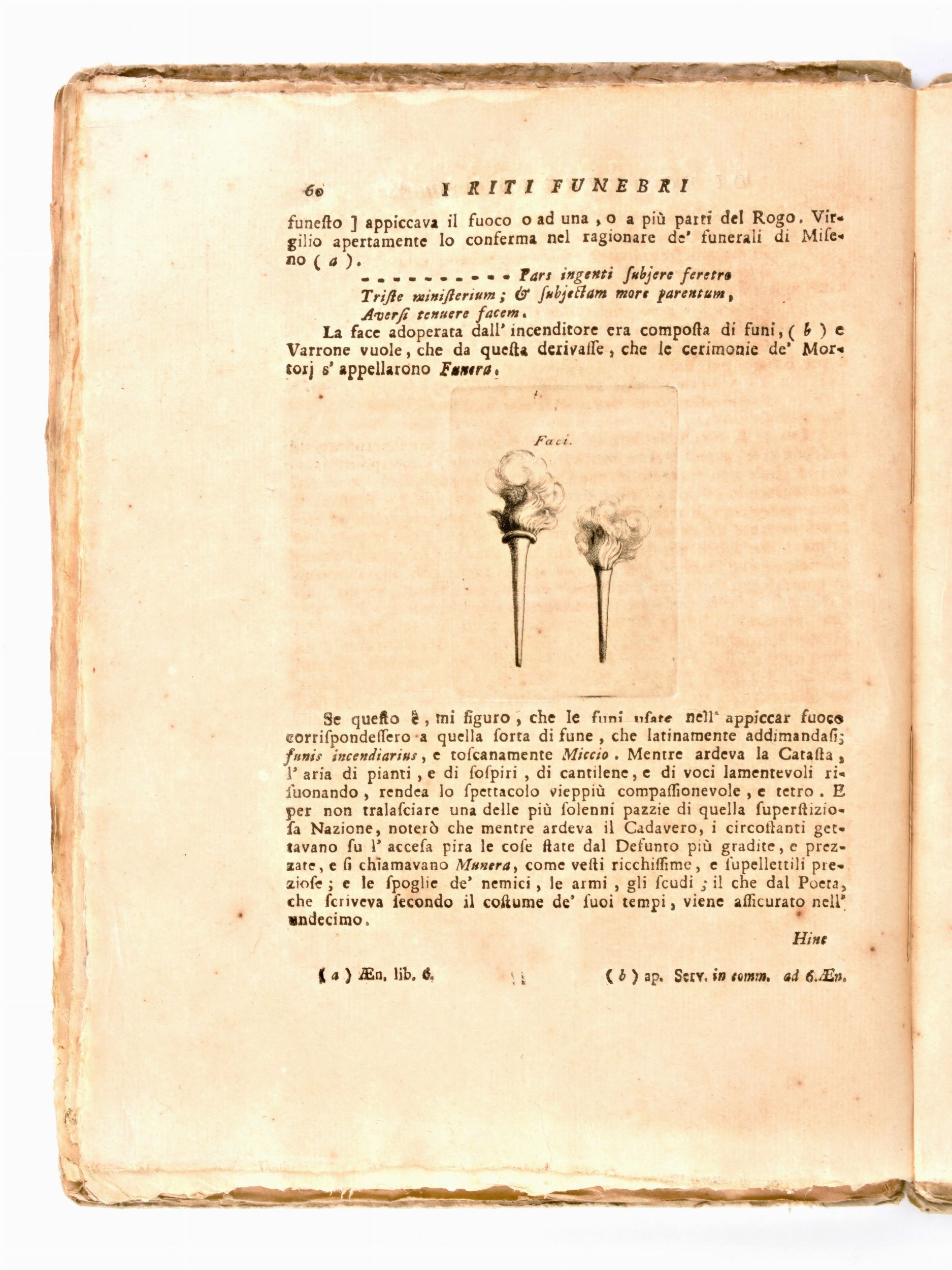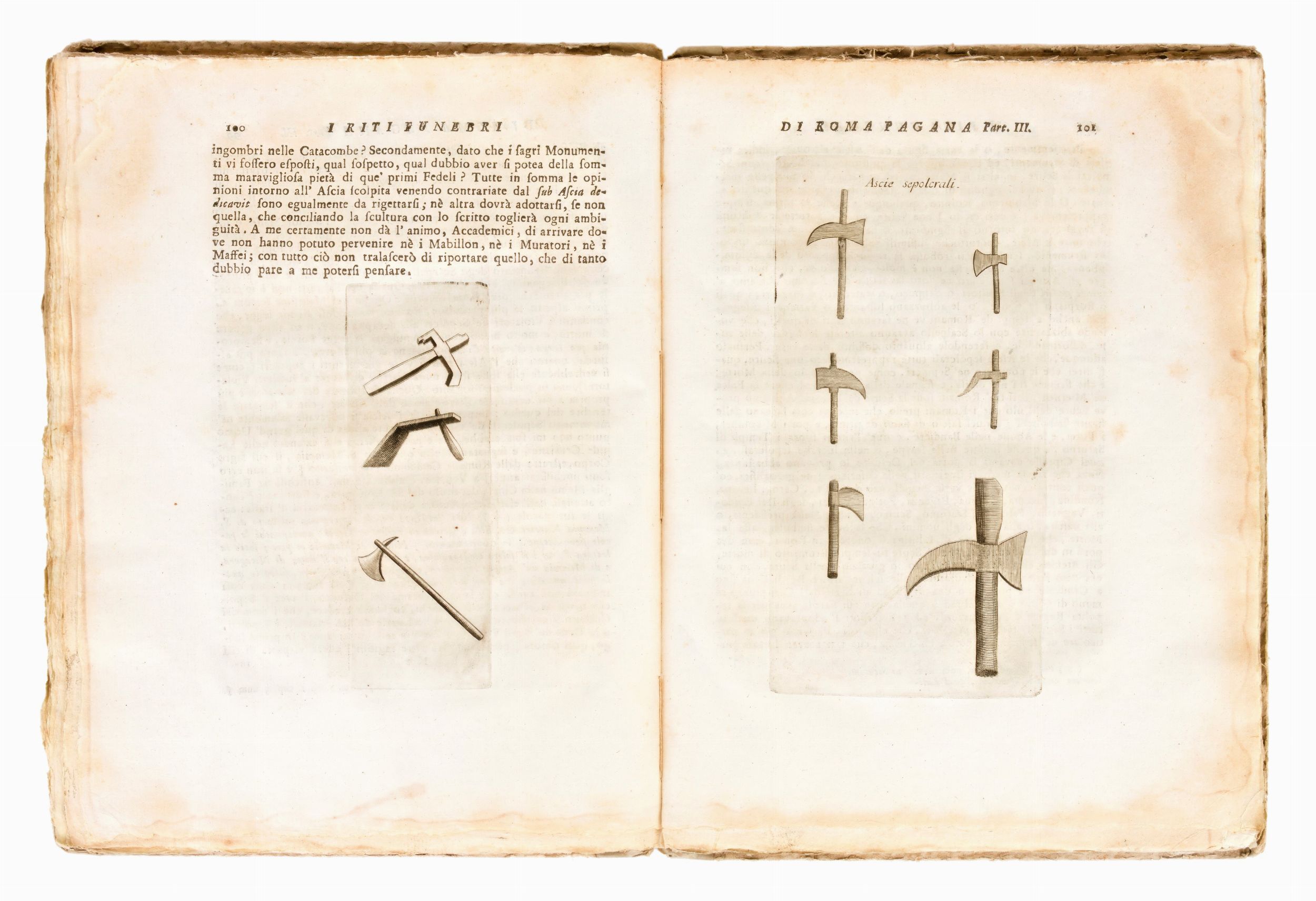 Formato in-4°, mm. 290x220, pp. xxiii, 160, xix. Completo. Antiporta calcografica di Pietro Perfetti. Cartonato coevo. Esemplare mancante del dorso con legatura allentata e cerniera anteriore parzialmente distaccata. Sporadiche fioriture. Antica edizione impressa in Lucca il 1758 per Filippo Maria Benedini, opera dello storico italiano Francesco Eugenio Guasco (1725-1798), con 11 figure incise in calcografia nel testo raffiguranti i vari strumenti per i riti degli antichi romani (ascia sepolcrale, urna cineraria, cattedra gestatoria, pira, faci, aspersorio e altro). Grande fregio xilografico al frontespizio. Testatine, capilettera e finalino in xilografia.