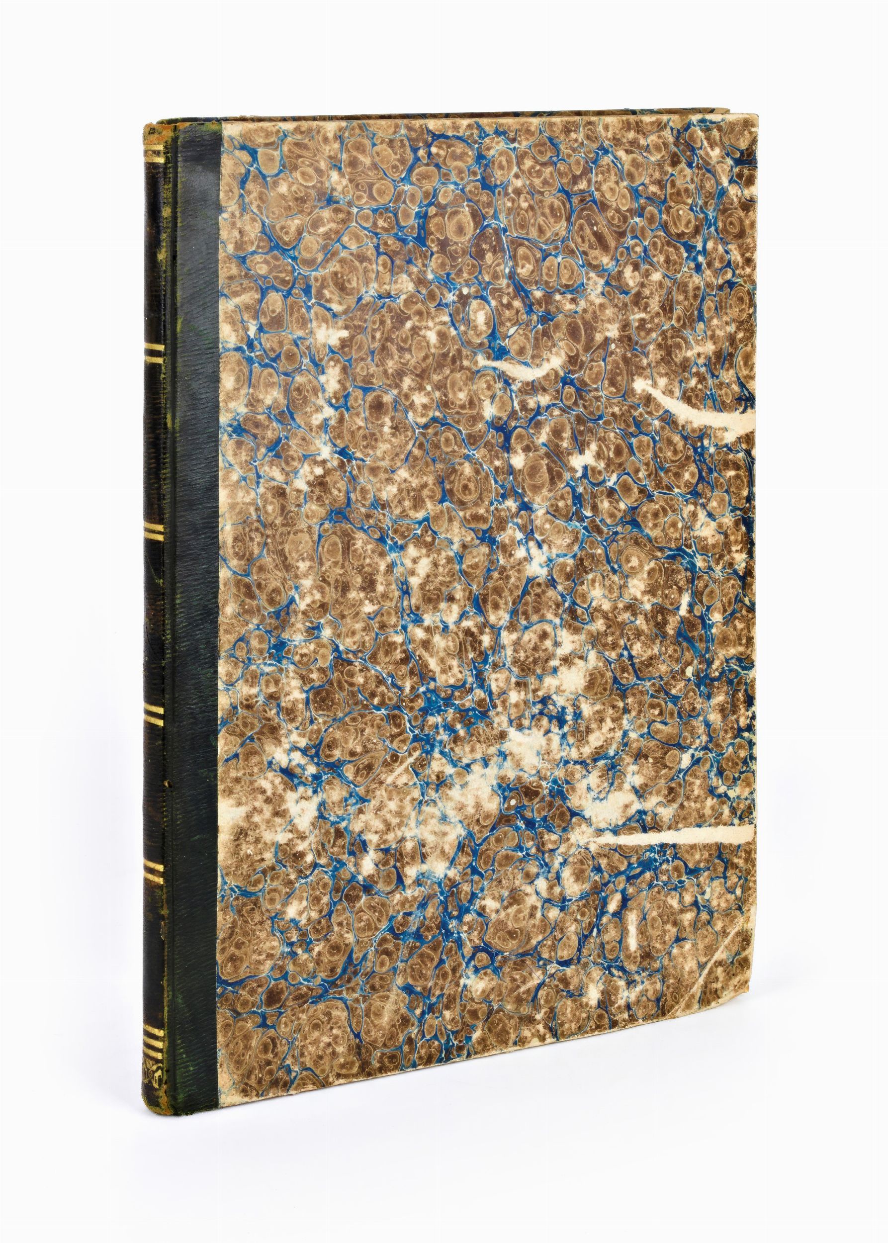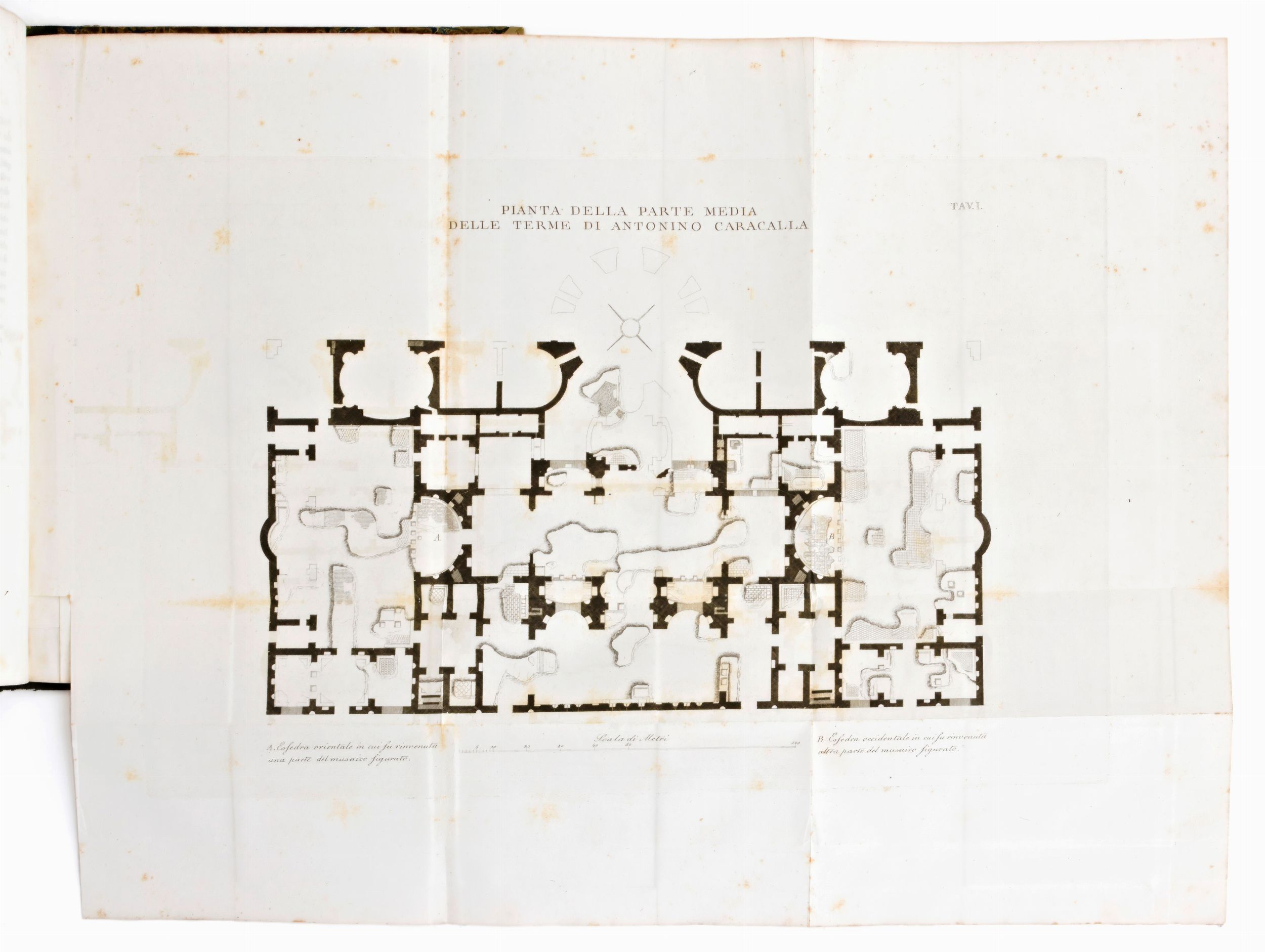 Formato in-4°, mm. 285x220, pp. (8), 89, (1). 2 cc. di tav. ripieg. Completo. Rilegatura coeva in mezza pelle con lineature in oro al dorso. Piatti rivestiti in carta antica marmorizzata. Ottimo esemplare, sporadiche fioriture e minimi segni del tempo. Antica edizione impressa in Roma il 1843 per Giuseppe e Francesco Salviucci, opera dell'archeologo e filologo Giampietro Secchi (1798-1856), con 2 grandi tavole ripiegate in fine (pianta delle terme di Antonino Caracalla & il mausoleo degli atleti).