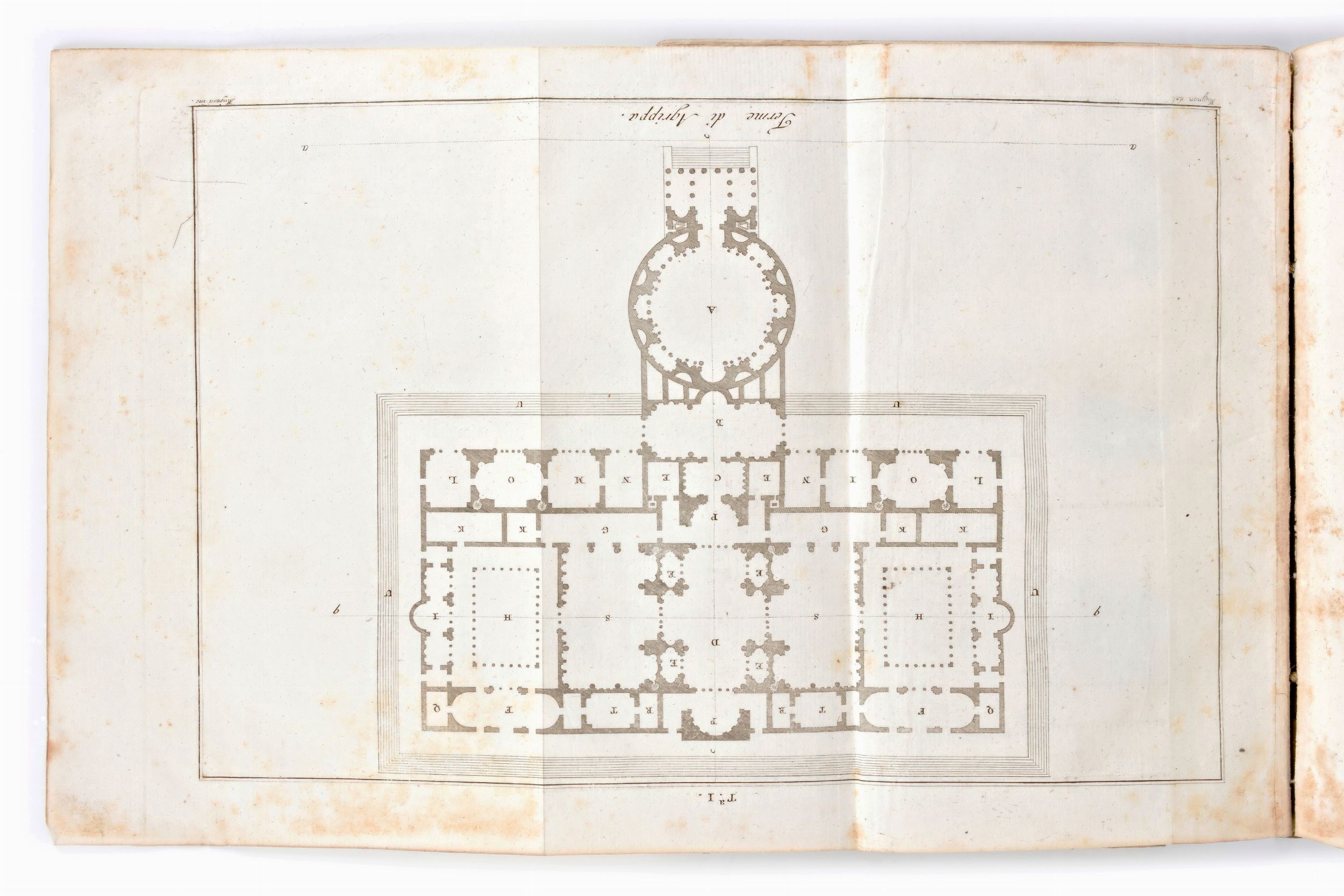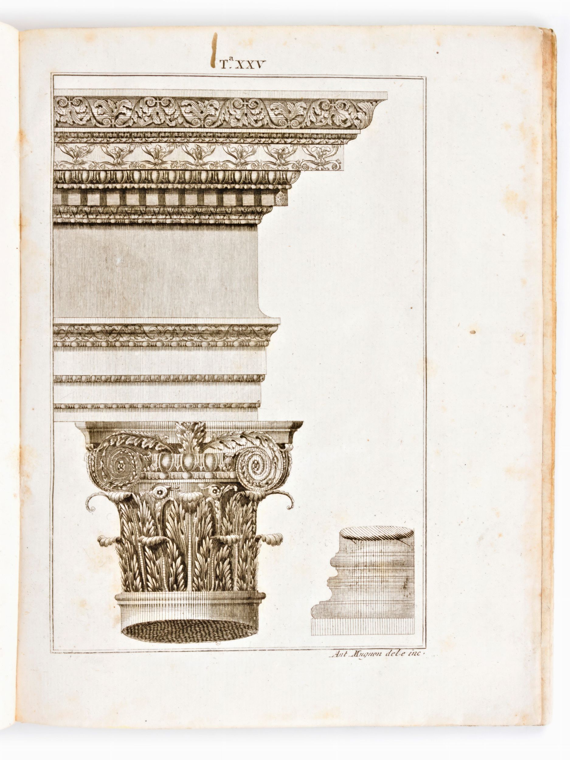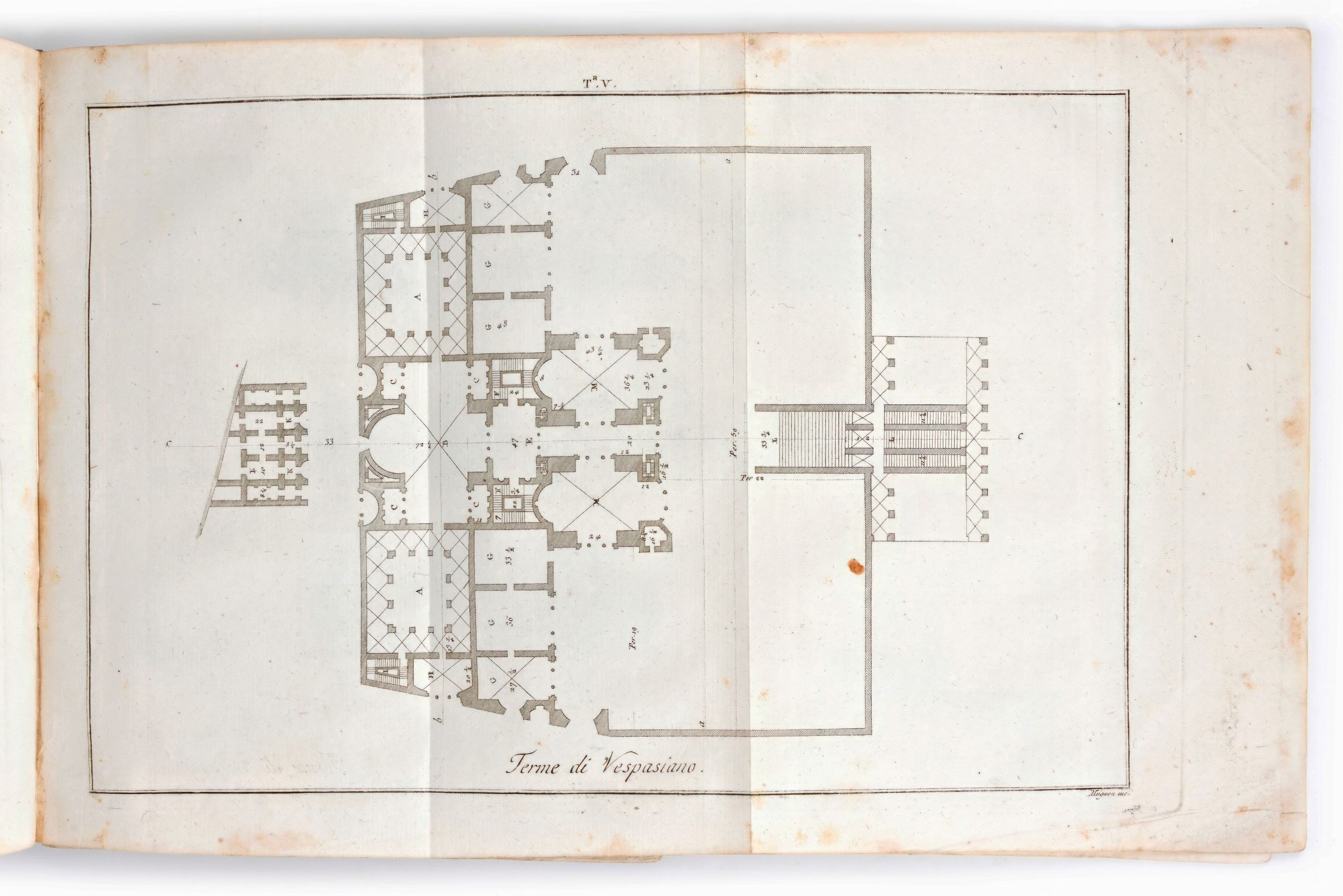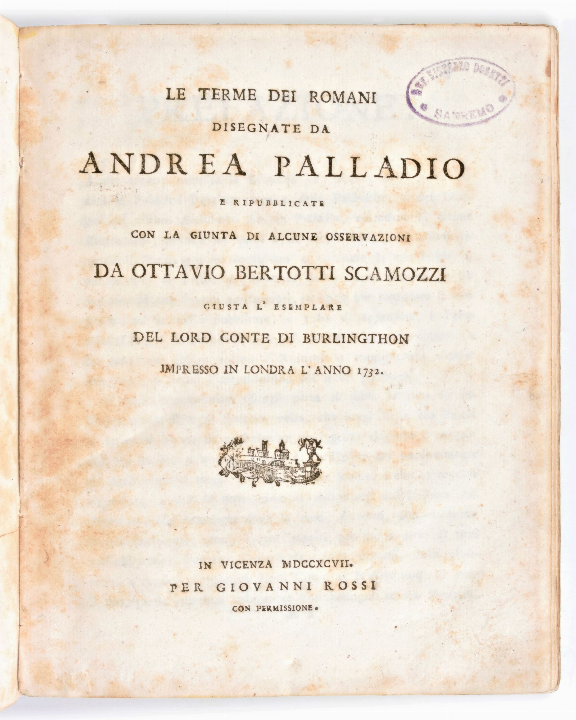 Formato in-4°, mm. 230x185, pp. 55, (1), 25 cc. di tav. in gran parte ripiegabili. Completo. Con 1 antiporta calcografica e fregio xilografico al frontespizio. Cartonato coevo flessibile con titoli manoscritti al piatto anteriore. Minimi difetti. Lievi fioriture alle carte. Strappo alla tavola XIX senza toccare l'incisione. Testo italiano. Osservazioni sulle terme dei romani (Agrippa, Nerone, Vespasiano, Tito, Antonino Caracalla, Diocleziano e Costantino) dell'architetto italiano Ottavio Bertotti Scamozzi (1719-1790), con le 25 tavole raffiguranti le varie terme romane tratte dai disegni del celebre architetto Andrea Palladio (1508-1580), incise da Antonio Mugnoni (XIX sec.).
