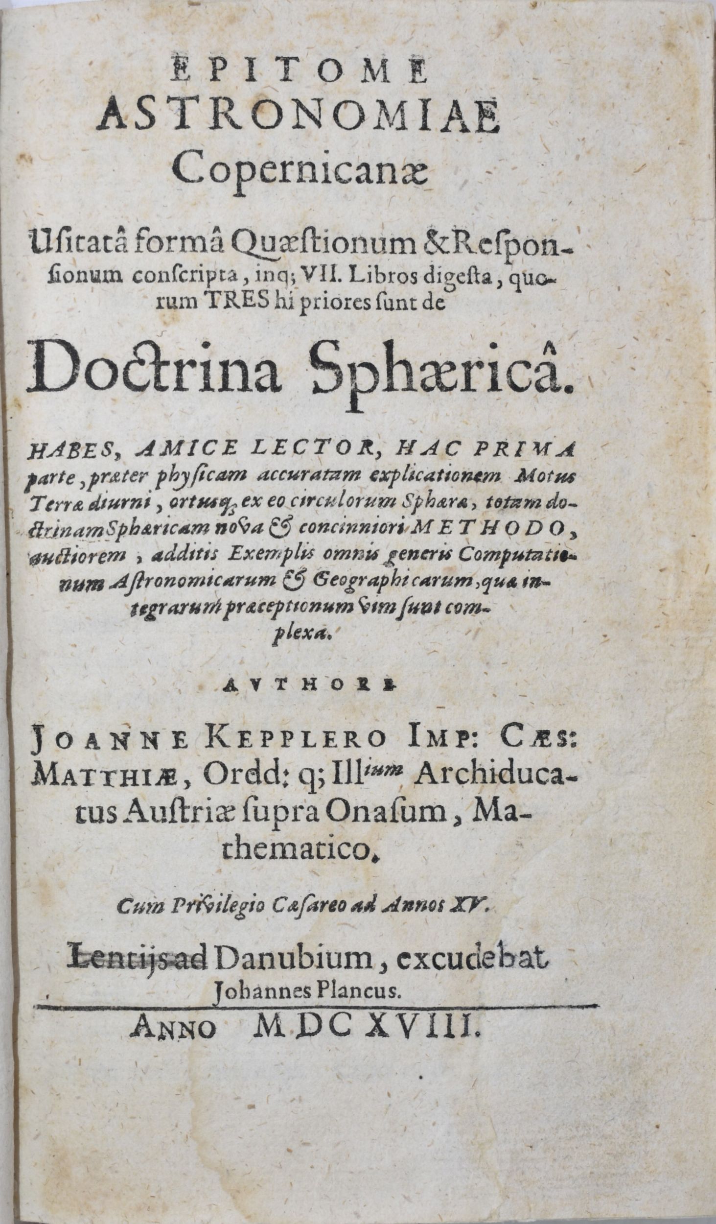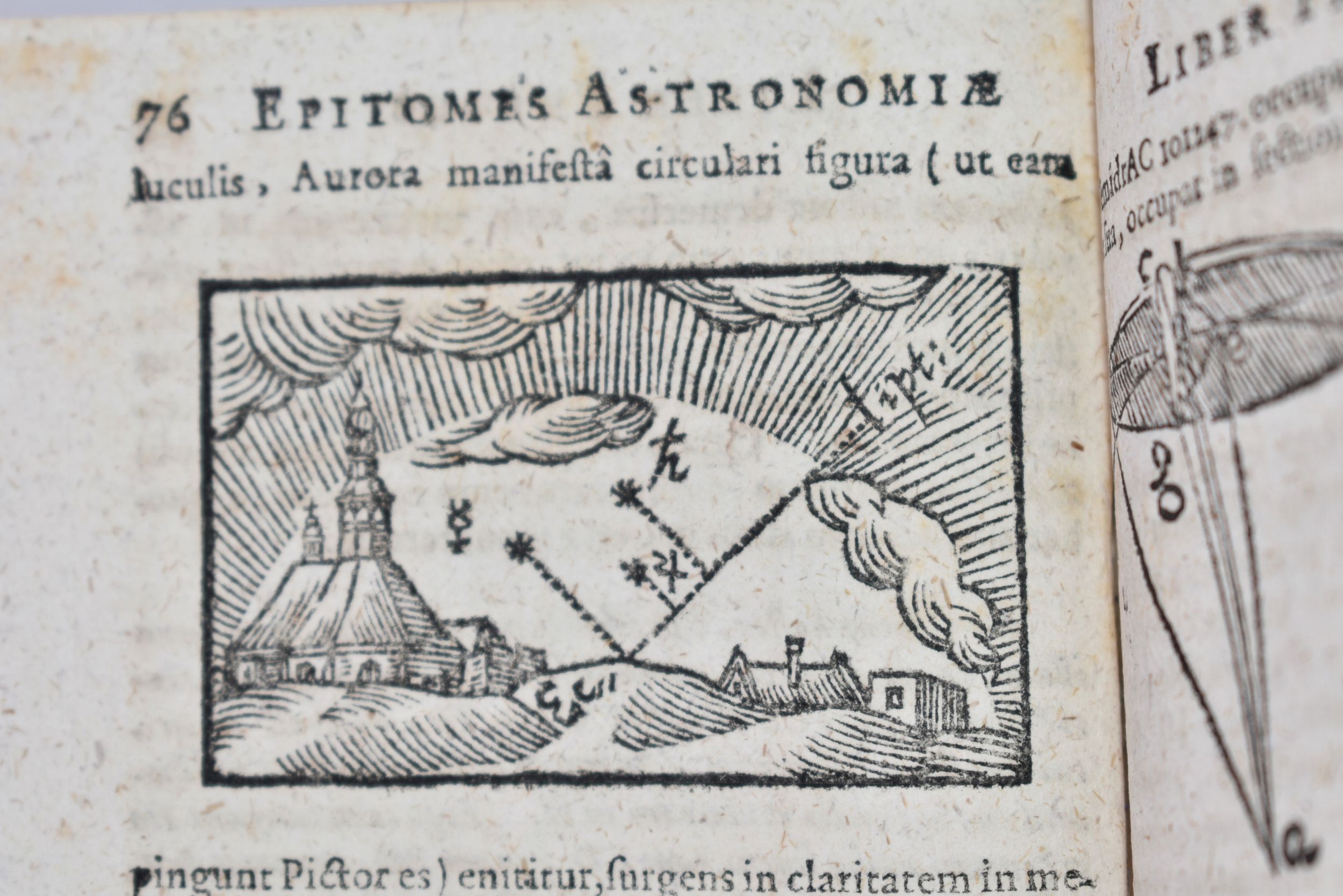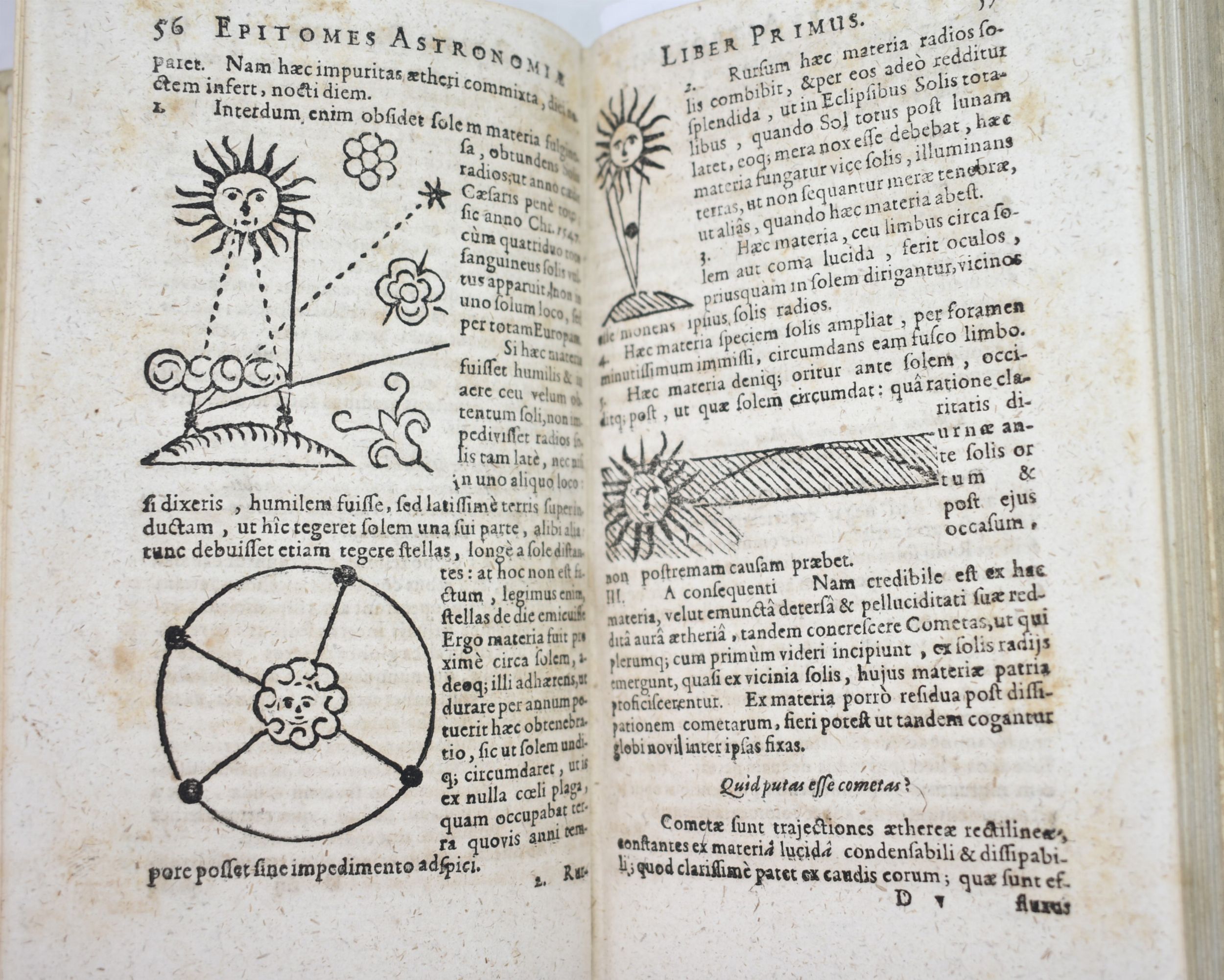 1 vol., in 8°, cm 16x10,5, p. [28], 417, (5). Rilegatura coeva in piena pergamena. Figurato scientifico Seicentesco con la Prima edizione (Linz, 1618) del primo volume (Libri I-III) della raccolta di studi sul sistema eliocentrico di Giovanni Keplero (1571-1630, astronomo e matematico tedesco). In essa K. illustrava il sistema copernicano sullo sfondo di una riorganizzazione della scienza astronomica, ora divisa in cinque ambiti: storico, ottico, fisico, aritmetico e meccanico. In ognuno di questi ricadevano rispettivamente le osservazioni, le ipotesi, le basi per le ipotesi, le tavole, i calcoli e gli strumenti. Diviso in sette libri, pubblicati tra il 1618 e il 1621, l'Epitome copre gran parte del pensiero precedente di Keplero, così come le sue posizioni successive su fisica, metafisica e archetipi. A causa del sostegno del libro all'eliocentrismo, il primo volume fu inserito nell'Indice dei libri proibiti il 28 febbraio 1619. Buon esemplare con lievi fioriture e bruniture, una lieve gora marginale; piccoli difetti come la rifilatura di 2 carte (**2 e **3) fino a toccare il testo; restauro all'angolo inferiore delle prime 8 carte. Cfr. Carli-Favaro 76, 92; Caspar 55, 66, 69; Cinti 60, 72, 67; Houzeau-Lancaster 11831; PMM 112; Sotheran I, 114; Treccani.
