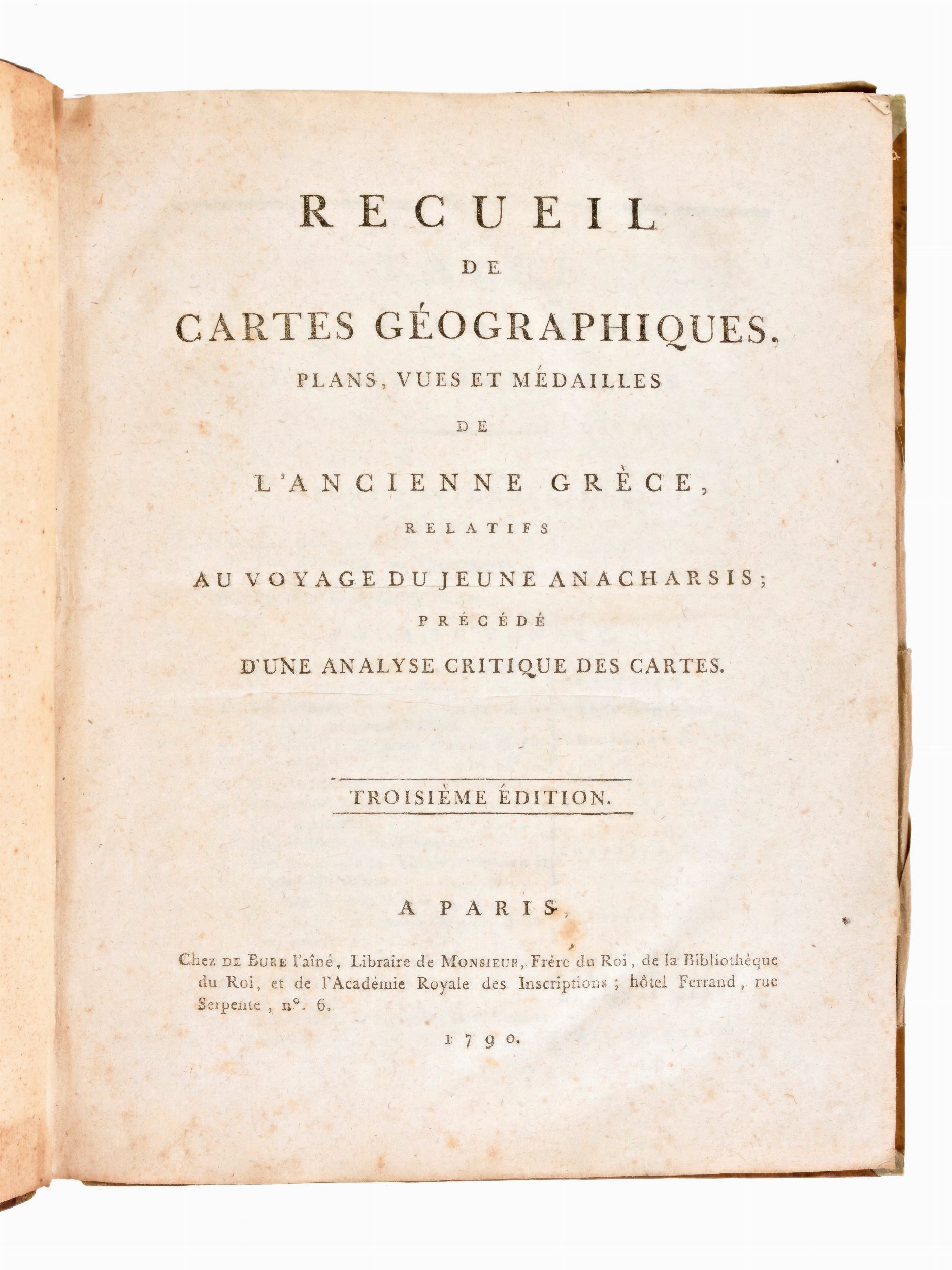 In-4°, mm. 245x195, pp. XXXII, 31 carte di tavole. Completo. Rilegatura coeva in mezza pelle, titoli e fregi in oro al dorso (con difetti e vecchio restauro). Lievi fioriture alle carte. Atlante geografico dell'opera più conosciuta dello scrittore francese Jean-Jacques Barthelemy 'Voyage de jeune Anarcharsis en Grece'. Terza edizione impressa in Parigi il 1790. Viaggio immaginario nell'antica Grecia con 31 tavole fuori testo raffiguranti mappe, i luoghi più memorabili (Termopili e altro) e i suoi dintorni (Mar Nero e altro), molte delle quali ripiegabili.